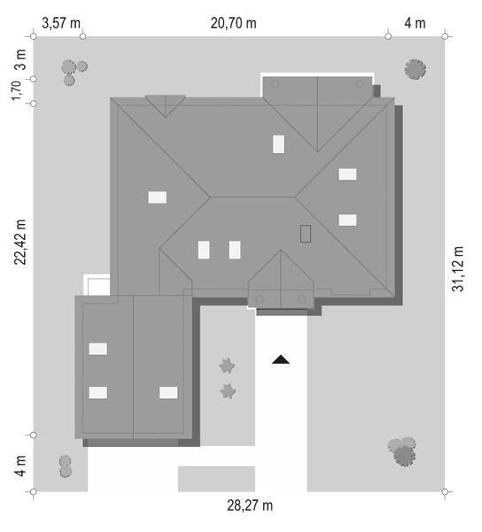 Projekt domu Tosia Duo to pomysł na niewielki bliźniak. Parterowy dom z użytkowym poddaszem przewidziany został do zabudowy ścianą boczną pojedynczego garażu w granicy. Można go też potraktować jako dom wolno stojący, ustawiony 3m lub mniej (w zależności od warunków zabudowy lub MPZP) od granicy. Bryła składa się z części mieszkalnej i garażowej (z kotłownią) z osobnymi, dwuspadowymi dachami, z kalenica równoległą do drogi dojazdowej. Części połączone są pod schodami przejściem ze schowkiem. Front zaakcentowano lukarną i obniżonym częściowo okapem. Na parterze, oprócz otwartego salonu, kuchni i dużej łazienki, znajduje się dodatkowy pokój – w sumie: wygodne mieszkanie dla dwojga. Cztery pokoje które wykończone mogą być w drugiej kolejności i stworzą w przyszłości wygodny, rodzinny dom. Główna sypialnia ma własną łazienkę i oddzielona jest ustronnie od reszty strefy nocnej różnicą poziomów. Projekt domu Tosia Duo wykończono oszczędnie - bez balkonów, proponując jedynie delikatne zróżnicowanie odcieni i faktur tynku.