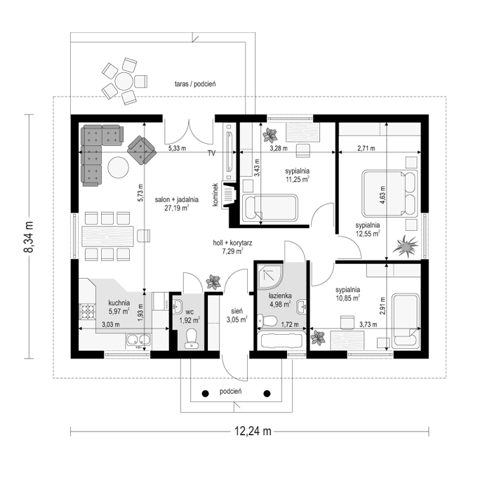 Projekt domu Jak Marzenie to niewielki parterowy dom o prostej, tradycyjnej bryle przywołującej wspomnienie polskiego dworku. Dom Jak Marzenie doskonale wpisuje się w wymagania 3- 4-osobowej rodziny. Wnętrze ukształtowane jest z podziałem na część dzienną - reprezentacyjną oraz nocną - intymną. Zapraszamy do zapoznania się ze wszystkimi projektami domów z tej serii: wersja podstawowa projekt domu Jak Marzenie, z dobudowanym garażem (projekt domu Jak Marzenie z garażem), z użytkowym poddaszem (projekt domu Jak Marzenie 2), poszerzoną (projekt domu Jak Marzenie 3). Wszystkie projekty domów dostępne są w odbiciu lustrzanym.