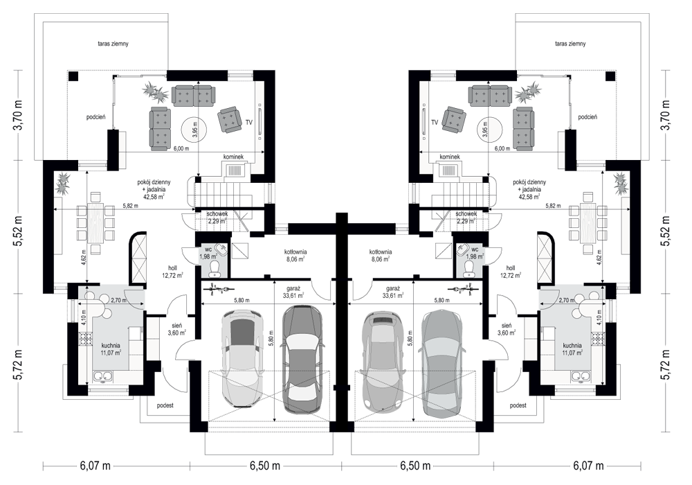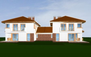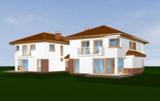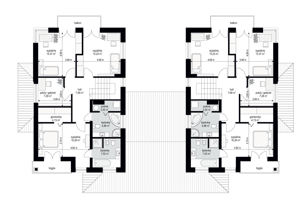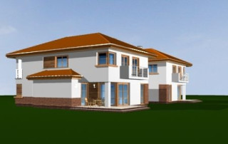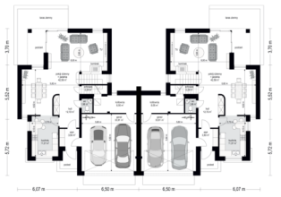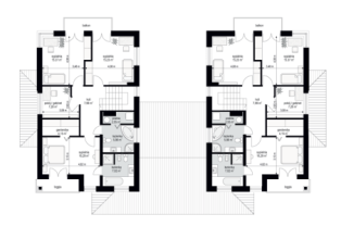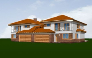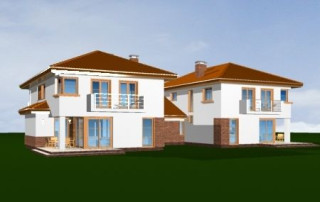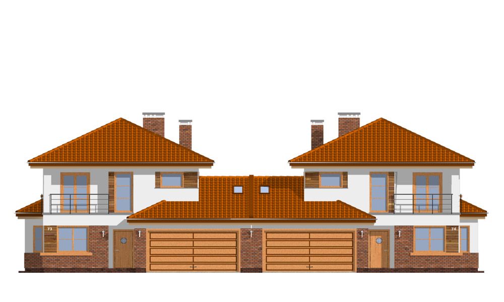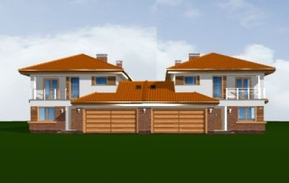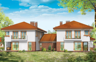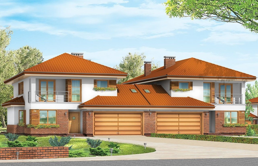 Projekt domu Kasjopea 2 został zaprojektowany jako budynek bliźniaczy. Dwie piętrowe połówki bliźniaka zostały połączone dwustanowiskowymi garażami przekrytymi dwuspadowym dachem. Dzięki temu obie części budynku są od siebie wizualnie oddzielone - nie stanowią jednej, zlewającej się bryły. Prosta forma prostopadłościanu została urozmaicona wystającymi wykuszami i daszkami, a także podcieniami, balkonami i loggią. Projekt domu Kasjopea 2 spodoba się Inwestorom lubiącym nowoczesną architekturę, lecz nieprzesadzoną - z odrobiną konserwatyzmu. We wnętrzu domu Kasjopea 2, na parterze zaprojektowano: część dzienną, składającą się z salonu z aneksem jadalnym, holu, częściowo otwartej kuchni, oraz pomieszczenia gospodarczego i garażu. Na piętrze zaplanowano z kolei apartament rodziców - z łazienką, garderobą i balkonem, oraz dwie sypialnie dzieci - z łazienką. Dodatkowo zmieścił się jeszcze jeden pokój, który może być wykorzystany jako gabinet do pracy, ewentualnie sypialnia gościnna lub duża garderoba. Zapraszamy do zapoznania się z pełną ofertą pracowni MG Projekt tej serii: projekt domu Kasjopea, projekt domu Kasjopea 3, projekt domu Kasjopea 4, projekt domu Kasjopea 5, projekt domu Kasjopea 6, projekt domu Kasjopea 7, projekt domu Kasjopea 7B, projekt domu Kasjopea 8. UWAGA! Koszty realizacji oraz dane techniczne dotyczą połowy bliźniaka.