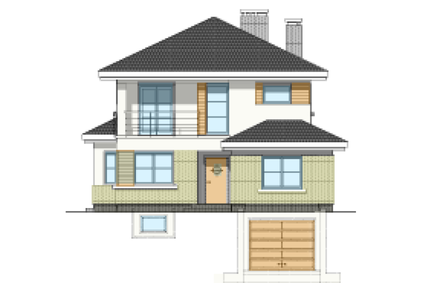 Wariant projektu z piwnicą, z jednostanowiskowym garażem w piwnicy, z pokojem zamiast garażu z oknem na froncie (tam gdzie była brama garażu), oraz ze zmienionym układem pomieszczeń na parterze i piętrze i ze zmienioną funkcją pomieszczeń.