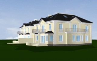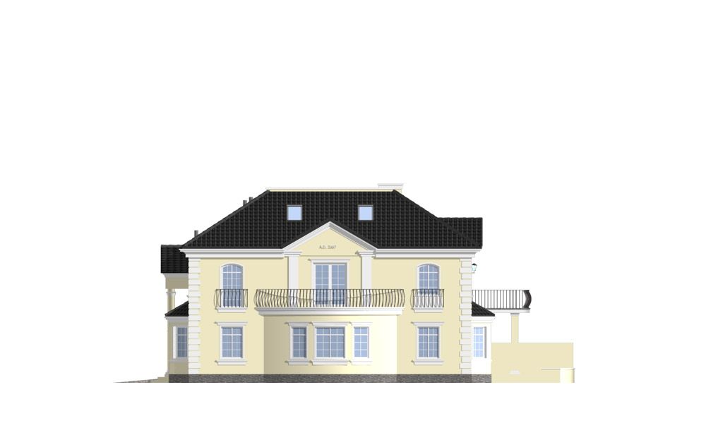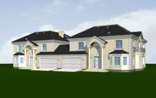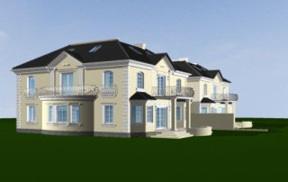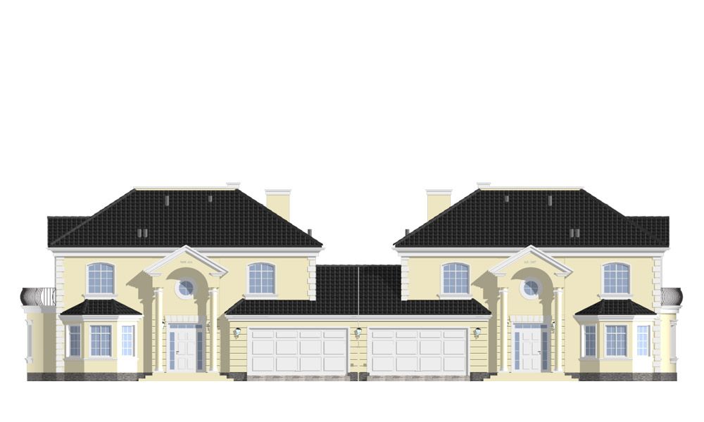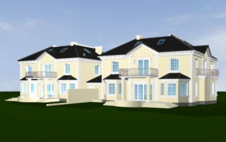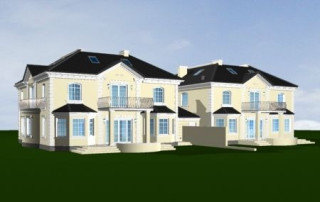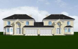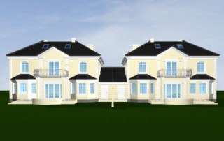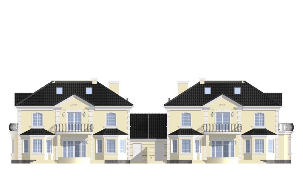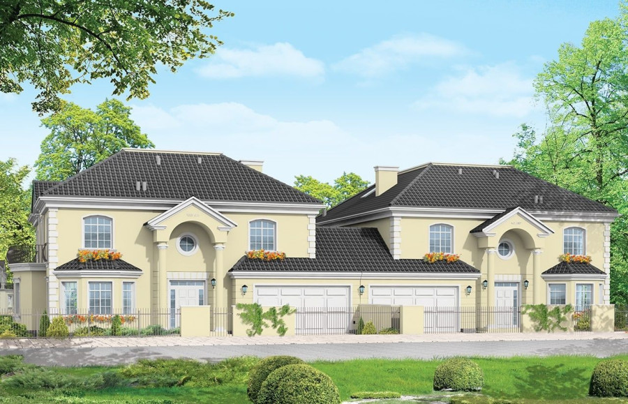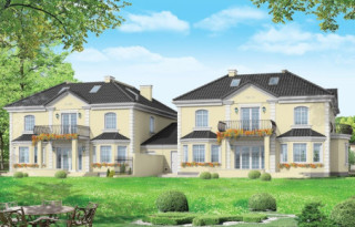 Projekt domu Komorów to rzadko spotykane połączenie klasycznej willowej architektury z formą budynku bliźniaczego. Jednak w dobie wysokich cen atrakcyjnych gruntów, może okazać się ciekawe. Ponadto w czasie gdy wielu Inwestorów decyduje się na budowę dwóch domów - aby po sprzedaży jednego zrekompensować część kosztów budowy. Budowa budynków bliźniaczych staje się coraz modniejsza. Dom Komorów wzorowany jest na miejskich willach okresu międzywojennego, częściowo też na amerykańskich rezydencjach dla wyższej klasy średniej. Piętrowa bryła każdej z połówek zbudowana jest na planie zbliżonym do kwadratu. Projekty domów połączone zostały garażami. Wykusze, balkony, fronton wejściowy na kolumnach i taras ogrodowy - wszystkie te elementy ozdabiają bryłę domu i tworzą harmonijną całość. Wnętrze projektu domu Komorów rozwiązano wokół centralnego holu z pięknymi zabiegowymi schodami z otwarciem przestrzennym stropu. Na parterze mieści się obszerny salon, jadalnia i kuchnia, oraz dodatkowo gabinet - biblioteka, mogący być również sypialnią gościnną. W części gospodarczej dostępnej z szatni przy przedsionku znajduje się wygodny dwustanowiskowy garaż, oraz dwa pomieszczenia gospodarcze. Na piętrze zaprojektowano apartament rodziców z garderobą i własnym tarasem z widokiem na ogród, oraz trzy sypialnie z łazienką z holu. Hol został powiększony o aneks wieczorny - również z tarasem. W razie potrzeby z holu można wygrodzić dodatkowy pokój. Projekt domu Komorów jest dostępny również w odbiciu lustrzanym. Zapraszam! UWAGA! Koszty realizacji oraz dane techniczne dotyczą połowy bliźniaka.
