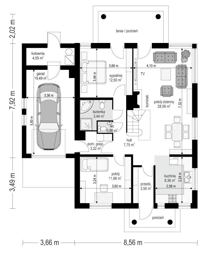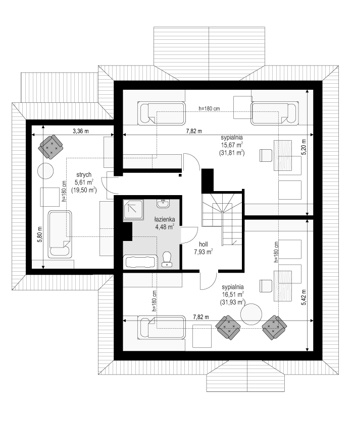 Projekt domu Mazurek 3 to Wersja wariantowa projektu domu Mazurek 2. Budynek zaprojektowano dla rodziny 4- 5-osobowej. Dom, w stosunku do swojego pierwowzoru został powiększony o pomieszczenie kotłowni za garażem, dzięki czemu można pomyśleć nie tylko o ogrzewaniu gazowym, ale również o kotle na paliwo stałe. Dotychczasowa kotłownia spełnia rolę pomieszczenia gospodarczego. Na dole prócz salonu znajdują się dwa dodatkowe pokoje, na poddaszu jest możliwość zaadaptowania strychu nad garażem na dodatkową trzecią sypialnię. Projekt domu Mazurek 3 dostępny jest też w odbiciu lustrzanym.