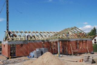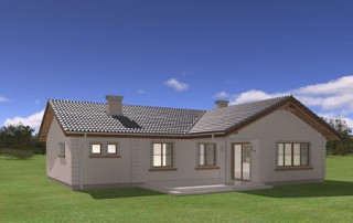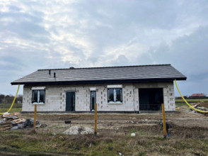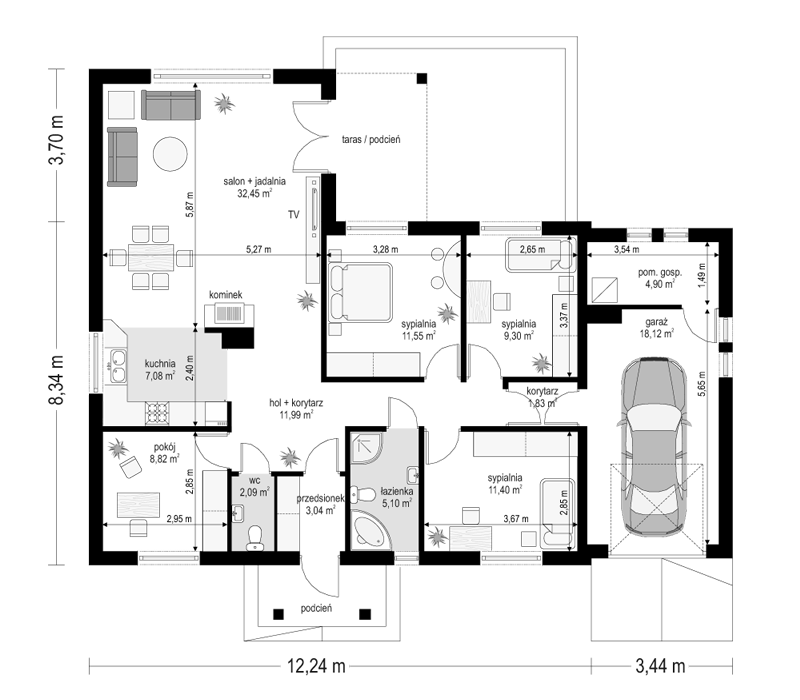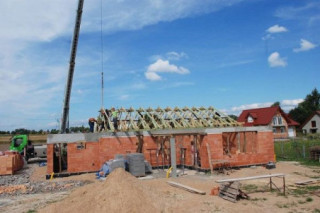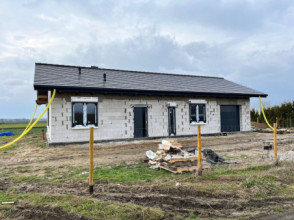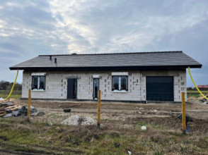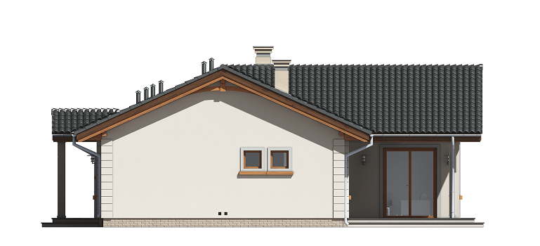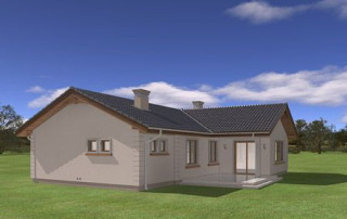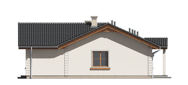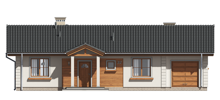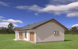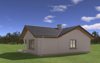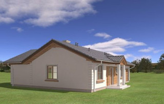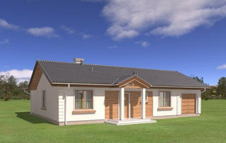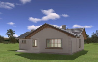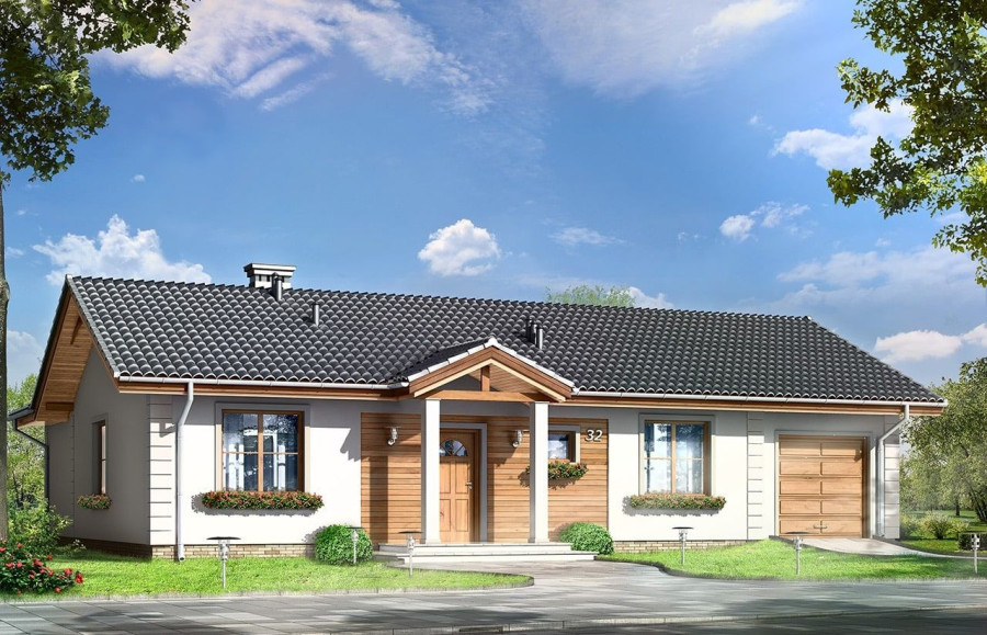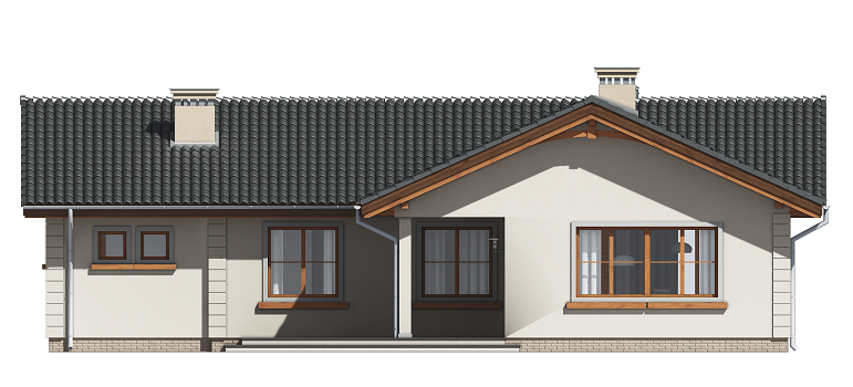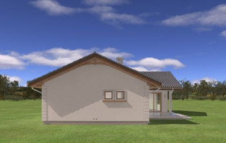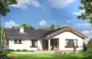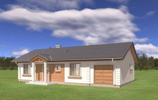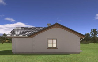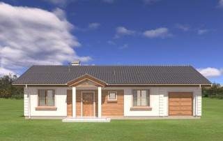 Projekt domu Miluś to powiększona wersja wariantowa projektu Promyk. Projekt zaplanowano jako parterowy, przekryty dwuspadowymi łagodnymi dachami, z dobudowanym garażem. Projekt domu Miluś architektura i wnętrze Wystający poza obrys domu Miluś salon tworząc od strony ogrodu plan litery "L", dający poczucie intymności i izolacji tarasu od sąsiadów. Architektonicznie projekt Miluś to typowy bungalow z łagodnym dachem, szerokimi elewacjami - frontową i ogrodową, oraz dużymi oknami. Dodatki urozmaicające bryłę Milusia, jak: fragmenty ścian obłożone drewnem, ganek wejściowy na kolumnach, czy podcień ogrodowy, stanowiący zadaszenie nad częścią tarasu, współtworzą udaną i harmonijną całość. Wnętrze domu Miluś podzielono na jednoprzestrzenną część dzienną, oraz na część z sypialniami. W projekcie domku salon, z centralnie usytuowanym ozdobnym kominkiem, oraz dużą ścianą "telewizyjną", łączy się z półotwartą kuchnią i holem. W Milusiu zaprojektowano również trzy sypialnie z łazienką, oraz dodatkowy pokój, mogący służyć jako gabinet, lub np. sypialnia gościnna. Przy dobudowanym garażu zaplanowano pomieszczenie gospodarcze - kotłownię. Na niewielkiej przestrzeni udało się zaprojektować pięciopokojowe mieszkanie, z zapleczem technicznym i garażem. Autorska pracownia architektoniczna MG Projekt dysponuje także projektem domu w odbiciu lustrzanym.