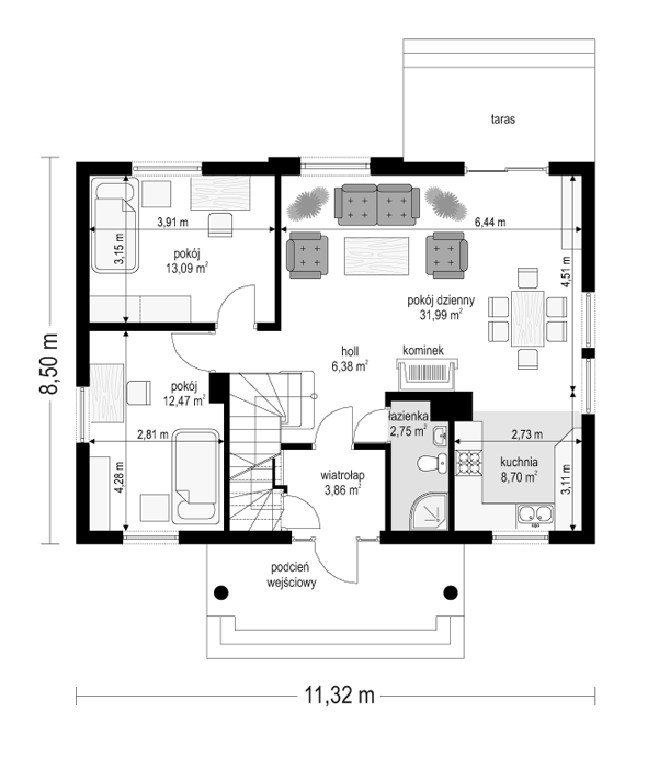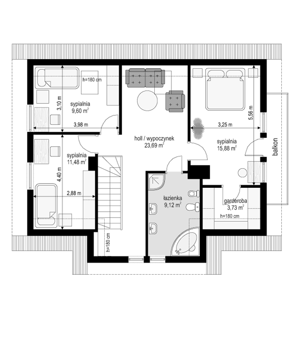 Projekt domu Miodowe Lata jest idealny dla dużej rodziny. Okazały, solidny dom z salonem i pięcioma pokojami zaprojektowano z myślą o 4- 6-osobowej rodzinie. Dom Miodowe Lata jest częściowo podpiwniczony - w piwnicy umieszczono kotłownię. Sylwetka domu prosta, bezpretensjonalna, ozdobiona dużym frontonem na słupach nad wejściem. Na poddaszu można wygospodarować dodatkowy pokój z dużego holu, lub urządzić tam bawialnię dla dzieci. Sypialnia rodziców ma własną garderobę i balkon. Projekt domu Miodowe Lata dostępny jest w odbiciu lustrzanym.