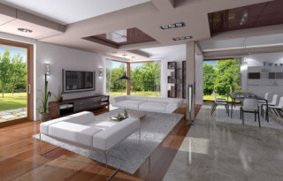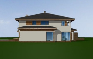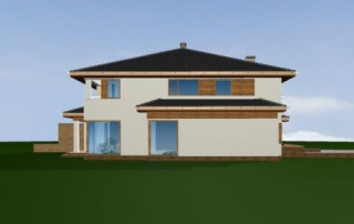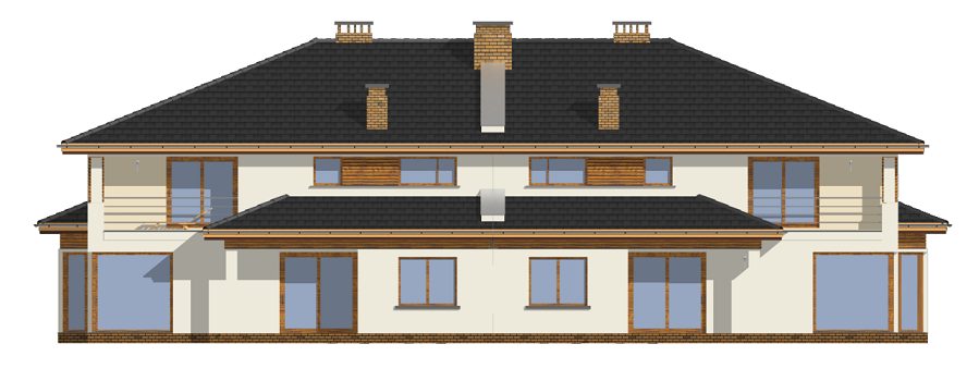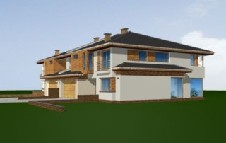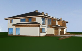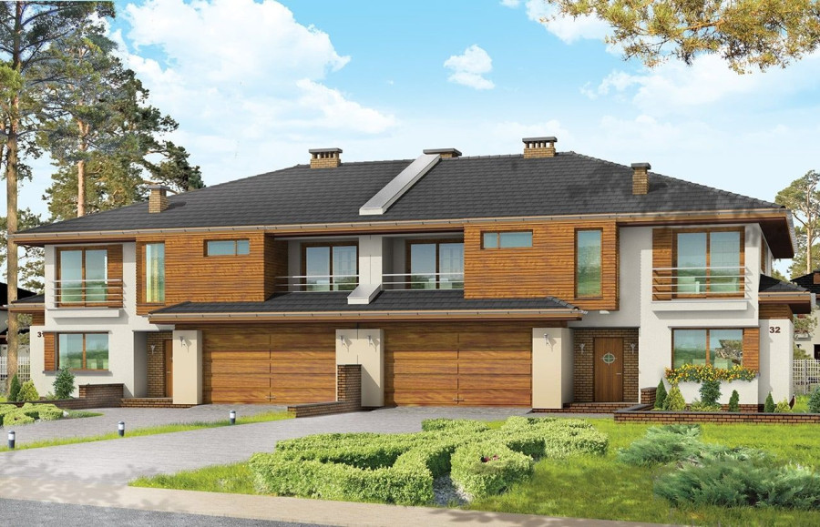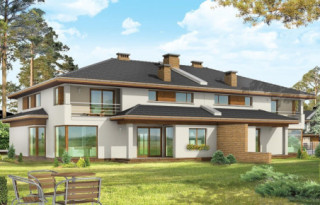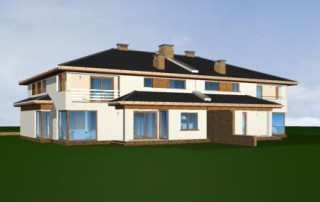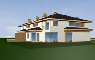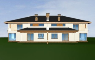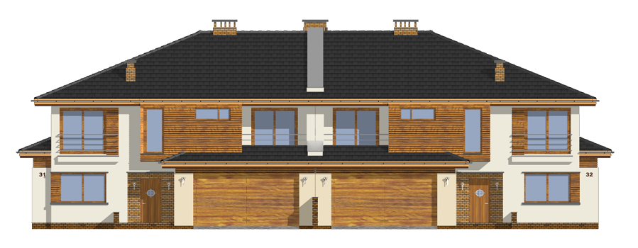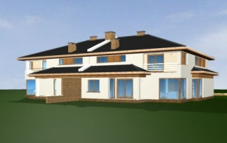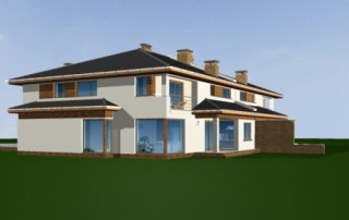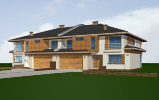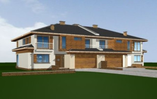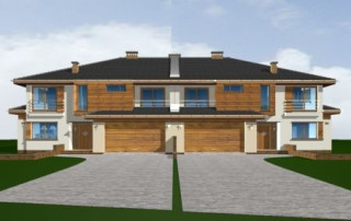 Projekt domu Neptun to duży, nowoczesny dom w zabudowie bliźniaczej. Każda połówka przewidziana została dla rodziny 4- 6-osobowej. Dom Neptun jest piętrowym budynkiem, przekrytym dachem wielospadowym. Budynek zaprojektowano używając nowoczesnych form i detali, jednak całości nadano spokojny, stonowany charakter. Bryła domu Neptun jest bardzo reprezentacyjna, pasująca do willowego otoczenia. Funkcję budynku podzielono na część dzienną z zapleczem gospodarczo-garażowym na parterze i sypialnie na piętrze. Na parterze zaprojektowano przestrzeń dzienną składającą się z salonu, jadalni i holu. W salonie na uwagę zasługują wbudowany we wnękę kominek, duże atrakcyjne przeszklenia na ogród, oraz reprezentacyjne schody na piętro. Kuchnia ze spiżarką została dyskretnie odgrodzona od jadalni. Z salonu szerokimi podwójnymi drzwiami dostajemy się do dużego gabinetu - biblioteki. Na parterze domu Neptun zaplanowano duży, dwustanowiskowy garaż. Kotłownię i wc z aneksem przewidzianą na pralnię lub schowek porządkowy. Na piętrze umieszczono apartament rodziców z pokojem kąpielowym i garderobą oraz balkonem - loggią z widokiem na ogród, oraz trzy wygodne sypialnie dzieci z garderobami lub szafami wbudowanymi i łazienką z holu. Pracownia posiada projekt domu Neptun w odbiciu lustrzanym. Zapraszamy! UWAGA! Koszty realizacji oraz dane techniczne dotyczą połowy bliźniaka.
