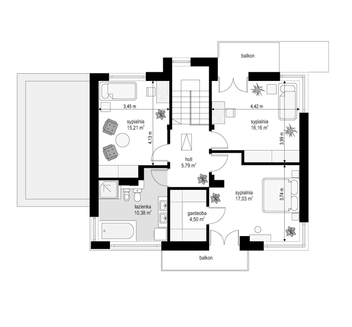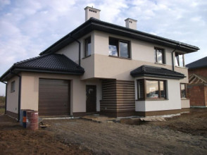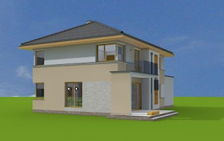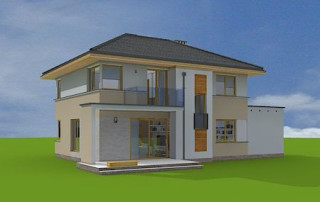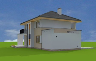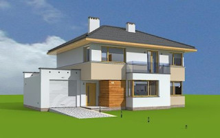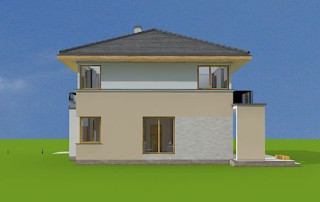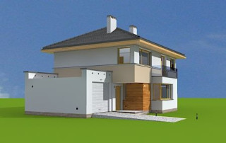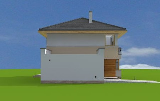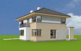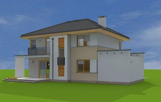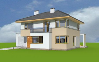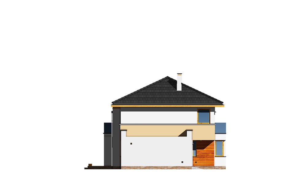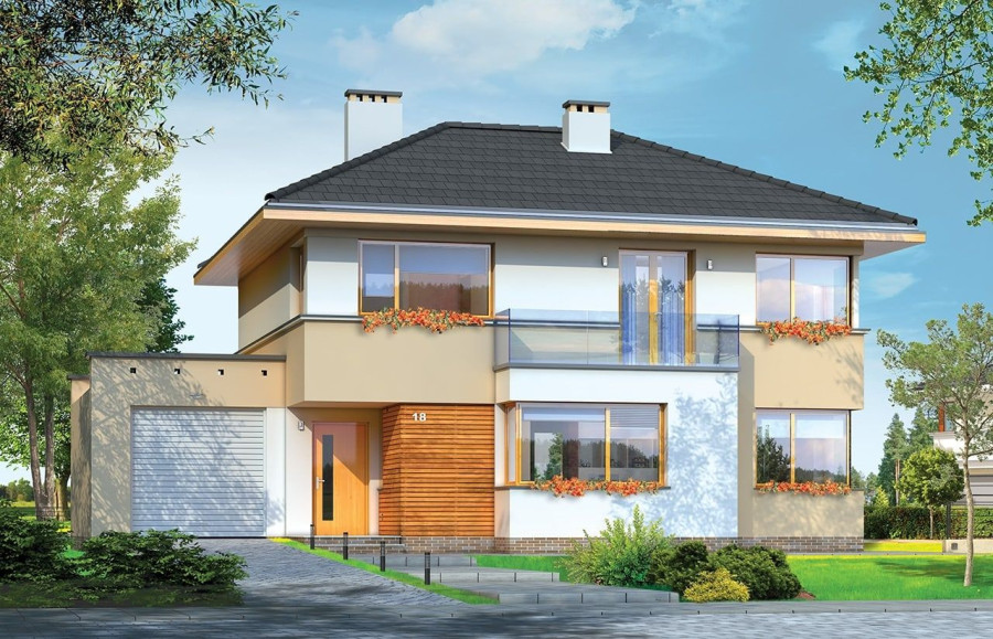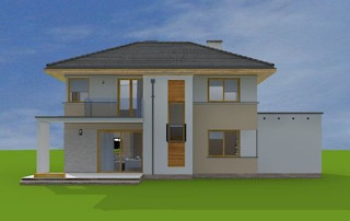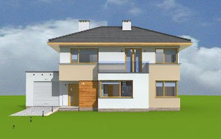 Projekt domu Nieduży to propozycja niewielkiego, piętrowego domu jednorodzinnego, przeznaczonego dla 4- 5-osobowej rodziny. Założeniem projektanta było połączenie nowoczesnej, ale spokojnej stylistyki, maksymalnej prostoty konstrukcji i funkcjonalności wnętrza domu. Z uwagi na problemy z pozwoleniami na budowę w naszym kraju na domy z płaskimi dachami pracownia zdecydowała się na zwieńczenie bryły czterospadowym dachem. Jednak bryła na tym nie traci - wręcz zyskuje. Dom Nieduży od zewnątrz stwarza wrażenie większego niż rzeczywiście jest. Monotonię kostki przerwano dodając do elewacji kubiczne wykusze, podcienie, balkony, duże przeszklenia - szczególnie od strony ogrodu, narożne okna, czy podział ścian na dwa poziome pasy w kontrastującej kolorystyce. Wnętrze domu podzielono na przestrzeń dzienną na parterze i pokoje sypialne na piętrze. Na dole zaprojektowano połączone wnętrze salonu, jadalni, holu i częściowo otwartej kuchni. Dodatkowo przy wejściu umieszczono garaż, oraz pokój, mogący służyć jako gabinet, biuro lub dodatkowa sypialnia. Kocioł c.o. umieszczono w łazience na parterze, a pod częścią schodów zaplanowano praktyczny schowek porządkowy. Na piętrze miejsce znalazły trzy duże sypialnie - w tym sypialnia rodziców z własną garderobą i balkonem, oraz bardzo przestronna łazienka. Pracownia posiada także projekt domu Nieduży w odbiciu lustrzanym.