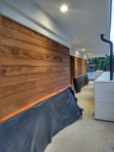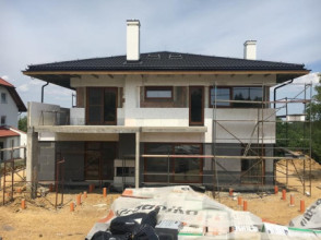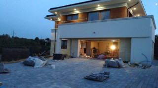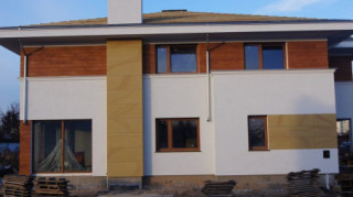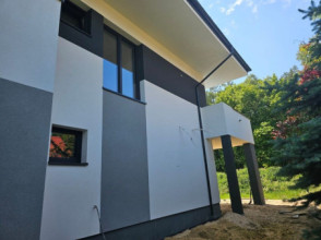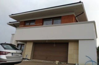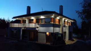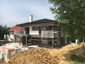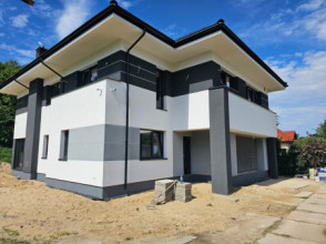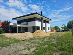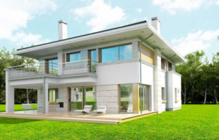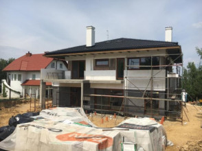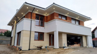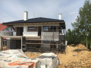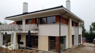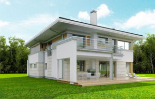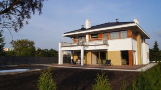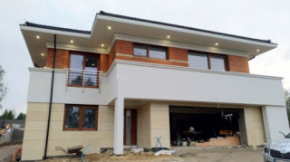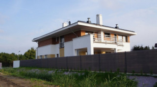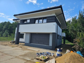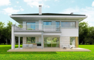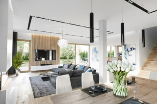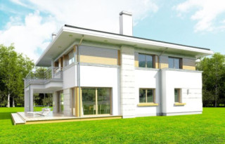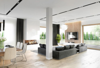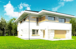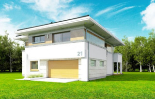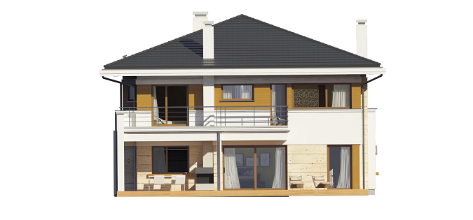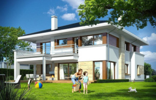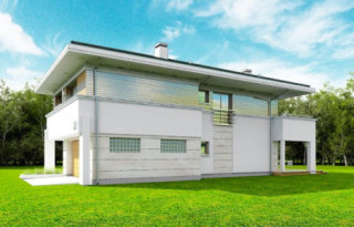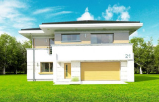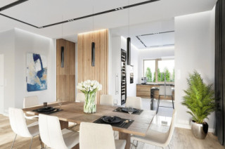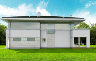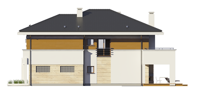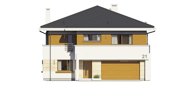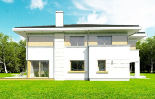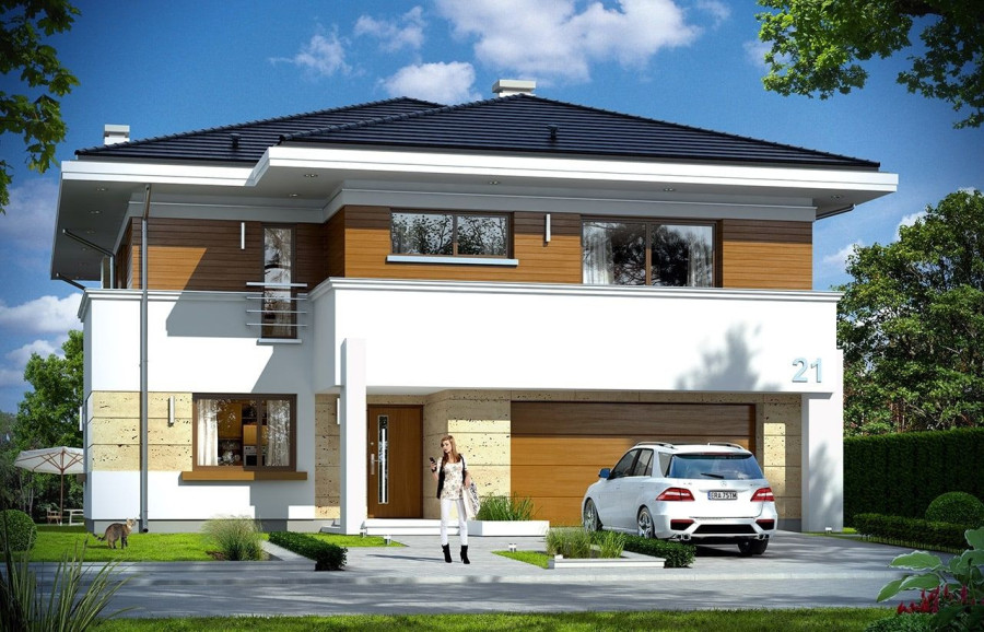Projekt domu Oceanic to luksusowy piętrowy dom dla 4- 6-osobowej rodziny o nowoczesnej zwartej bryle, z ciekawym detalem i materiałami wykończeniowymi. Piętrowa prostokątna sylwetka została tutaj nakryta łagodnym czterospadowym dachem, z szerokimi okapami. Elewacja podzielona została na poziome pasy: na parterze – część murowana i obłożona kamieniem, na piętrze - okładzina drewniana ścian. Dom dzięki dużym przeszkleniom, właściwym proporcjom elewacji, ma w sobie lekkość. Szczególnie elewacja ogrodowa jest bardzo otwarta. Front domu jest nieco bardziej masywny, solidny, z mniejszymi oknami, aby w naturalny sposób swoistą barierę dla wnętrza od ulicy. Wnętrze domu ma maksymalnie prosty program i układ funkcjonalny. Na parterze mieści się duża część dzienna, z salonem, jadalnią, obszerną kuchnią i holem ze schodami. Dodatkowo na parterze mamy ładny podwójny garaż, kotłownię i pokój - gabinet / sypialnię gościnną. Na piętrze natomiast mieści się aż pięć pokoi - bardzo rzadko spotykana rzecz w tej wielkości domach. Pięć pokoi, pralnia suszarnia, dwie łazienki i centralna duża garderoba. Oczywiście podział pomieszczeń można inaczej zaplanować, ale najważniejszy jest fakt, że piętro jest bardzo pojemne. Projekt domu Oceanic to propozycja dla wszystkich tych przyszłych właścicieli domu, którzy cenią sonie nowoczesny wygląd domu, nie lubią poddaszy ze skosami, potrzebują mieć sporo przestrzeni ukrytych w pokojach - poza salonem. Jednocześnie jak na swoją wielkość dom ma na tyle zwartą bryłę i prostą konstrukcję, że koszt jego realizacji nie jest bardzo wysoki. Projekt domu Oceanic został zaprojektowany jako energooszczędny, z dużą ilością dobrych ociepleń, oraz z wentylacją mechaniczną z rekuperacją.