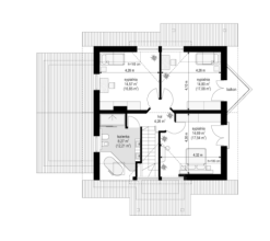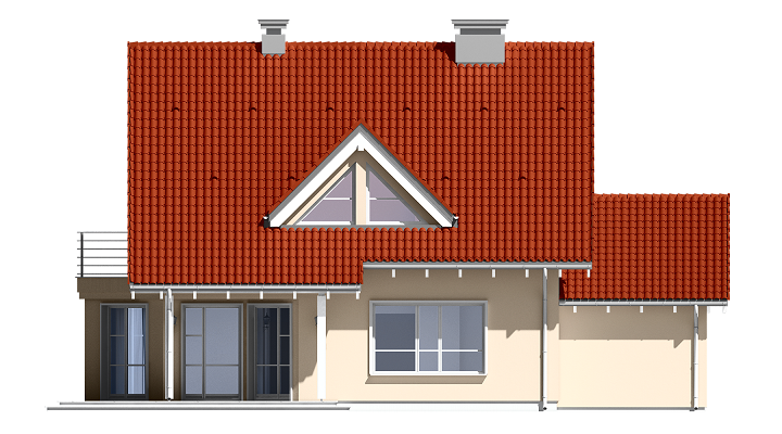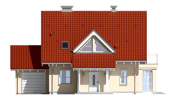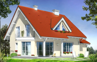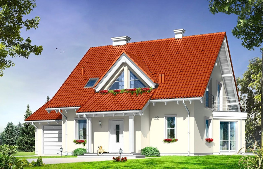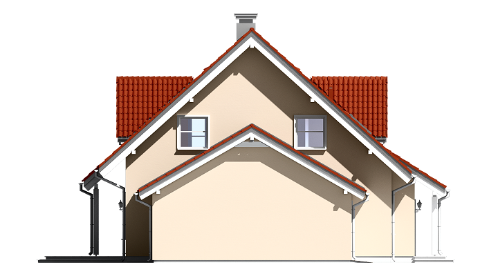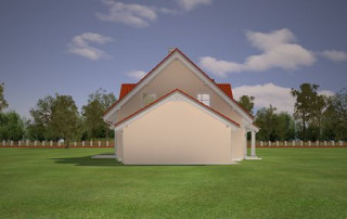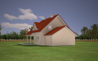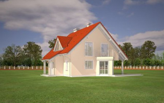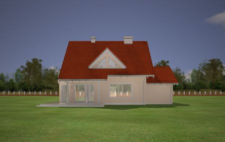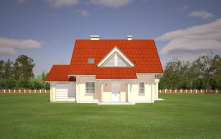 Projekt domu Orlik to uroczy domek jednorodzinny, przeznaczony dla 4- 5-osobowej rodziny. Orlik jest domkiem jest parterowym z poddaszem użytkowym, zbudowanym na planie zbliżonym do kwadratu. Przekryty został dwuspadowym dachem z lukarnami. Ma dobudowany garaż również przekryty dwuspadowym dachem. Prostą tradycyjną bryłę budynku wzbogacają dodatki: przedsionek wejściowy z zadaszonym podcieniem wspartym na dwóch kolumnach, trójkątne lukarny z dużymi oknami od frontu i od ogrodu, ciekawy wykusz jadalni połączony z podcieniem salonu i częściowym zadaszeniem tarasu ogrodowego. Całość bryły, jej detale, materiały i kolorystyka tworzą udaną pasującą do siebie całość. Wnętrze Orlika podzielono na część dzienną i gospodarczą na parterze i sypialnie na poddaszu. Jednoprzestrzenne wnętrze połączonych: salonu, jadalni i holu z ładnymi schodami tworzą część dzienną domowników. Zalicza się do niej trochę odcięta od salonu kuchnia ze spiżarnią (można ją łatwo połączyć z jadalnią wykonując otwór w ścianie). Na parterze zaprojektowano dodatkowy pokój – sypialnię lub gabinet, łazienkę, kotłownię i garaż. Na poddaszu umieszczono trzy sypialnie – dwie równej wielkości dziecięce, oraz większą sypialnię rodziców. W pokojach zaprojektowano miejsca na duże szafy wbudowane. Pokoje są na tyle proporcjonalne, że można spróbować również wydzielić z nich garderoby. Wnętrze poddasza dopełnia piękna, dobrze oświetlona łazienka. Nad poddaszem mieszkańcy mają jeszcze do dyspozycji spory strych – bardzo przydatny w niewielkim domu. Projekt domu Orlik jest świetną propozycją na nieduży, energooszczędny, tani w budowie i utrzymaniu dom, w którym jest wystarczająco dużo przestrzeni i pomieszczeń dla rodziny z dwójką-trójką dzieci. Pracownia posiada wersję projektu domu Orlik w odbiciu lustrzanym.