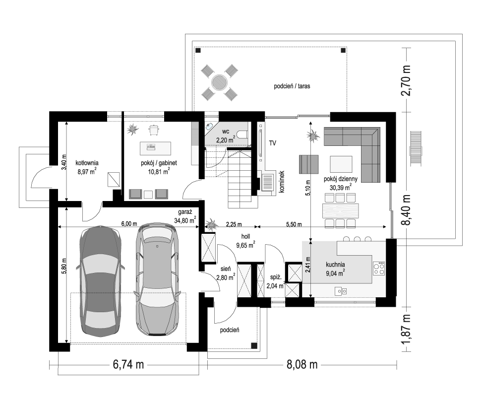 Wariant z projektu z powiększoną kotłownią, zamiana okna na drzwi w kotłowni.