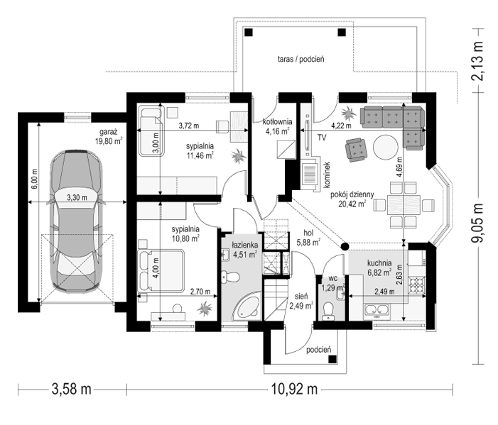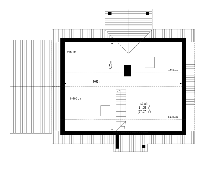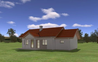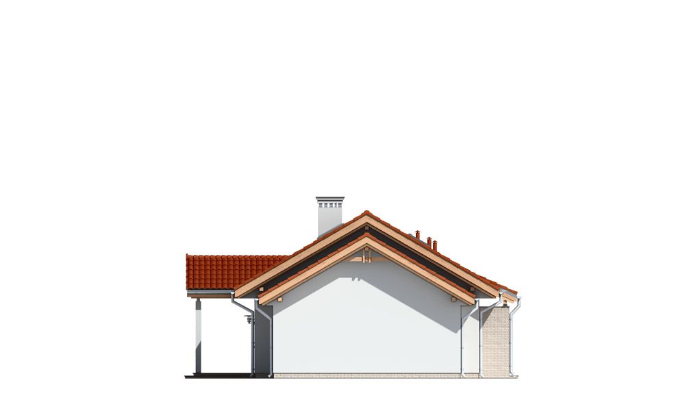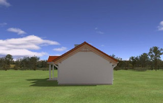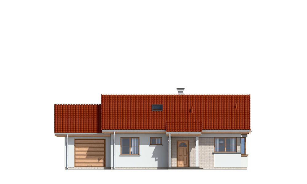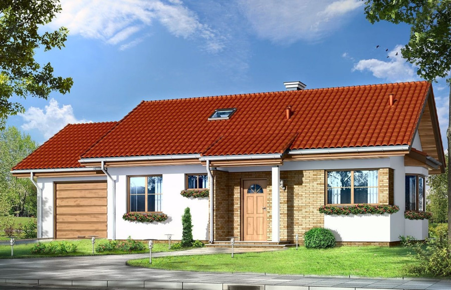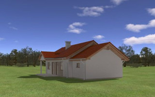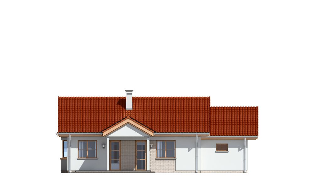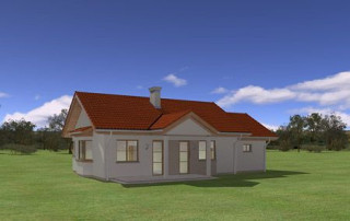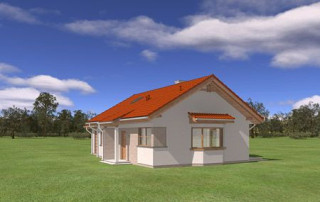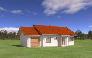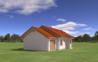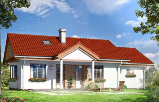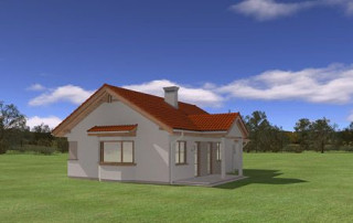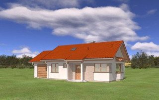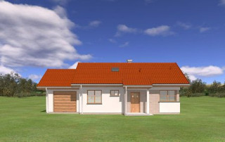 Projekt domu Perełka 2 to domek bliźniaczo podobny do popularnego projektu Klejnot. Tym razem dom przykryty jest dwuspadowym prostym dachem. Domek jest parterowy, przeznaczony dla 3- 4-osobowej rodziny. Bryła budynku zbudowana została na planie prostokąta z dobudowanym garażem. Wzbogacono ją gankiem wejściowym, wykuszem w elewacji bocznej i ogrodową werandą, będącą zadaszeniem nad częścią tarasu. Duże ładne przeszklenia z podziałami, fragmenty elewacji obłożone płytkami klinkierowymi, nowoczesne materiały - wszystkie te elementy tworzą udaną całość z tradycyjnym kształtem domu. Wnętrze domu Perełka 2 to wygodne trzypokojowe mieszkanie z zapleczem technicznym. Reprezentacyjny salon z kominkiem łączy się przestrzennie z kuchnią i holem. Dwie sypialnie z łazienką znajdują się w przeciwnym skrzydle domu, w części nocnej. Schodami prowadzącymi z przedsionka dostajemy się na strych - w projekcie domu Perełka 2 nieużytkowy, który jednak można łatwo zaadaptować na dodatkowe poddasze użytkowe. Z boku domu dobudowano jednostanowiskowy garaż. Pracownia dysponuje także wariantem projektu domu Perełka 2 w odbiciu lustrzanym, oraz wersją bez garażu, tańszą w budowie (Projekt domu Perełka).