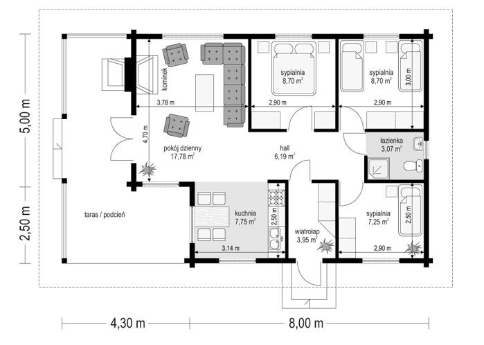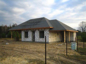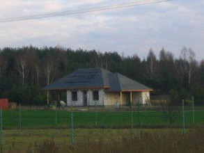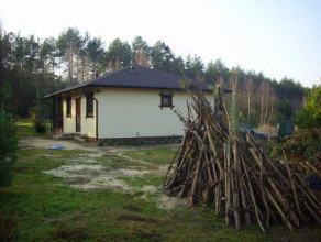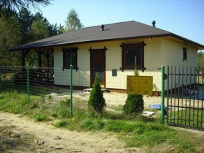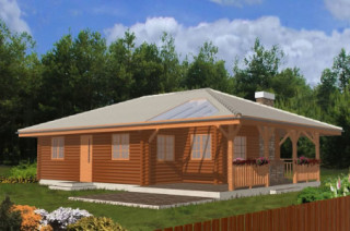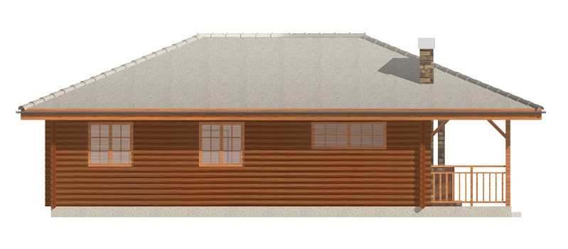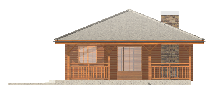 Projekt domu Pogodny Drewniany to mały i ekonomiczny domek z bali drewnianych. Parterowy, niepodpiwniczony, o prostej i wyważonej bryle, dla czteroosobowej rodziny. Może być traktowany zarówno jako dom jednorodzinny, jak i letniskowy. Budynek posiada czytelny i funkcjonalny rozkład pomieszczeń oraz wyraźny ich podział na strefy: dzienną i nocną, co daje poczucie komfortu i wygody. Obszerny zadaszony taras zapewnia możliwość korzystania z zewnętrznego kominka (grilla) bez względu na warunki atmosferyczne. Kominek, zlokalizowany w salonie umożliwia rozprowadzenie ciepła po całym domu. Projekt domu Pogodny Drewniany dostępny jest w technologii drewnianej oraz murowanej. Pracownia dysponuje także wersją z poddaszem użytkowym. Każdy z wariantów projektu dostępny jest ponadto w odbiciu lustrzanym. Komplet czterech egzemplarzy zawiera: projekt architektury domu, konstrukcji oraz schematy instalacji wewnętrznych. Na prośbę Inwestora, do projektu dołączamy zgodę na dokonanie zmian według życzenia Klienta.
