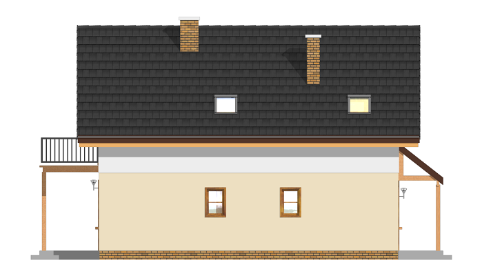 Projekt domu Praktyczny A to niewielki domek jednorodzinny dla czteroosobowej rodziny. Budynek parterowy z poddaszem użytkowym. Projekt Praktyczny przedstawiamy w dwóch wersjach wariantowych - jako dom jednorodzinny dla jednej rodziny, oraz jako dom dwulokalowy - z wydzielonymi dwoma mieszkaniami na parterze i na poddaszu. Projekt domu Praktyczny A architektura i wnętrze Projekt domku Praktyczny A to budynek jednorodzinny. Bryła budynku Praktyczny jest bardzo prosta, na pewno nie będzie trudna w budowie. Dobrze dobrane proporcje domu Praktyczny A i detale architektoniczne powodują, że wygląd zewnętrzny budynku jest bardzo atrakcyjny. W projekcie domku Praktyczny A na parterze zaplanowano pokój dzienny połączony przestrzennie z holem ze schodami i z kuchnią, oraz pomieszczenie gospodarcze i dodatkowy pokój - gabinet lub sypialnię gościnną. Na piętrze Praktycznego zaprojektowano trzy sypialnie, w tym jedna jako apartament rodziców z własną łazienką i garderobą, oraz ogrodowym tarasem. Gotowy projekt domu jednorodzinnego Praktyczny A, pomimo niedużej powierzchni mieści w sobie wiele pomieszczeń i rozwiązania funkcjonalne spotykane w dużych domach. Siłą projektu domku Praktyczny A jest jego prostota i maksymalnie klarowny układ funkcjonalny. Projekt Praktyczny A można zamówić w wersji odbicia lustrzanego, oraz jako dom dwulokalowy - projekt domu Praktyczny B.