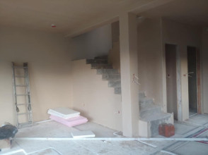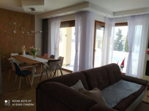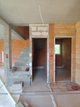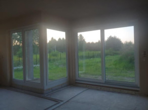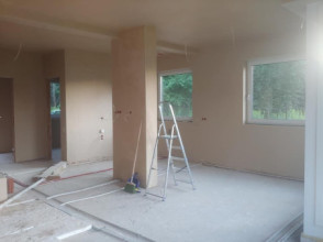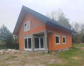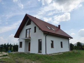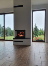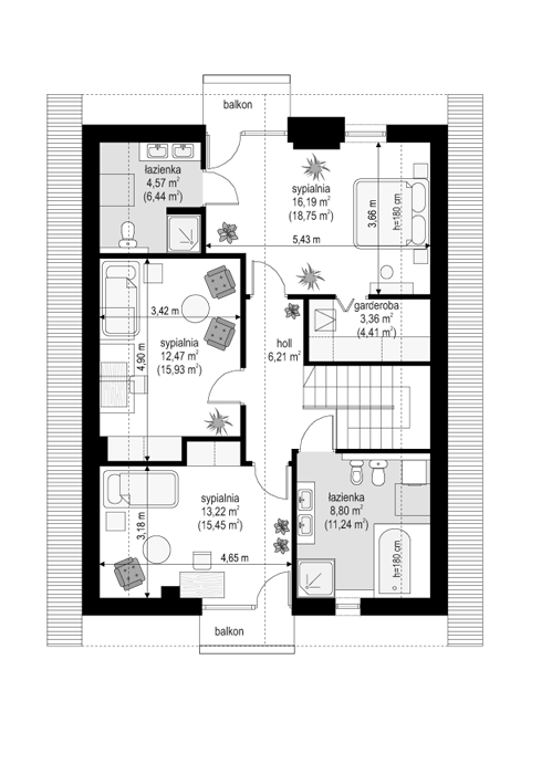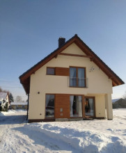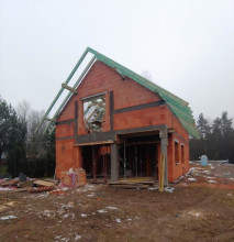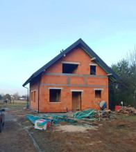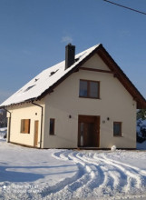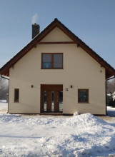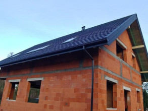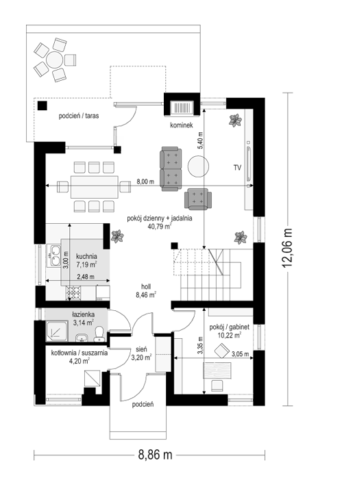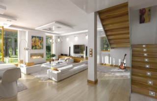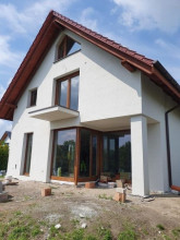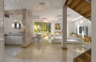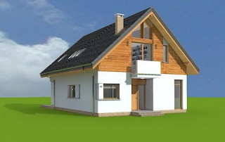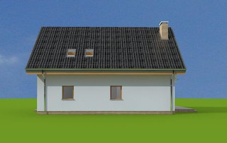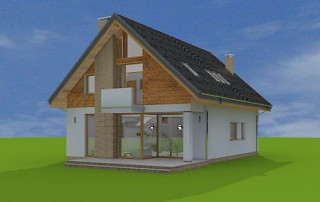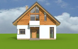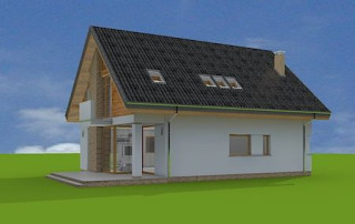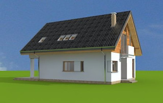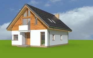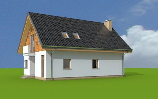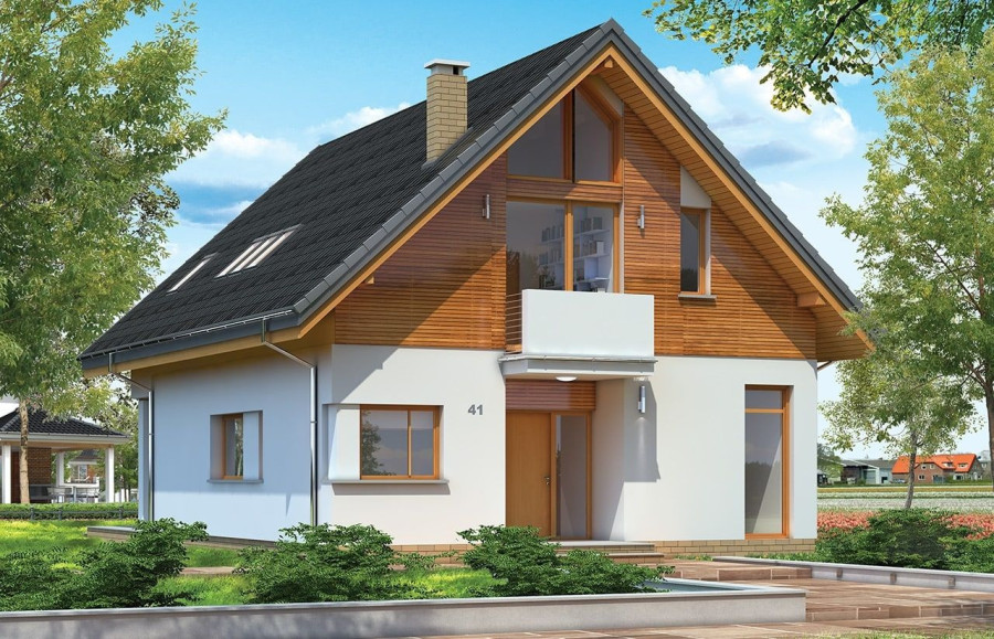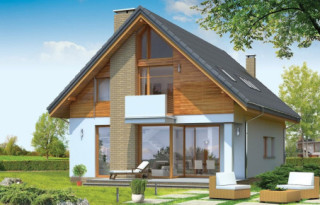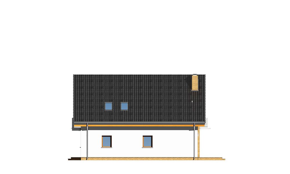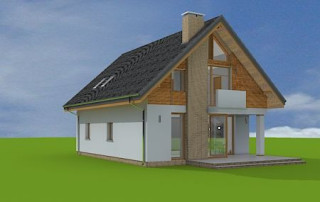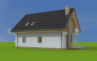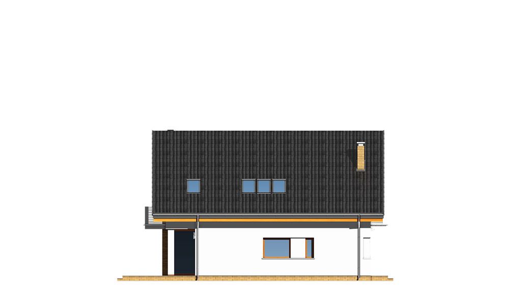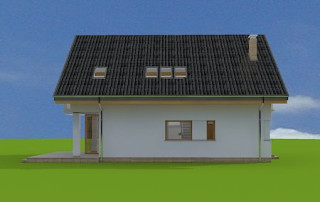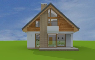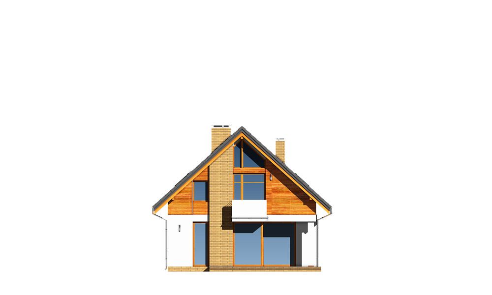 Projekt domu Prosty to dom jednorodzinny dla rodziny4- 6-osobowej, przykryty dwuspadowym dachem. Dom jest podmiejską willą o nowoczesnej, ale spokojnej architekturze. Zwarta bryła budynku z dużym zadaszonym podcieniem z tyłu domu, została ciekawie ozdobiona klinkierowymi i drewnianymi okładzinami elewacji, oraz loggiami i podcieniem wejściowym. Masywny ozdobny komin kominka wewnętrznego, czy narożne okna - to dodatkowe ozdoby bryły. Wszystkie elementy tworzą spójną, spokojną kompozycyjnie projektu domu. W projekcie domu Prosty, na parterze znajduje się duży salon z jadalnią i holem, z częściowo otwartą kuchnią, oraz dodatkowy pokój - gabinet lub sypialnią gościnna. Na poddaszu zaprojektowano sypialnie, z odrębnym apartamentem rodziców, z własną łazienką, garderobą i balkonem z widokiem na ogród. Na parterze przez szerokie przeszklenia z salonu zaplanowano wyjście do dużego podcienia i na taras ogrodowy. Pracownia posiada wersję odbicia lustrzanego projektu Prosty.