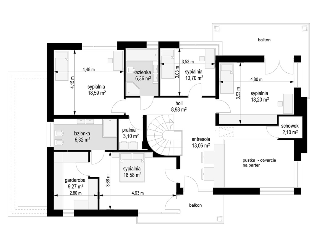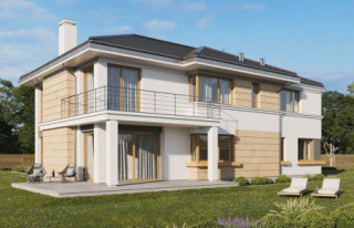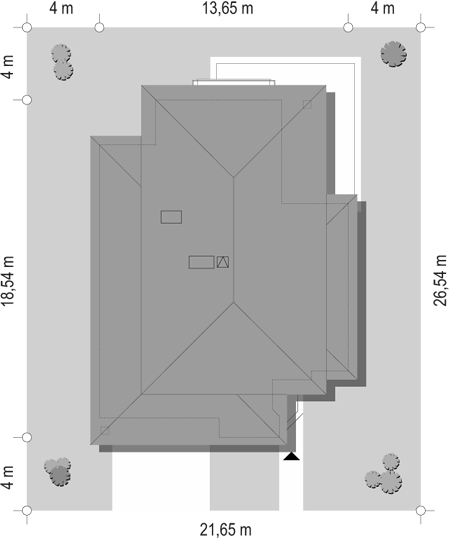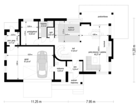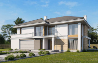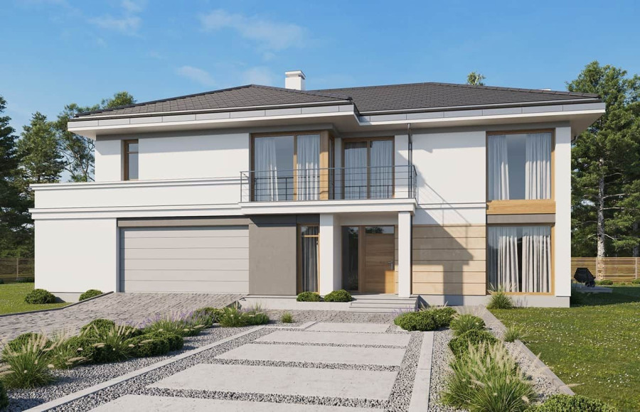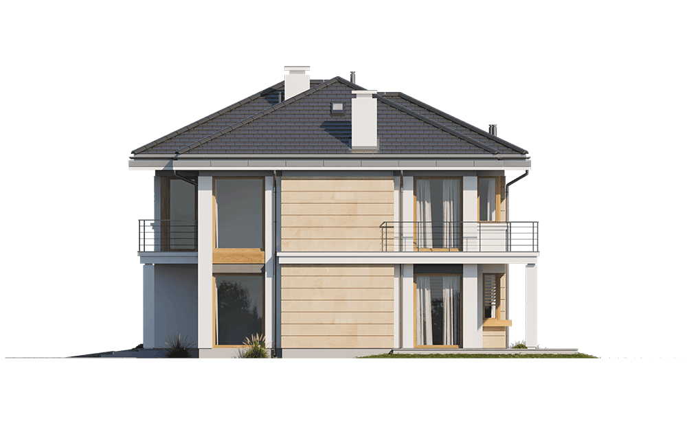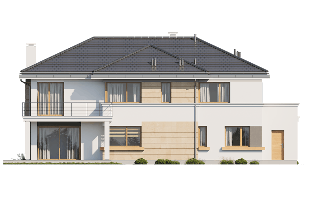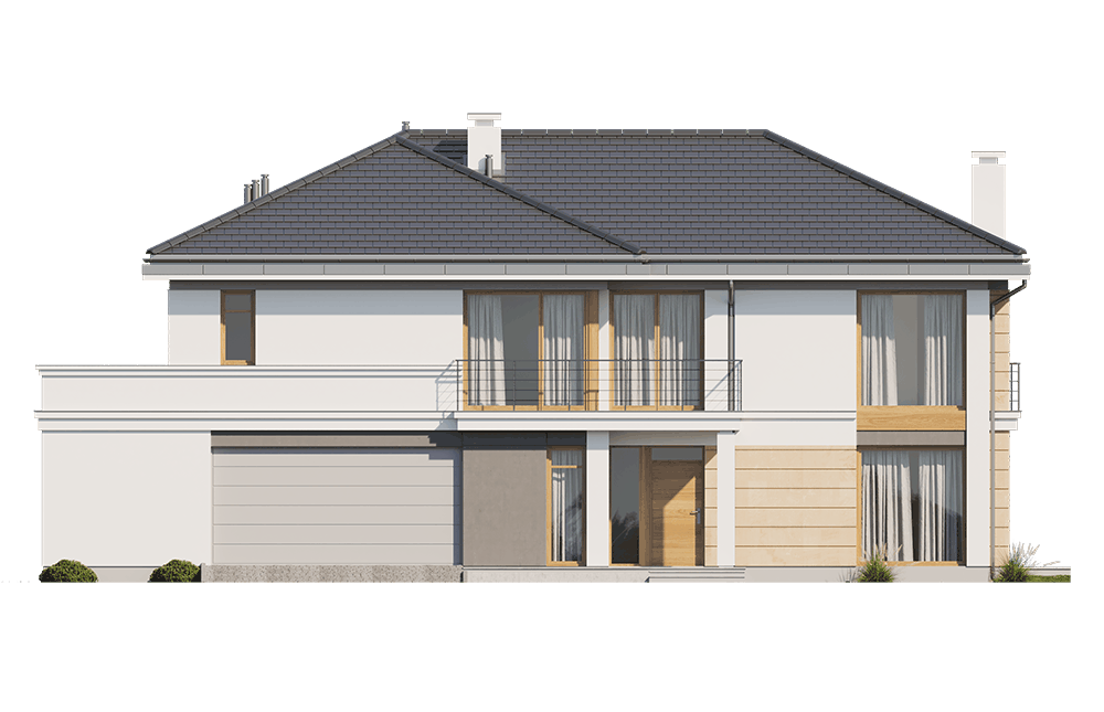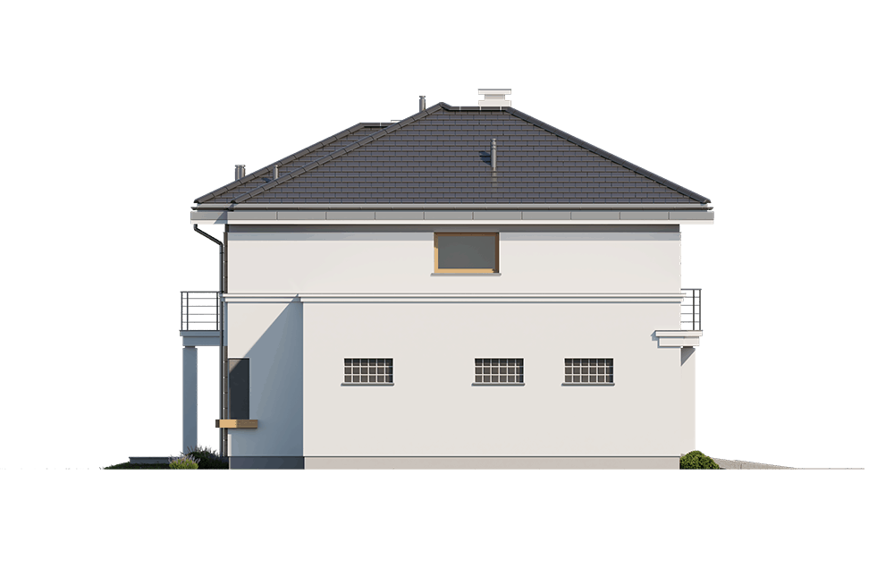Wariant projektu z kątem nachylenia dachu 25 stopni. Poszerzonym garażem o 2,7 m + dodatkowym pomieszczeniem gospodarczym za garażem.