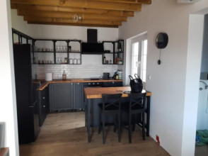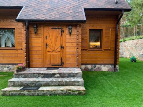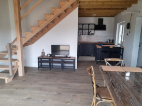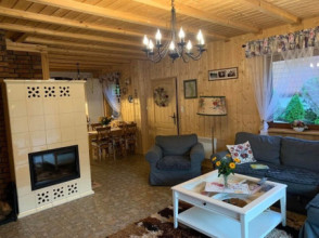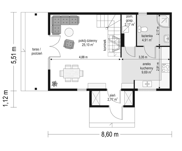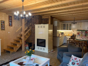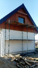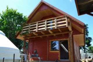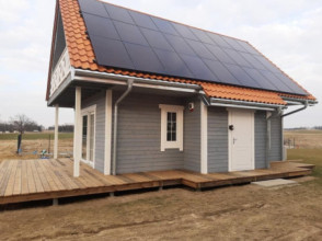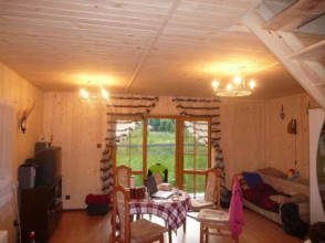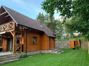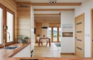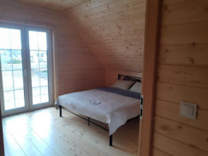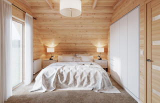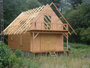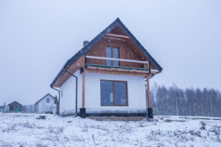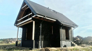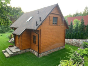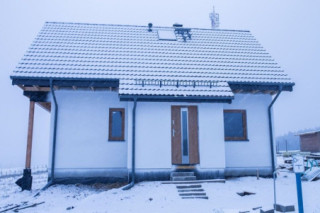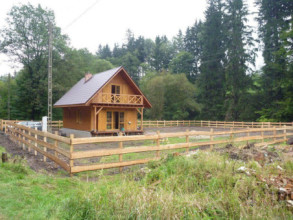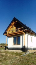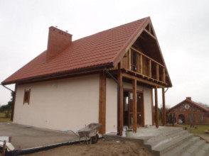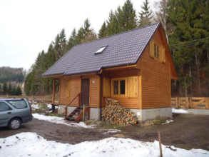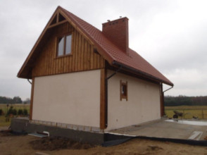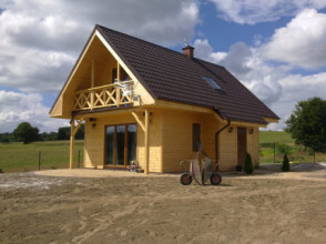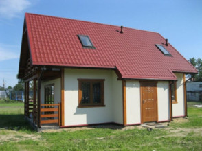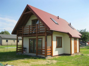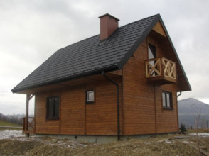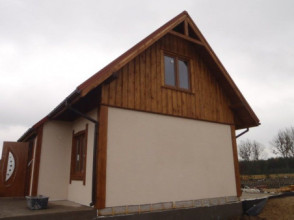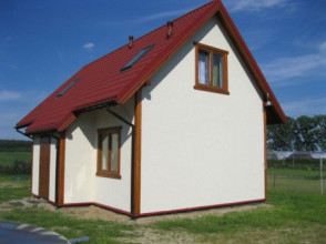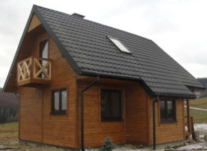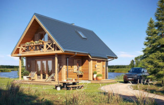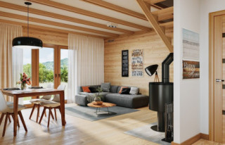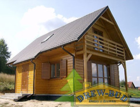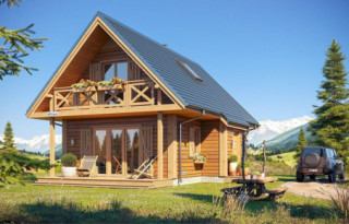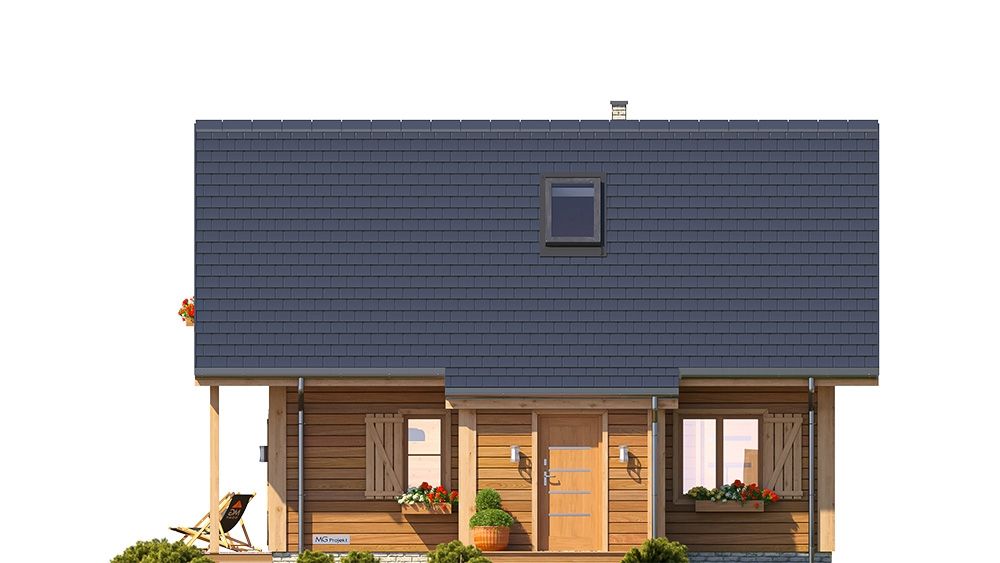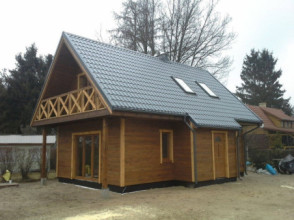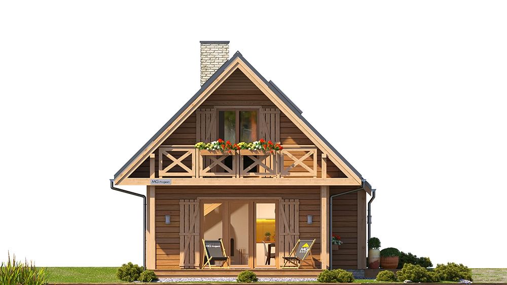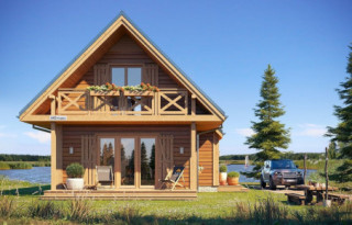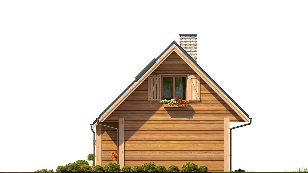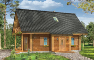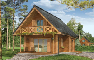 Projekt domu Sosenka 4, to wersja wariantowa projektu Sosenka. Budynek może pełnić funkcję całorocznego lub letniskowego. Dom został zaprojektowany w konstrukcji szkieletowej drewnianej. Jego prosta bryła zapewnia szybką i ekonomiczną budowę. Domek składa się z przestrzeni dziennej na parterze, z kuchnią, łazienką, gankiem wejściowym, pomieszczeniem gospodarczym. W projekcie Sosenka 4 na poddaszu znajdują się dwie sypialnie. Kominek i drewniane schody w salonie stanowią element dekoracyjny wnętrza. Zadaszony taras i balkon wsparty na słupach będą z pewnością doskonałym miejscem wypoczynku. W ofercie dostępne są inne wersje projektu: podstawowa (projekt domu Sosenka), ze schowkem przy kuchni i tarasem (projekt domu Sosenka 2), wersja o powierzchni 58,33m2 (projekt domu Sosenka 3), bardzo komfortowa (projekt domu Sosenka 5), najmniejszy (projekt domu Sosenka drewniana). Pracownia posiada również projekt Sosenka 4 w odbiciu lustrzanym.