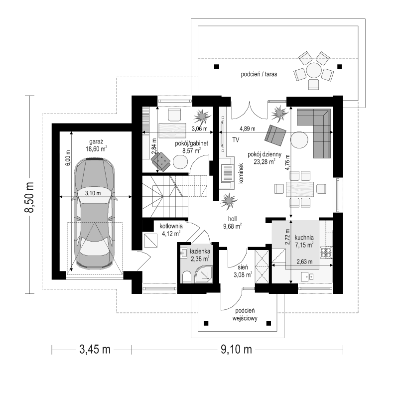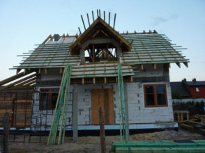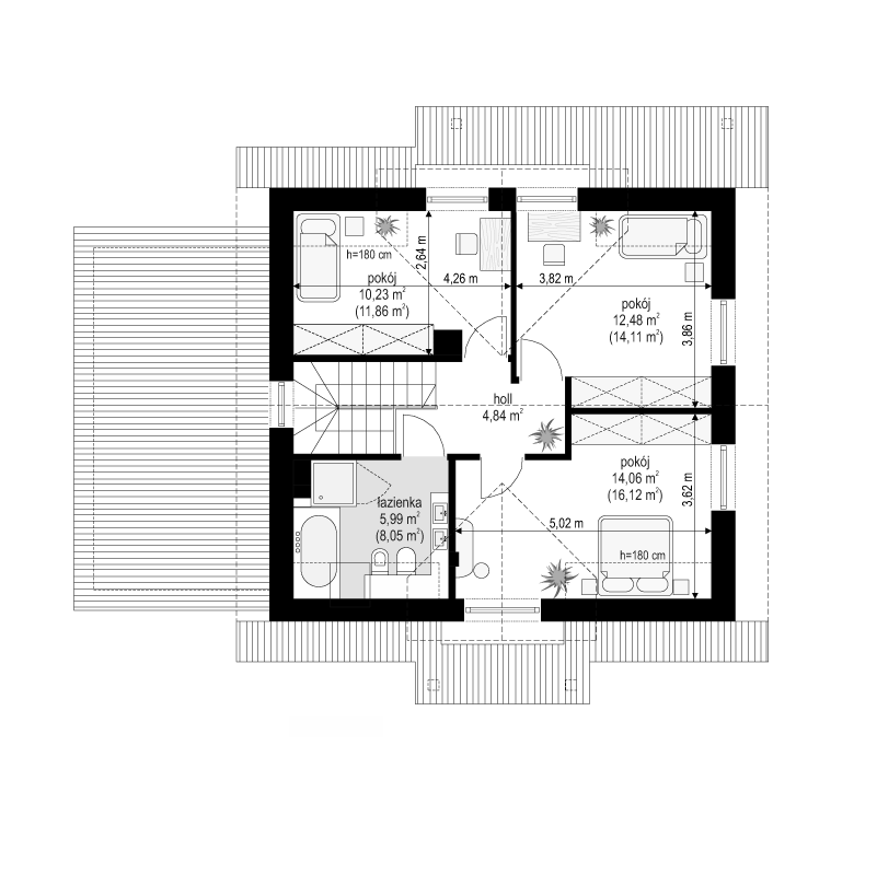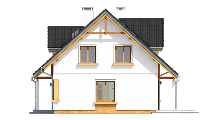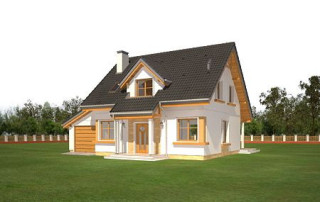 Projekt domu Spokojny to dom jednorodzinny dla rodziny 4- 5-osobowej parterowy z poddaszem użytkowym, przekryty dwuspadowym dachem, z dobudowanym garażem. Ten niewielki domek ma w sobie wszystko to, czego potrzeba do wygodnego mieszkania każdej rodzinie. Jego wygląd zewnętrzny, tradycyjny styl architektury – potęgują wrażenie solidności o trwałości. Dzięki swojej stylistyce niewielki budynek wydaje się być większy i bardziej reprezentacyjny. Wejście do domu podkreślono ładnym zadaszeniem wspartym na bocznych kolumienkach. Szerokie przeszklone drzwi z bocznym naświetlem zapraszają do wewnątrz. Elewację frontową Spokojnego ozdabiają narożne okna, oraz lukarna w dachu znajdująca się symetryczne nad wejściem. Od ogrodu mamy piękne szerokie drzwi balkonowe, z których można wyjść salonu wprost na częściowo zadaszony taras. Wnętrze domu Spokojny podzielono na części dzienną, sypialnie, oraz część gospodarczą. Na parterze połączone pomieszczenia salonu, holu i półotwartej kuchni tworzą przestrzeń dzienną. Trochę z boku znajduje się dodatkowy pokój, który może być sypialnią lub gabinetem, łazienka i schody na poddasze. Z holu wchodzimy również do kotłowni i garażu. Na poddaszu zaprojektowano trzy wygodne sypialnie z wbudowanymi szafami, oraz łazienkę. W dwóch sypialniach można zamienić szafy na niewielkie garderoby. Projekt domu Spokojny ma prostą konstrukcję, łatwą i niedrogą w budowie. Dzięki zwartości bryły, energooszczędnym rozwiązaniom i niewielkiej kubaturze, będzie tani w późniejszym utrzymaniu. Pracownia posiada także odbicie lustrzane projektu domu Spokojny.