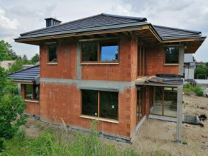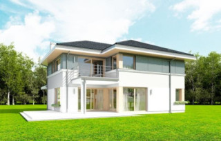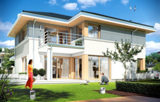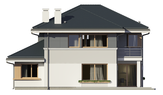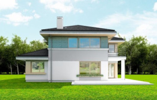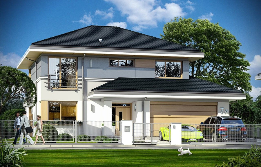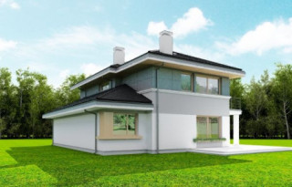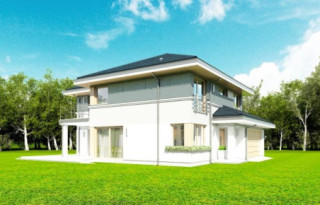 Projekt domu Sydney to piętrowa komfortowa willa miejska, z podpiwniczeniem i podwójnym garażem, przeznaczona dla 4- 6-osobowej rodziny. Projekt domu Sydney to wygodny nowoczesny dom, o ciekawej bryle i funkcjonalnie rozwiązanych wnętrzach. Dom jest energooszczędny - zastosowano w nim dobre materiały i technologie, aby podnieść komfort mieszkańców. Duże przeszklenia, okładziny ścian, kolorystyka - wszystko utrzymane jest w nowoczesnym stylu. Dodatkowe daszki, balkony, narożne okna urozmaicają bryłę domu. Wnętrze budynku podzielono na cześć dzienną na parterze i sypialnie na piętrze. Dodatkowo przewidziano piwnicę, która prócz pomieszczeń technicznych mieści w sobie dodatkową przestrzeń rekreacyjną. Na parterze zaprojektowaliśmy otwartą przestrzeń połączonych pomieszczeń salonu, jadalni, holu i dużej kuchni. W salonie przewidziano ścianę kominkową i TV. Z salonu i jadalni wychodzimy dużymi przeszkleniami na taras ogrodowy. Na parterze znajduje się też dodatkowy pokój, łazienka i garaż. Na piętrze mamy aż cztery pokoje sypialnie, w tym apartament rodziców z własną łazienką, garderobą i tarasem. Zaprojektowano też dużą ogólną łazienkę. W domu, prócz piwnicy, do wykorzystania jest dodatkowo strych nad piętrem. „Sydney” to prawdziwy dom - z piwnicą i strychem. Budynek mimo swej sporej powierzchni jest bardzo rozsądnie zaprojektowany - jego konstrukcja jest przejrzysta i dość prosta. Budynek ma zwartą bryłę. Projekt domu Sydney powinien być stosunkowo łatwy i niedrogi w budowie i niekosztowny w późniejszym utrzymaniu. Zapraszamy !