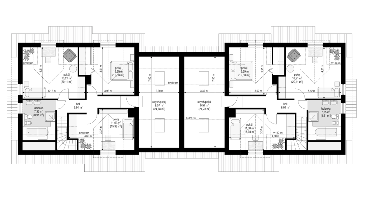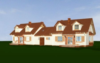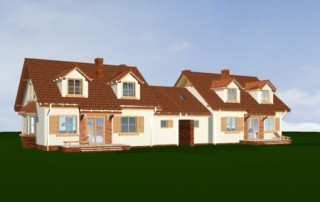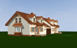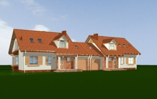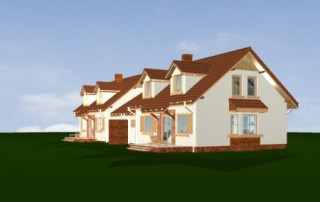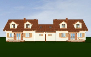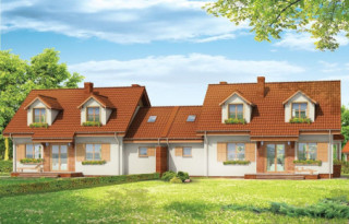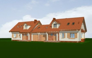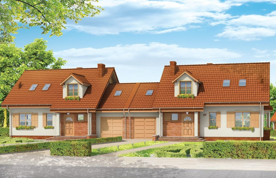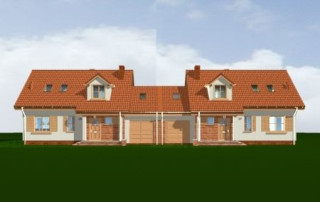 Projekt domu Szkwał to kolejny projekt z serii naszych "morskich perełek" (vide: projekt Bryza, projekt Klif). Tym razem bardzo udaną formę domu i wnętrza udało się zakomponować jako budynek bliźniaczy. Dwie identyczne połowy budynku połączono ze sobą garażami. Projekt domu Szkwał ma spokojną formę - przekryty jest dwuspadowymi dachami, urozmaiconymi lukarnami i przedłużeniami dachów podcieni. Prosta bryła budynku i nieskomplikowana konstrukcja ułatwi budowę i obniży koszty wykonawstwa. Wnętrze domku Szkwał zaprojektowano w sposób maksymalnie funkcjonalny i z poszanowaniem każdego metra kwadratowego. Na parterze zmieszczono salon z jadalnią połączony z holem, częściowo otwartą kuchnię, oraz dodatkowy pokój - mogący służyć jako sypialnia lub np. gabinet. Na poddaszu zaplanowano trzy wygodne sypialnie. Dobudowany garaż z pomieszczeniem gospodarczym i kotłownią na parterze wieńczy na poddaszu strych. Istnieje możliwość do zaadaptowania jako pomieszczenie użytkowe, np. dodatkowy pokój. Projekt domu Szwał dostępny jest też w odbiciu lustrzanym. UWAGA! Koszty realizacji oraz dane techniczne dotyczą połowy bliźniaka.