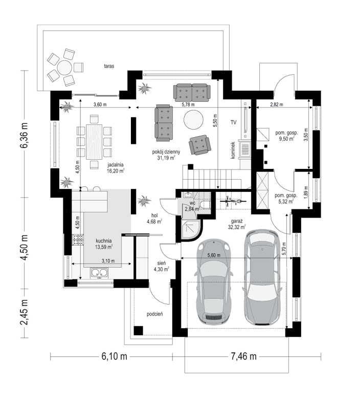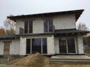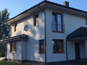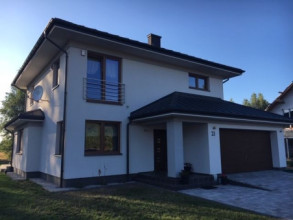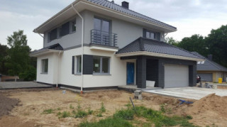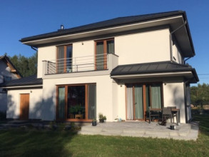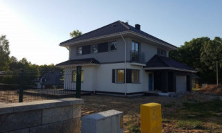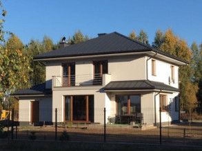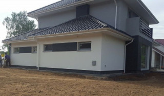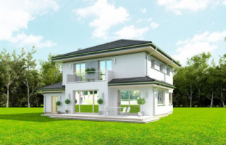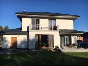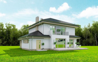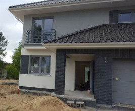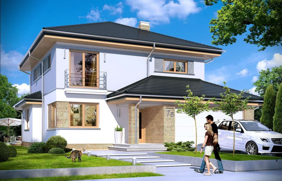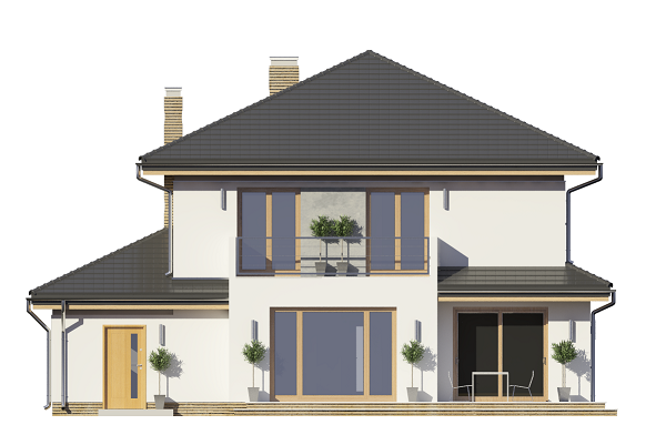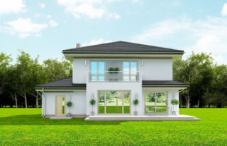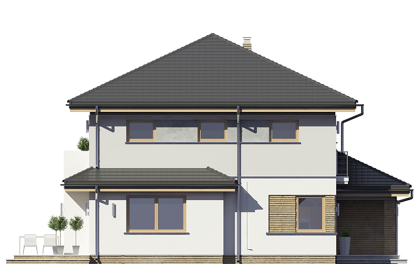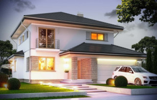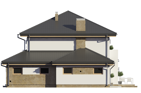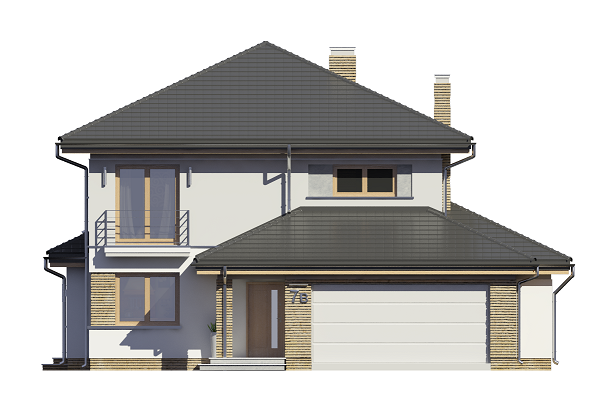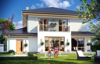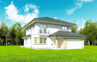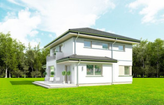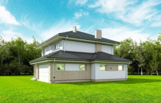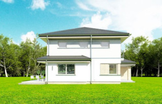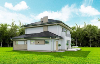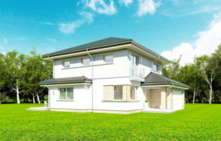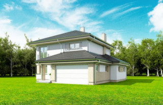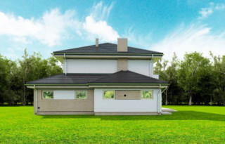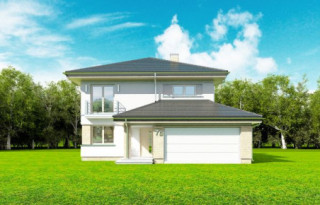 Projekt domu Szmaragd 4 jest wariantową wersją popularnego projektu typu Szmaragd. Dom jest zaprojektowany dla rodziny 4- 5-osobowej. Jest to piętrowy budynek, zbudowany na planie kwadratu przekrytego kopertowym dachem, z wbudowanym w bryłę garażem, z parterowymi dobudówkami i wykuszami. Niewielka powierzchnia domu została zamknięta w atrakcyjnej nowoczesnej bryle, z ładnymi przeszkleniami i urozmaiconymi elewacjami. Wnętrze domu podzielono na część dzienną i gospodarczą na parterze, oraz sypialnie na piętrze. Na dole zaprojektowaliśmy obszerny pokój dzienny, lekko odgrodzony od jadalni i kuchni, oraz holu. Schody na piętro są ozdobą salonu i holu. Całość tworzy jednoprzestrzenne duże wnętrze, otwarte szerokimi przeszkleniami na ogród i taras. Dwustanowiskowy garaż dostępny z przedsionka ma dodatkowo dwa pomieszczenia gospodarcze – w tym kotłownię. Na piętrze przewidziano trzy sypialnie (rodziców – z garderobą i dziecinne – z szafami wbudowanymi), dużą rodzinną łazienkę, oraz dodatkowe pomieszczenie - pokój lub garderobę. Nad piętrem znajduje się strych – magazyn. Dom został zaprojektowany z uwzględnieniem rozwiązań energooszczędnych. Późniejsza eksploatacja Szmaragda 4 nie powinna być kosztowna. Budowa samego domu również nie powinna przysporzyć wielu problemów – dom jest dość prosty, ma nieskomplikowaną konstrukcję, zwartą bryłę. Projekt domu Szmaragd 4 to projekt w sam raz dla osób, które cenią sobie dobrą architekturę i ładny efekt, ale jednocześnie nie chcą wydać na swój przyszły dom fortuny. Dostępna jest także wersja domu w odbiciu lustrzanym, wersja podstawowa (projekt domu Szmaragd), bliźniak (projekt domu Szmaragd 2), wersja największa z dodatkowym pokojem na parterze (projekt szmaragd 3) oraz najnowsze (projekt domu Szmaragd 5), (projekt domu Szmaragd 6).