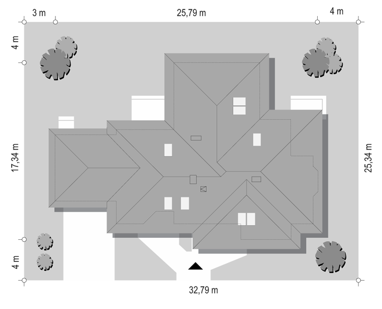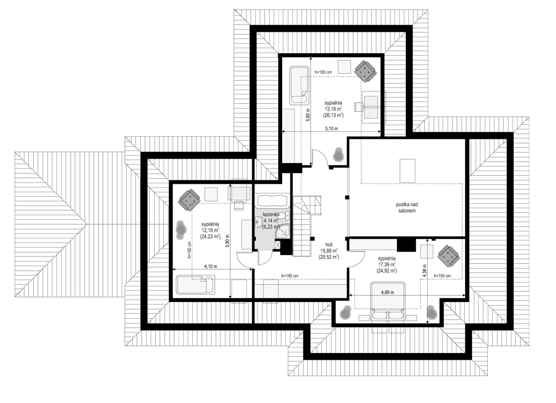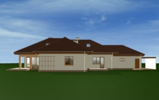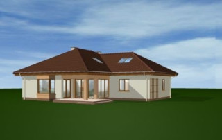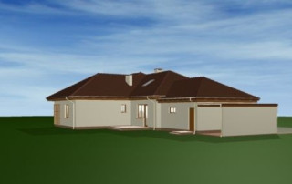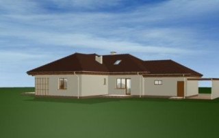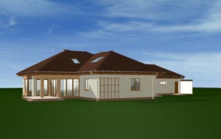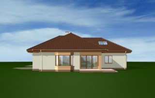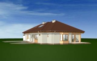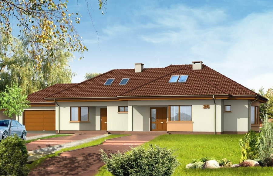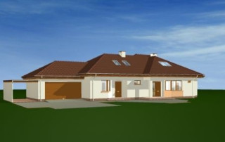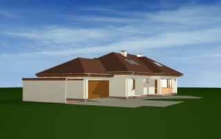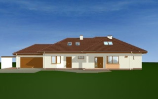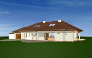 Projekt domu Trzypokoleniowy to rozległy budynek. Dom zaprojektowano z myślą o dużej, trzypokoleniowej rodzinie. Zawiera oddzielne mieszkanie dla dziadków lub dorosłych dzieci. Osobne mieszkanie może też pełnić funkcję pracowni lub biura. Dom Trzypokoleniowy zaprojektowano tak, aby mieszkańcy mieli maksymalny kontakt z ogrodem - duże przeszklenia i drzwi na otaczające tarasy. Na parterze oprócz części dziennej znajduje się sypialnia rodziców, natomiast na poddaszu zaplanowano sypialnie dzieci. Salon w domu Trzypokoleniowy został podwyższony - z pustką i antresolą na poddaszu. W osobnym skrzydle domu znajduje się niezależne dwupokojowe mieszkanie i dwustanowiskowy garaż. Projekt domu Trzypokoleniowy dostępny jest również w wersji bez tarasu zadaszonego oraz w odbiciu lustrzanym.