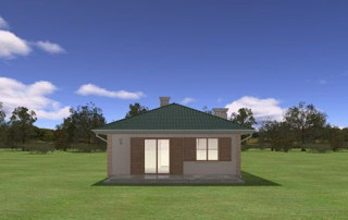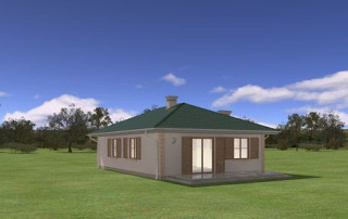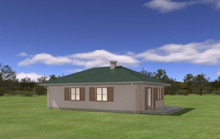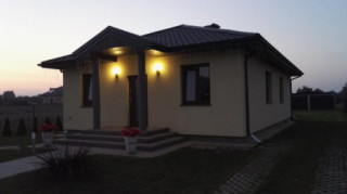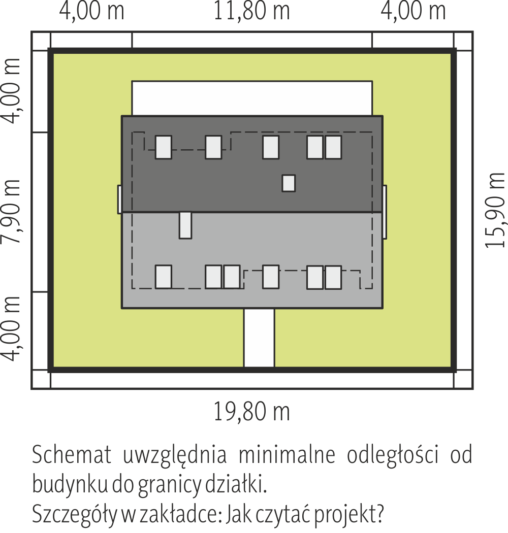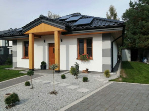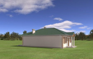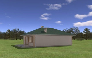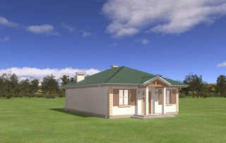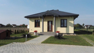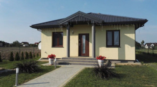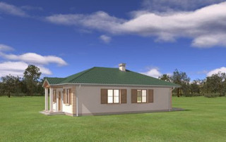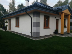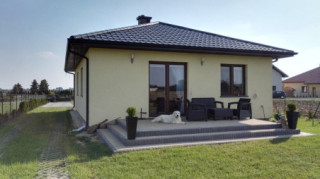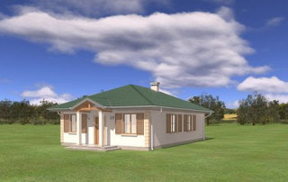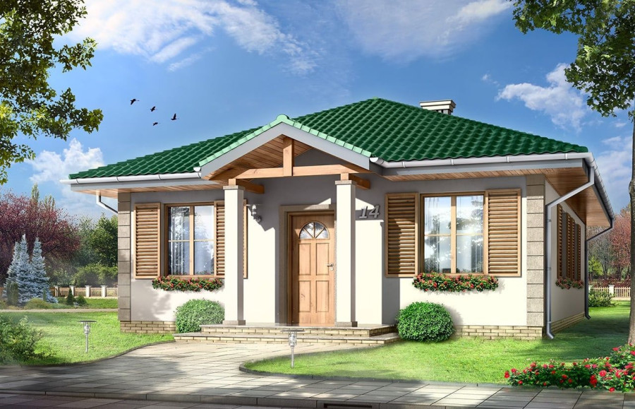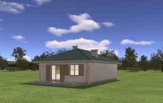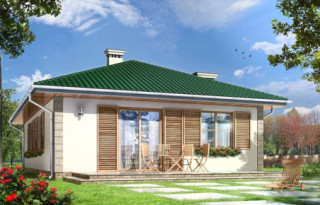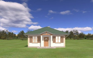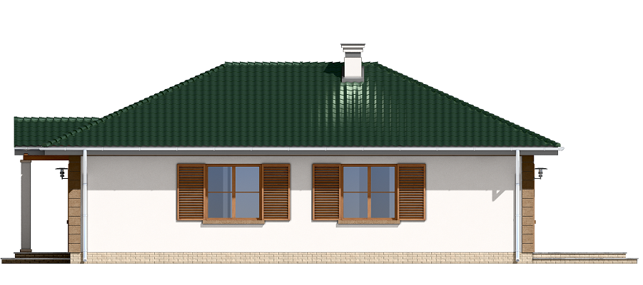 Projekt domu Urwis to parterowy dom dla czteroosobowej rodziny. Przekryty czterospadowym dachem, zbudowany na planie prostokąta. Projekt domu Urwis architektura Projekt domu Urwis jest przeznaczony do realizacji na wąskiej działce. Dzięki wejściu do budynku od węższej strony, dom Urwis ma szerokość niewiele ponad 8 metrów i mieści się na działce o szerokości 15 m. Z zewnątrz gustowny dom nawiązuje do architektury dworkowej, w nowoczesnym ujęciu. Wejściowy ganek na kolumienkach, okiennice, czy boniowane narożniki - wszystkie te elementy doskonale pasują do czterospadowego łagodnego dachu. Wnętrze w projekcie domku Urwis Wewnątrz domku Urwis na niedużej powierzchni udało się zaprojektować komfortowe, czteropokojowe mieszkanie z zapleczem technicznym, składające się z: przestronnego salonu połączonego z kuchnią, trzech sypialni, łazienki, toalety i kotłowni. W projekcie domu Urwis w salonie zaprojektowano centralnie kominek, oraz szerokie przeszklone wyjście na taras ogrodowy. Z kuchennego okna również można podziwiać ogród i domowy taras z zewnątrz. Dzięki prostej konstrukcji projektu domku Urwis koszt budowy domu jest niski. Autorska pracownia architektoniczna MGProjekt dysponuje również projektem domu Urwis w odbiciu lustrzanym oraz wersją z garażem: projekt domu Urwis 2.