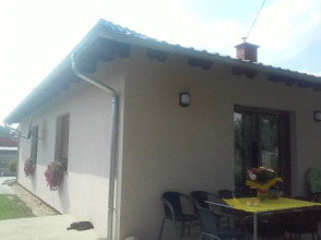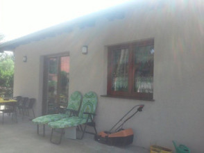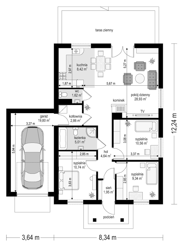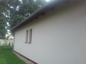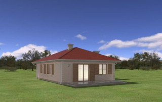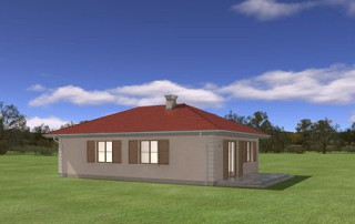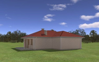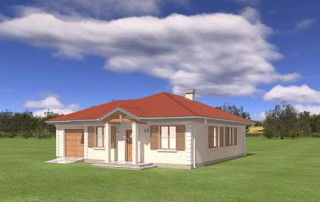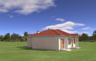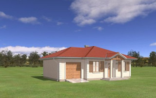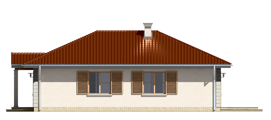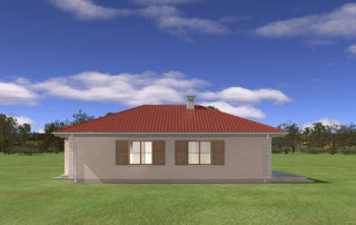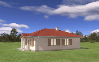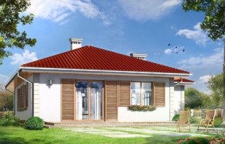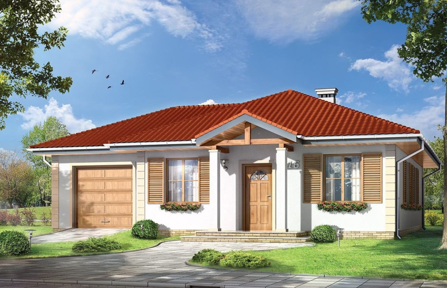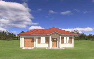 Projekt domu Urwis 2 to parterowy domek dla czteroosobowej rodziny, przekryty czterospadowym dachem. Zbudowany został na planie prostokąta, z dobudowanym garażem. Dom Urwis 2 przeznaczony jest do realizacji na wąskiej działce. Dzięki wejściu do budynku od węższej strony, dom wraz z garażem zmieści się na dziewiętnastometrowej działce. Wewnątrz budynku, na niedużej powierzchni, udało się zaprojektować wygodne, czteropokojowe mieszkanie z zapleczem technicznym, składające się z obszernego salonu połączonego z kuchnią, trzech sypialni, łazienki, toalety, kotłowni oraz garażu. W salonie zaplanowano centralnie kominek, oraz szerokie przeszklone wyjście na taras ogrodowy. Z kuchennego okna również można podziwiać ogród i domowy taras. Projekt domu Urwis 2 z zewnątrz nawiązuje do architektury dworkowej w nowoczesnym ujęciu. Wejściowy ganek na kolumienkach, okiennice, czy boniowane narożniki - wszystkie te elementy doskonale pasują do czterospadowego łagodnego dachu. Pracownia posiada również odbicie lustrzane projektu domku Urwis 2 oraz wersję bazowa bez garażu projekt domu Urwis.