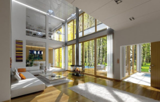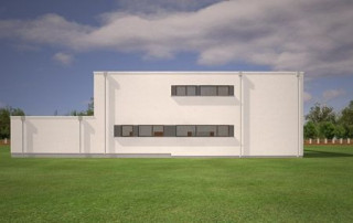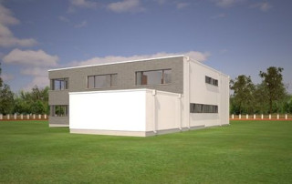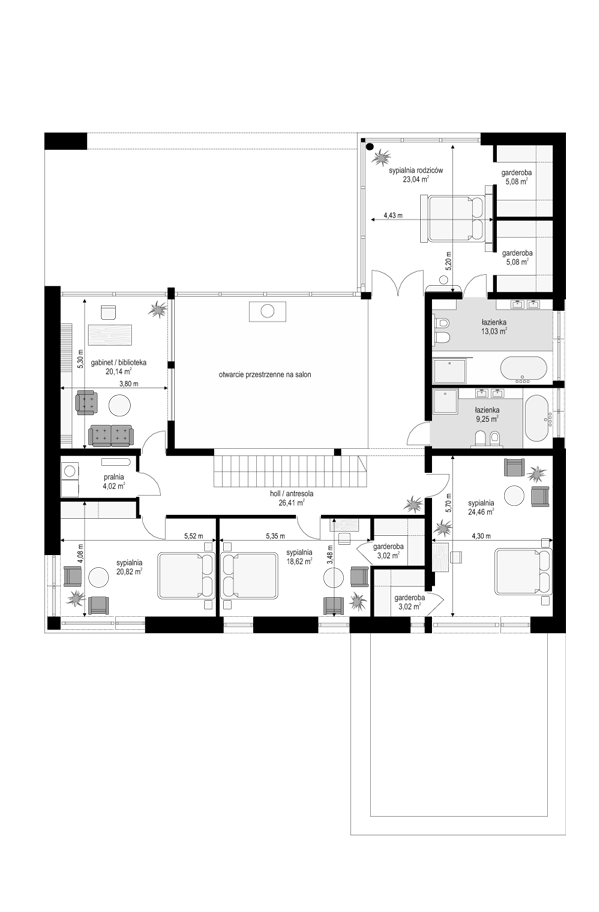Projekt domu Villa Nova to luksusowy nowoczesny dom jednorodzinny dla 4-7 osób. Ta niezwykle wygodna i przestronna rezydencja posiada wszystko, czego można oczekiwać od komfortowego domu. Całość zaprojektowano w logiczny, przemyślany sposób. Funkcjonalne wnętrza komponują się tu z dobrymi proporcjami brył i konsekwentną, minimalistyczną estetyką. Dom Villa Nova, mimo na wskroś nowoczesnej formy, jest za razem powściągliwy i ciepły. Dzięki temu oprze się z pewnością przemijającym modom w architekturze i zawsze będzie "na czasie". Willa posiada dwa oblicza: front domu jest dyskretny i monumentalny - trochę izolujący od ulicy, elewacja ogrodowa natomiast jest przeszklona, otwarta, zorganizowana wokół pięknego patia z drewnianym tarasem i basenem. Przeszklenia dwukondygnacyjnego salonu wprowadzają ogród i światło do wnętrza domu - z wielu miejsc we wnętrzu można obcować z otaczającą przyrodą. Podstawowymi zasadami kształtowania wyglądu zewnętrznego były: rytm fasad, oraz szlachetne naturalne materiały. Dom Villa Nova nie krzyczy swoim nowobogactwem, ale delikatnie przemawia do widza dobrym smakiem. Wnętrze willi zorganizowano wokół wysokiego salonu, który z otaczającymi pomieszczeniami na parterze i antresolą na piętrze tworzy luksusową przestrzeń dzienną. Pokoje są duże, pełne światła, sypialnie wygodne z garderobami lub dużymi szafami wnękowymi. Liczba pokoi, łazienek i pomieszczeń gospodarczych jest optymalna dla każdej rodziny. Dodatkowo w projekcie można właściwie dowolnie przestawiać ścianki działowe aranżując wnętrze po swojemu. Warto wspomnieć także o zastosowanych energooszczędnych rozwiązaniach w budynku. Bardzo dobre izolacje termiczne, wentylacja mechaniczna z rekuperacją, panele solarne, pompa ciepła - wszystko to powoduje, że dom jest "zielony" i niedrogi w eksploatacji. Pracownia dysponuje również projektem domu Villa Nova w wersji odbicia lustrzanego.