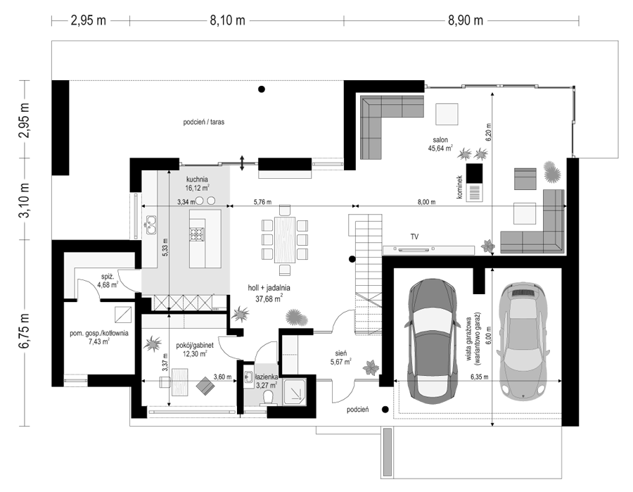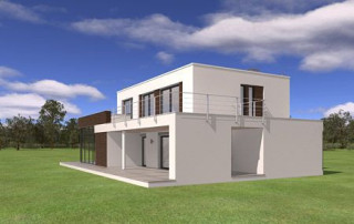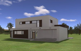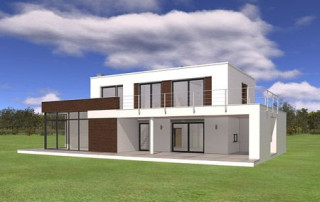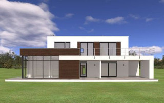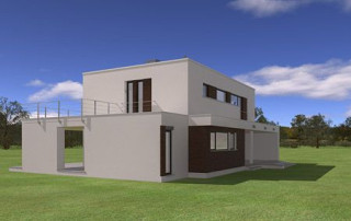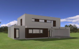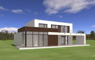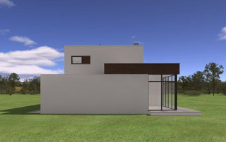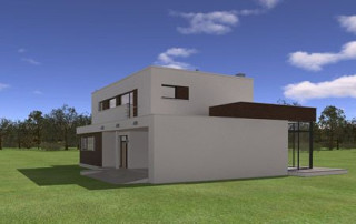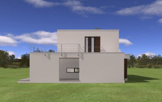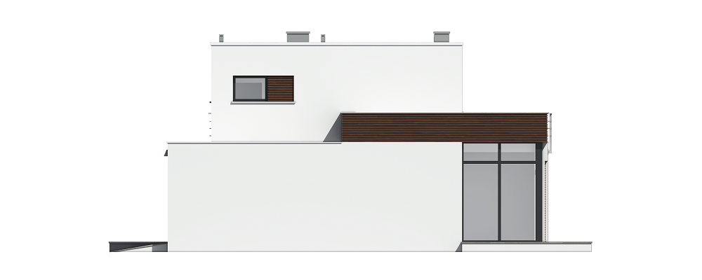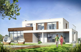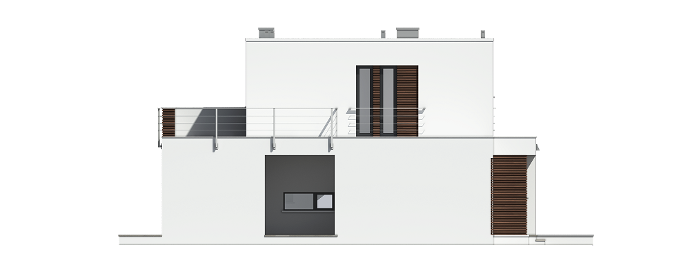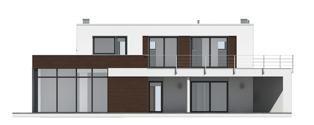 Projekt domu Willa l' Azur to elegancki, piętrowy dom jednorodzinny z płaskim dachem, przeznaczonym dla 4- 5-osobowej rodziny. Budynek składa się z głównej, jednopiętrowej bryły, otoczonej parterowymi dobudówkami, zadaszeniami i tarasami. Architektonicznie dom Willa l' Azur nawiązuje do modernistycznych, XX-wiecznych willi z płaskimi dachami - we współczesnym ujęciu, z zastosowaniem nowoczesnych materiałów i rozwiązań. Projekt domu Willa l' Azur jest jednocześnie ciekawy i intrygujący, zarazem stonowany i powściągliwy w wyrazie. Przenikające się nawzajem piętrowe i parterowe prostopadłościany brył, frontowe i ogrodowe masywne zadaszenia, duże, eksponujące wnętrze przeszklenia - wszystko to tworzy niepowtarzalną całość. Kontrastujące powierzchnie białych ścian, w zestawieniu z drewnianymi okładzinami, oknami i światłocieniem tworzą bardzo "rzeźbiarską" formę budynku. Dom zaprojektowano w dwóch wersjach wariantowych - z wiatą garażową od strony frontowej, lub z zamkniętym garażem - do wyboru. Wnętrze willi klasycznie podzielono na cześć dzienną na parterze i sypialnie na piętrze. Z przeszklonego dużego przedsionka przechodzimy do centralnego holu - jadalni, połączonego z otwartą kuchnią z wyspą, oraz pięknym salonem z centralnie ustawionym trójstronnym kominkiem. Salon w domu Willa l'Azur na większej części ma podwyższony do półtorej kondygnacji sufit, oraz piękne przeszklone otwarcie na ogród. W salonie mieszczą się dwa zestawy mebli wypoczynkowych. Kuchnia połączona jest z zapleczem gospodarczym domu - z kotłownią i spiżarnią. Na parterze zaprojektowano dodatkowy pokój - np. gabinet, łazienkę i wiatę garażową lub zamknięty garaż. Na piętrze znajdują się trzy sypialnie, w tym apartament rodziców z osobną garderobą i łazienką. Z sypialni można wyjść na piękny taras na piętrze. Pracownia posiada również odbicie lustrzane projektu domu Willa l'Azur.