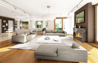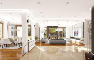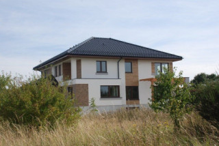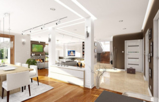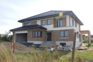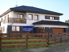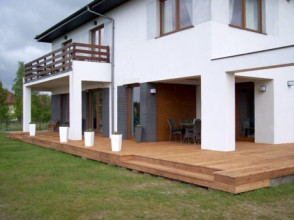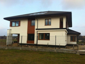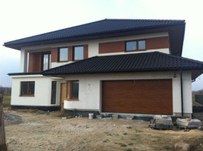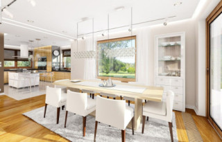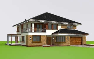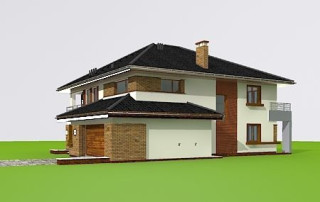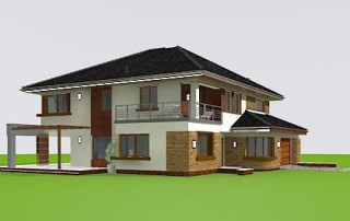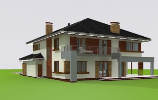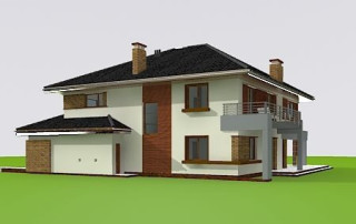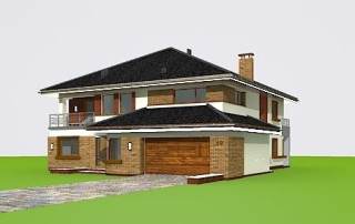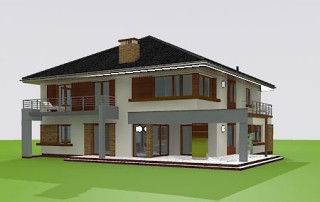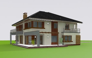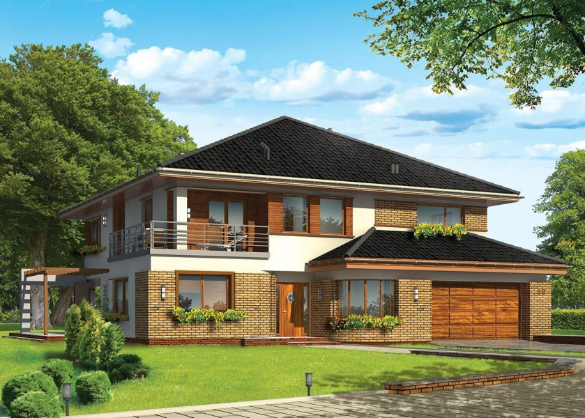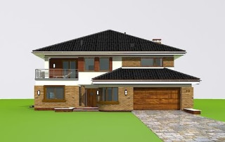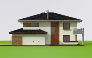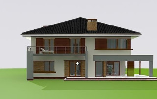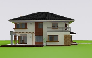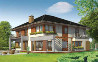 Projekt domu Wiola to budynek jednorodzinny dla 5- 6-osobowej, dużej rodziny. Piętrowy przykryty czterospadowym łagodnym dachem z dachówki ceramicznej. Wygląd zewnętrzny domu utrzymany jest w stylu podmiejskiej luksusowej willi - nowoczesnej, ale jednocześnie z elementami tradycji. Wnętrze domu ukształtowano z podziałem na część ogólną, dzienną na parterze, z salonem, jadalnią, półotwartym holem z pięknymi schodami, oraz część prywatną, nocną - na piętrze, z czterema sypialniami i dodatkowym pokojem. W projekcie domu Wiola sypialnia rodziców stanowi osobny apartament z własną oddzielną łazienką i garderobą. Na parterze, oprócz części dziennej salonu, jadalni i holu zaprojektowano gabinet i dodatkowy pokój - sypialnię gościnną. Z salonu i jadalni zaplanowano szerokie przeszklone otwarcia na ogród, przez dwa niezależne tarasy, podcień oraz pergolę. Pracownia posiada projekt domu Wiola również w odbiciu lustrzanym.