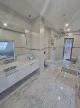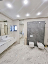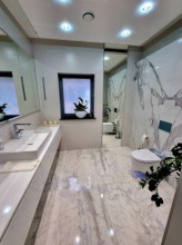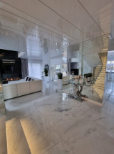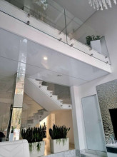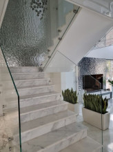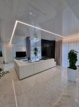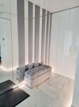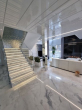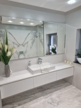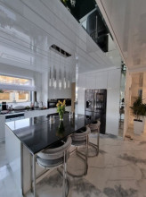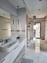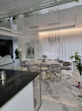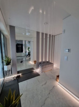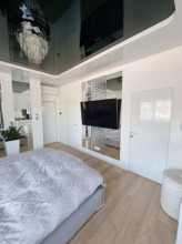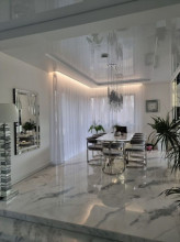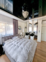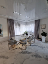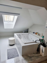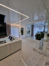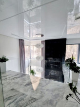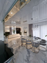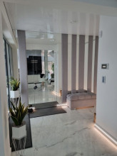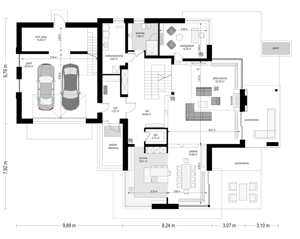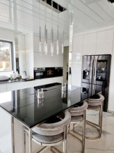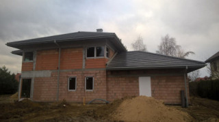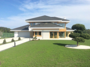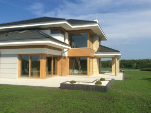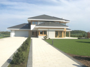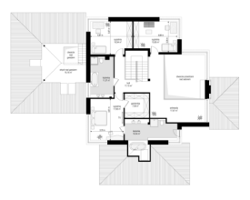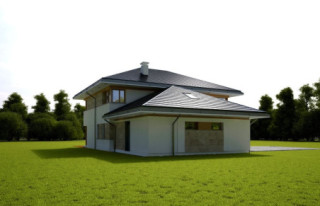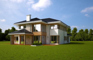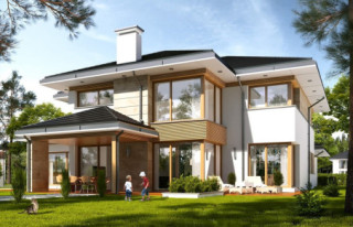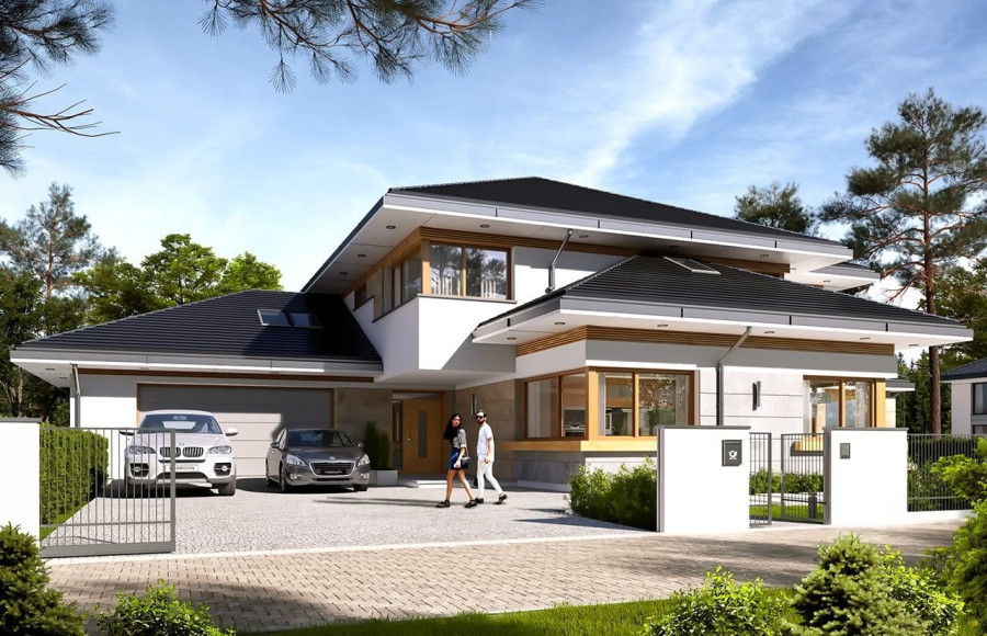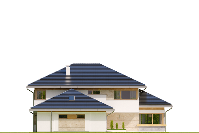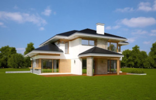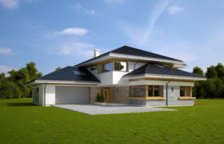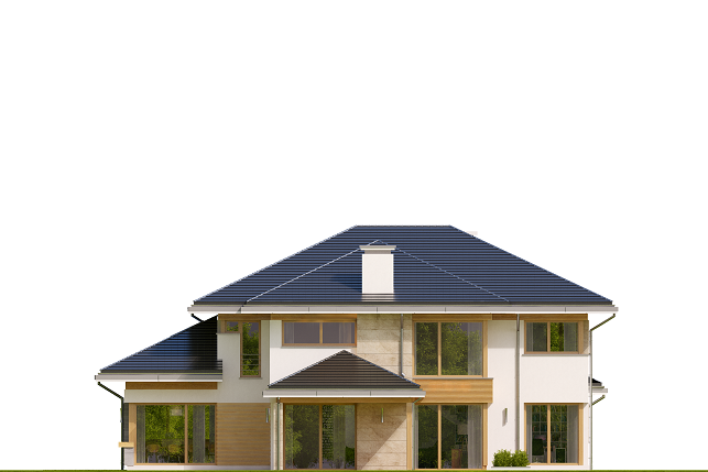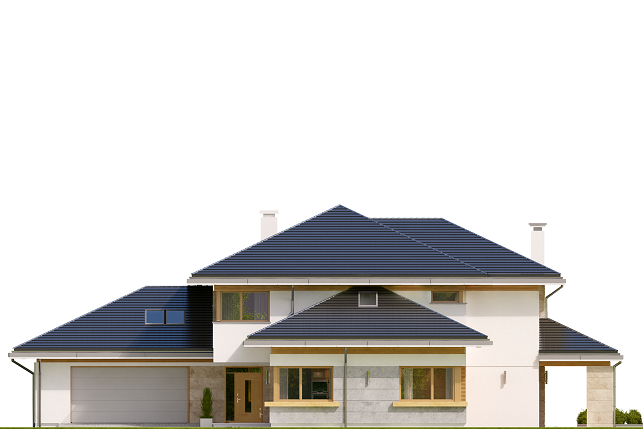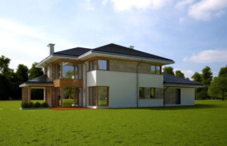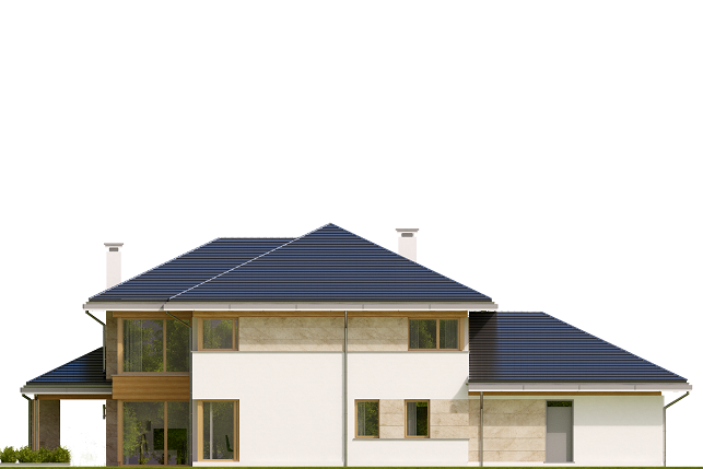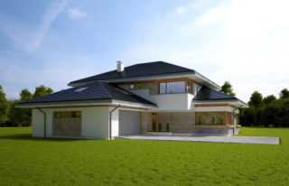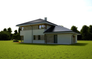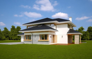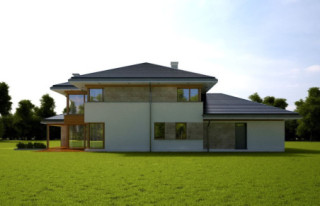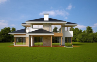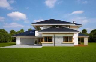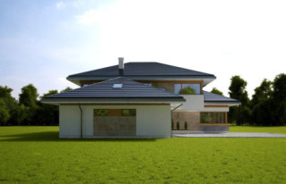 Projekt domu Dom z Widokiem 4 jest kolejną wersją popularnego projektu Dom z Widokiem. Jest to bardzo komfortowa podmiejska willa dla 4-6 osobowej rodziny. Dom składa się z piętrowej głównej bryły i dodanych parterowych mniejszych części. Całość tworzy układ litery „T”. Budynek można ustawić na działce tak, aby ściana z drzwiami wejściowymi i bramą garażową była frontem lub bokiem do drogi dojazdowej -w zależności od sytuacji. Ogród, tarasy i główne przeszklenia są wówczas usytuowane w przeciwległym narożniku działki. Także dom można postawić zarówno na działce z niekorzystnym nasłonecznieniem - z ogrodem od frontu, czy boku, ale również z ogrodem z tyłu domu. Nowoczesna architektura domu wpasuje się doskonale zarówno w ścisłą willową zabudowę, jak i w wiejski teren. Charakterystycznym elementem są tutaj duże narożne okna, okapy łagodnych dachów, oraz elewacje podzielone na pasy wykończone różnymi materiałami, jak tynk, kamień, czy drewno. Projekt domu Dom z widokiem 4 ma nowoczesną, ale stonowaną architekturę. Emanuje z niej spokój i elegancja. Dzięki połączeniu dobrych sprawdzonych detali architektura domu nigdy się nie zestarzeje i nie wyjdzie z mody. Jednymi z głównych atrakcji wilii są jej przeszklenia - największą jest dwukondygnacyjny szklany narożnik salonu, łączący pokój dzienny z pustką z tarasem i ogrodem. Pozostałe przeszklenia : w jadalni, w kuchni, sypialniach, czy przy wejściu do domu, dodatkowo potęgują efekt otwartości wnętrza. Przestrzeń jest luksusem - wnętrze domu zagospodarowano kierując się tą myślą. Parter to w dużej mierze otwarta część dzienna - salon, jadalnia, hol, kuchnia. Na parterze zmieściliśmy dodatkowy pokój - gabinet. Piętro to sypialnie rodziców i dzieci, z łazienkami i garderobami. Na piętrze mieści się duża antresola nad salonem , którą można wykorzystać jako dodatkowy pokój. Projekt domu Dom z widokiem 4 to dom dla ludzi wyjątkowych, z wizją, z pragnieniem życia w nietuzinkowym otoczeniu, wśród pięknych wnętrz. Dostępna jest także wersja domu w odbiciu lustrzanym (garaż po prawej stronie), oraz: Dom z Widokiem, Dom z Widokiem 2, Dom z Widokiem 2C, Dom z Widokiem 3, Dom z Widokiem 3F, Dom z Widokiem 5, Dom z Widokiem 6, Dom z Widokiem 6B, Dom z Widokiem B, Dom z Widokiem E.