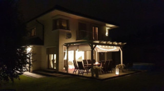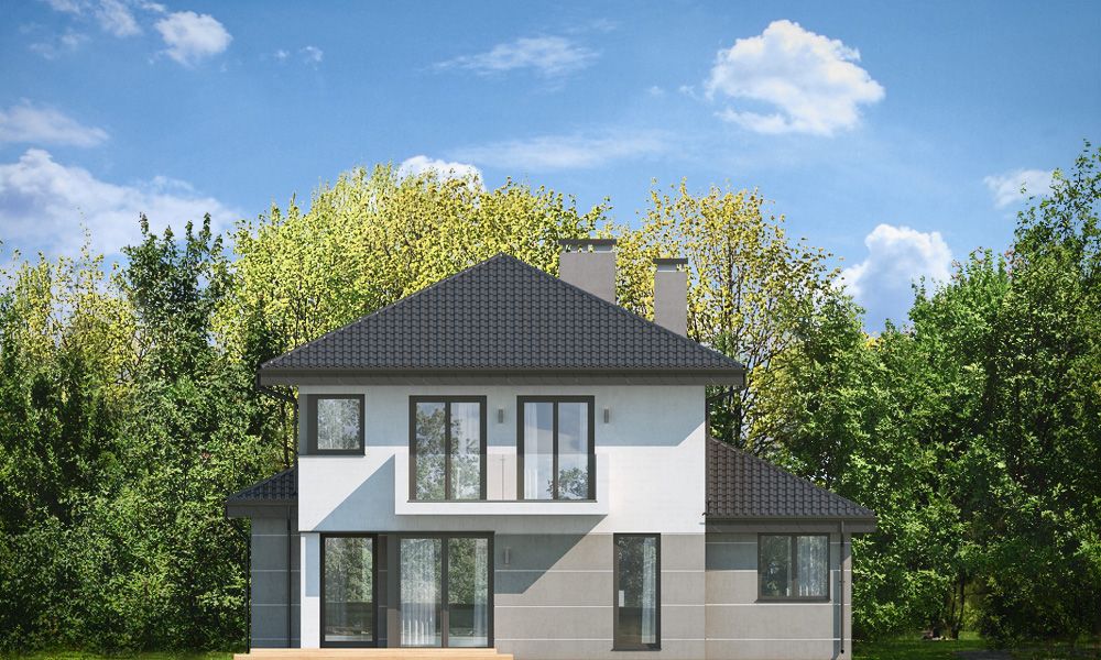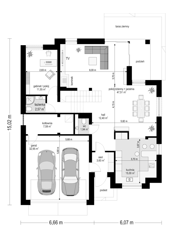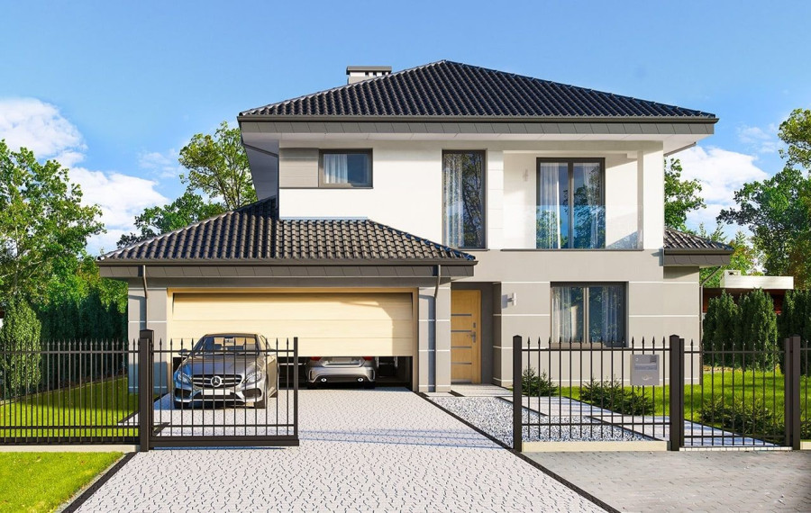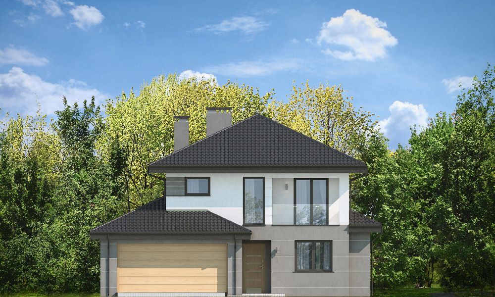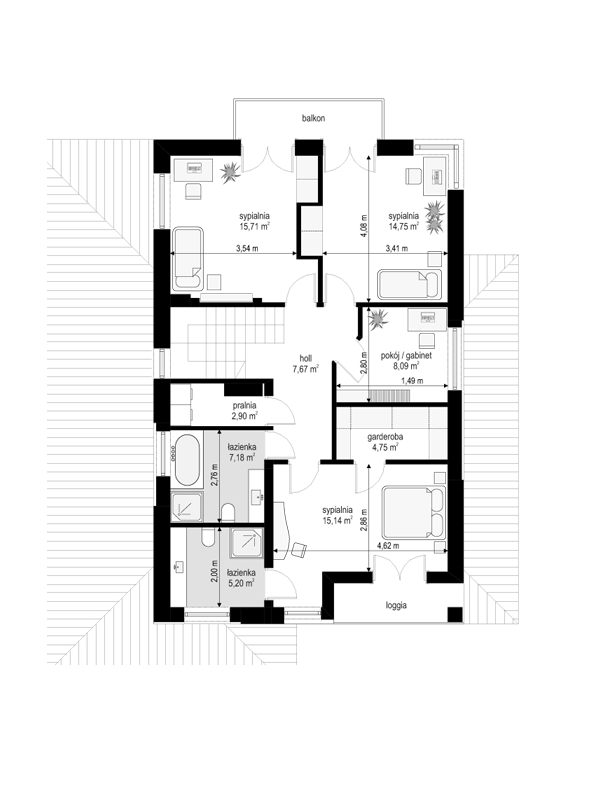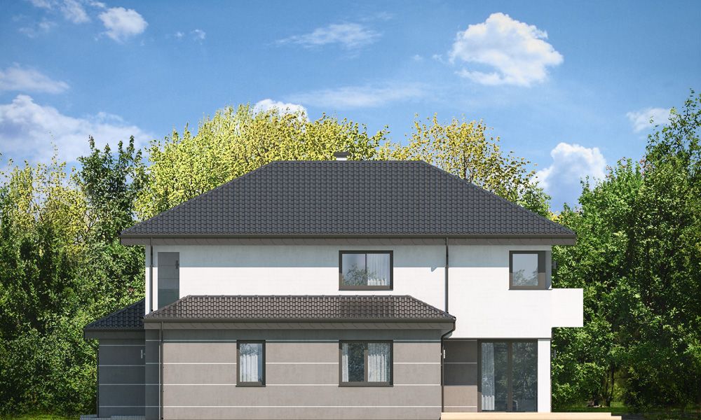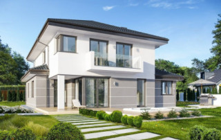 Projekt domu Kasjopea 7 to zupełnie nowy projekt z popularnej kolekcji domów „Kasjopea”. Projekt różni się zasadniczo od pozostałych domków z tej kolekcji, ma nowy oryginalny i nowoczesny wyraz architektoniczny. Osiągnięto go łącząc prostotę, oszczędność dodatków i detali, oraz ciekawą kolorystykę i materiały. Projekt domu Kasjopea 7 to budynek piętrowy, dla 4- 7-osobowej rodziny. Bryła domu jest piętrowa, przykryta czterospadowym dachem, z dobudowaną parterową częścią z garażem dwustanowiskowym. Projekt domu Kasjopea 7 to duża, komfortowa i reprezentacyjna willa, przeznaczona dla Inwestorów, którzy marzą o swobodzie przestrzeni. Jednocześnie budynek ma praktycznie zaprojektowane wnętrze, a jego konstrukcja jest dość prosta i łatwa w budowie. Elewacje domu podzielone są na poziome pasy. Dolny pas parteru ma szare boniowania, ściany piętra pozostają białe. Duże okna, podcienie i balkony dodatkowo ozdabiają bryłę budynku. Całość tworzy nowoczesną i dynamiczną sylwetkę domu. Wnętrze: parter to przede wszystkim naprawdę duży salon, połączony z jadalnią i holem, tworzący niemal 60-metrową przestrzeń dzienną. Przy wejściu do domu od frontu zaprojektowano dużą kuchnię ze stołem na szybkie posiłki. Z przedsionka dostajemy się do podwójnego garażu i do kotłowni. Za schodami, nieco odseparowany od salonu zlokalizowany jest dodatkowy pokój z własną łazienką: gabinet, lub sypialnia gościnna. Może to być również pokój dla seniora. Na piętrze zaprojektowano aż cztery sypialnie i dwie łazienki. Sypialnie dzieci mają wbudowane szafy. Sypialnia rodziców to osobny apartament z własną łazienką, garderoba i zadaszonym balkonem. Projekt domu Kasjopea 7 to komfortowy, funkcjonalnie zaprojektowany dom, o nowoczesnej i reprezentacyjnej architekturze. Projekt bardzo łatwo można dostosować do standardu NF40. Projekt dostępny jest w odbiciu lustrzanym i z wyższym kątem nachylenia dachu (projekt domu Kasjopea 7 B) oraz kilku wersjach: podstawowa (projekt domu Kasjopea) i jej wersja odświeżona (projekt domu Kasjopea 8), bliźniak (projekt domu Kasjopea 2), ze zmienionym układem pomieszczeń (projekt domu Kasjopea 3), pomniejszona (projekt domu Kasjopea 4), komfortowa (projekt domu Kasjopea 5), największa (projekt domu Kasjopea 6).