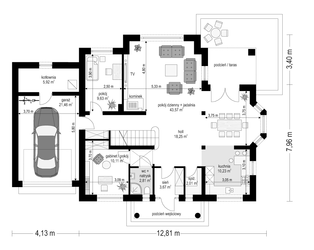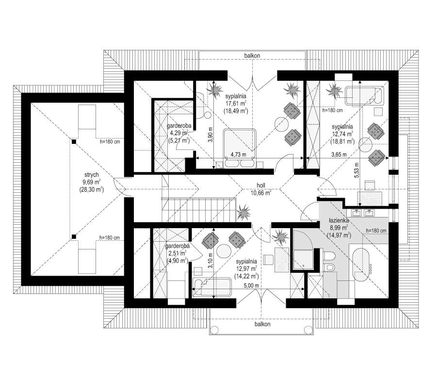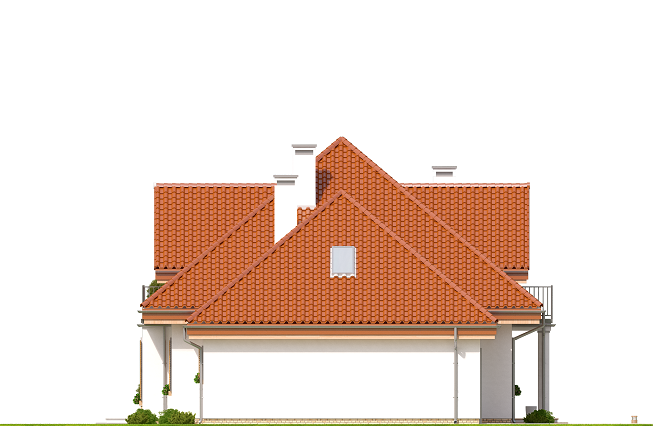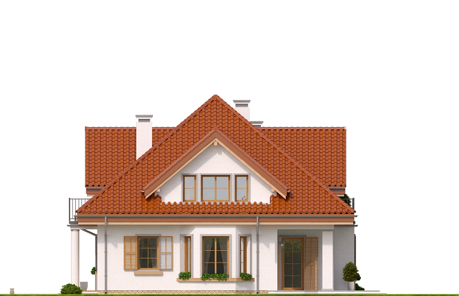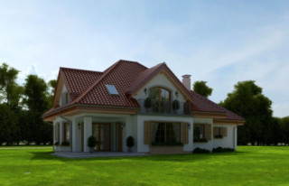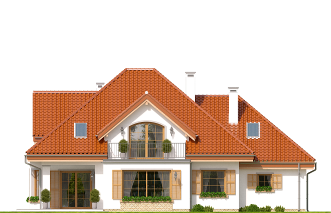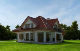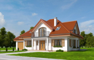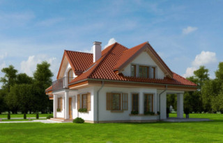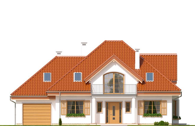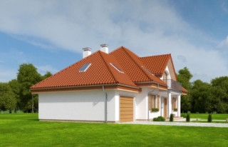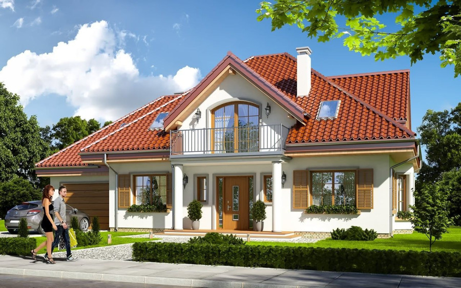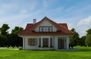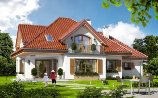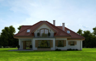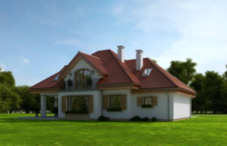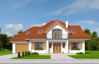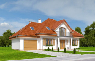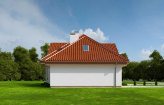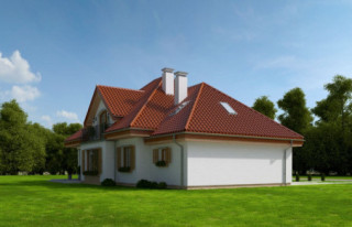 Projekt domu Ofelia 2 jest wersją wariantową popularnego projektu „Ofelia”, czyli wersję z pojedynczym garażem, nieco mniejszą, nadającą się na węższą działkę. Ofelia 2 nawiązuje do ponadczasowego stylu dworku polskiego, czy polskiego dachowca, ale w nowoczesnym ujęciu. Projekt domu Ofelia 2 ma symetryczną bryłę i właściwe proporcje. Parterowa bryła budynku przykryta jest czterospadowym dachem, z dużymi lukarnami z trzech stron, które minimalizują skosy w pokojach na poddaszu. Z czwartej strony znajduje się bryła garażowa z trójspadowym dachem kryjącym strych/poddasze. Wejście do domu podkreślone jest reprezentacyjnym portykiem z kolumnami. Od strony ogrodu mamy narożny podcień - zadaszenie tarasu, oraz piękne wykuszowe okno salonu. Wnętrze domu jest funkcjonalne i kryje w sobie wiele pomieszczeń. Na parterze mamy dużą przestrzeń dzienną połączonego salonu, jadalni, holu i częściowo otwartej kuchni. Z reprezentacyjnego holu mamy dostęp do dwóch dodatkowych pokoi na parterze, co jest rzadkością w domach tej wielkości. Można te pokoje wykorzystać na przykład jako gabinet lub sypialnie gościnną, a drugi (przy łazience) jako pokój seniora. Na parterze mieści się jeszcze spiżarnia przy kuchni, spory przedsionek, łazienka, oraz garaż i kotłownia. Poddasze mieści trzy sypialnie i dużą łazienkę. Dwie sypialnie mają własne garderoby i balkony. Nad garażem znajduje się strych, który można zagospodarować na poddasze użytkowe i urządzić tam dodatkowy pokój. Projekt domu Ofelia 2 to doskonała propozycja dla osób lubiących tradycyjny styl domu, nie ulegających chwilowym modom. Tradycyjny w formie, a jednocześnie z nowoczesnym funkcjonalnym wnętrzem, zastosowanymi nowoczesnymi materiałami i technologiami. Dom jest energooszczędny i dość prosty i niedrogi w budowie. Zapraszamy do zapoznania się z pełną ofertą pracowni MG Projekt tej serii: z dwustanowiskowym garażem (projekt domu Ofelia), z jednostanowiskowym garażem (projekt domu Ofelia 2), najmniejsza wersja (projekt domu Ofelia 3). Zapraszam!