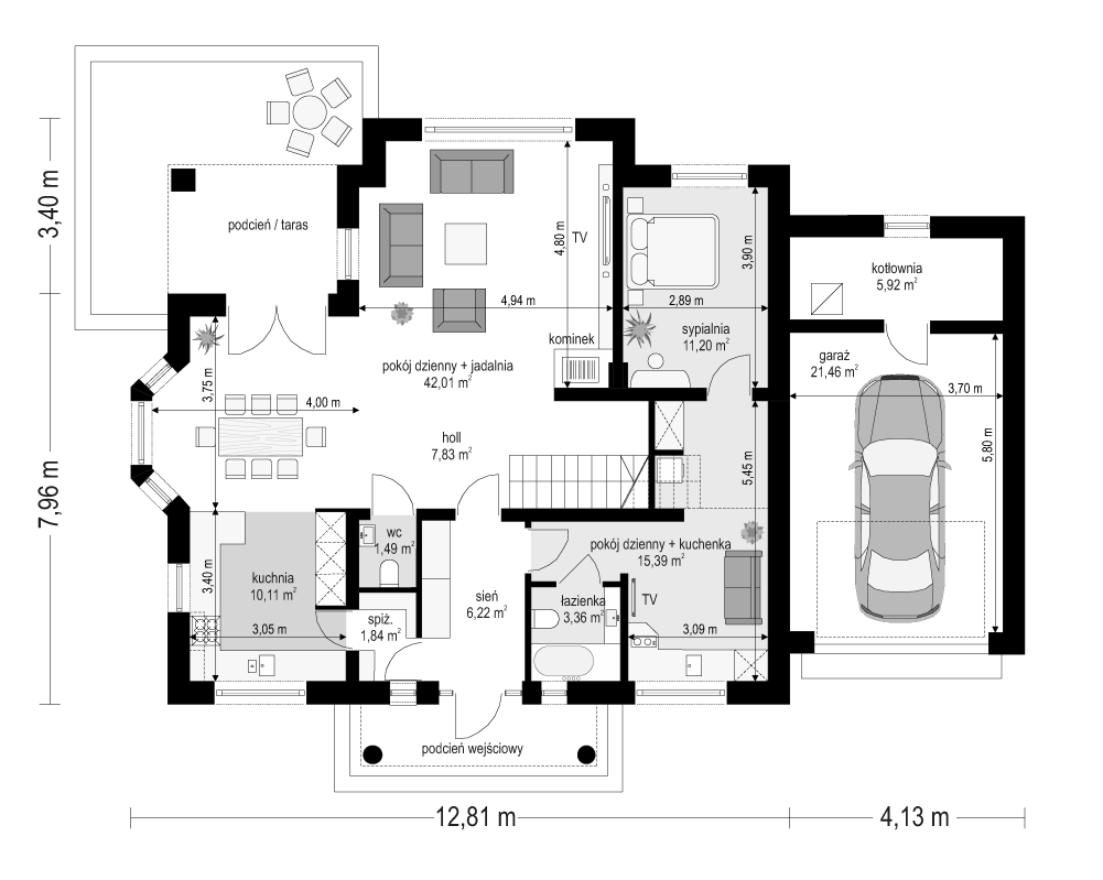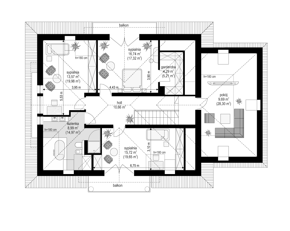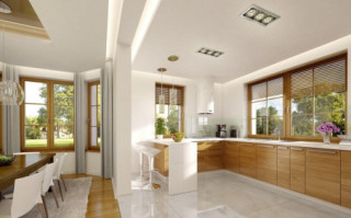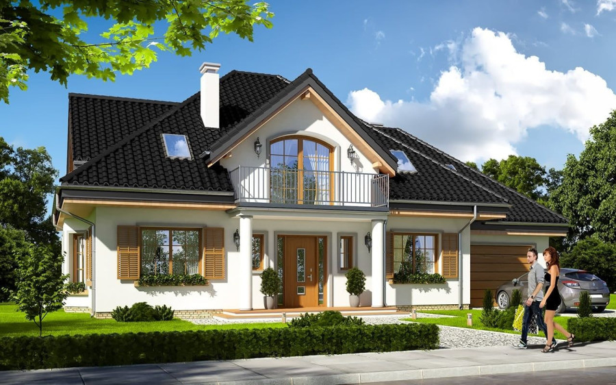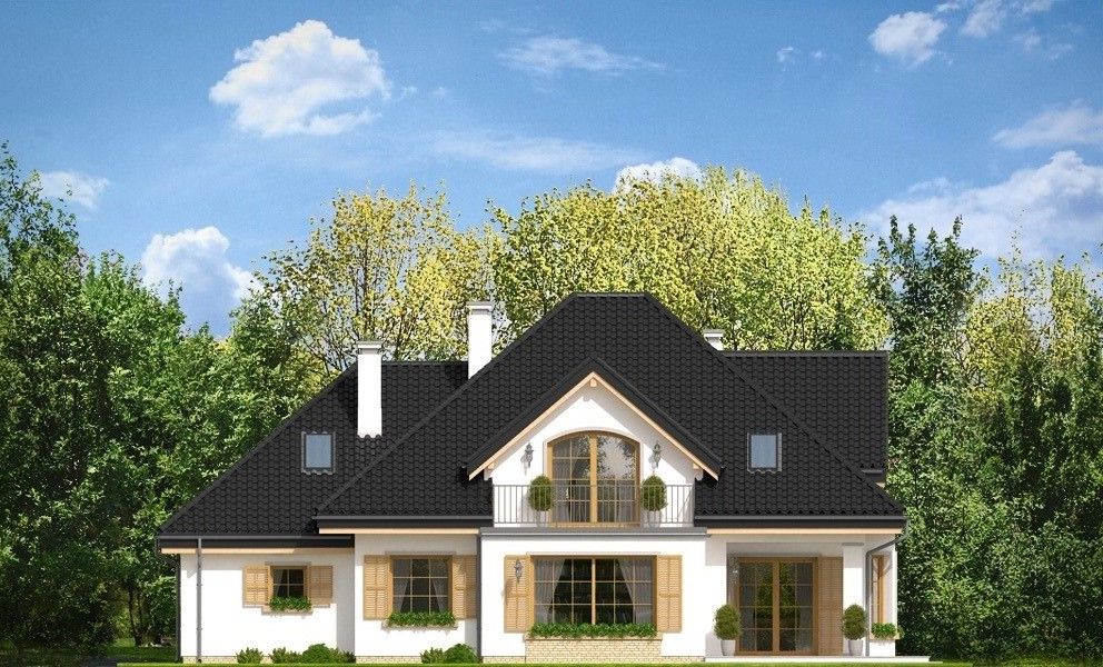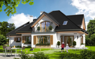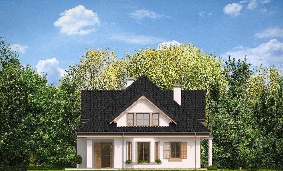 Projekt domu Ofelia 3 jest kolejną wersją projektu z serii domów „Ofelia”. Jest to projekt zmniejszony w stosunku do bazowej wersji, z pojedynczym garażem i z dodatkowym lokalem na parterze: mieszkaniem dla seniorów lub dorosłych dzieci, albo przestrzenią biurową. Ofelia 3 to projekt jednorodzinnego domu, parterowy z poddaszem użytkowym, przykryty czterospadowym dachem, z dobudowaną częścią garażową. Tradycyjna architektura domu, z dworkową bryłą, łączy się z nowoczesnymi materiałami i detalami. Całość zyskuje dzięki temu ponadczasowy charakter. Front domu został zaakcentowany szeroką lukarną z balkonem wspartym na kolumnach. Wejście do domu szerokimi drzwiami z naświetlami bocznymi jest bardzo reprezentacyjne. Od strony ogrodowej elewacja urozmaicona jest lukarną z balkonem, wykuszem salonu z pięknym nisko schodzącym oknem, oraz podcieniem częściowo zadaszającym taras. Wnętrze domu: na parterze wydzielono część dzienną domu, oraz dodatkowy lokal (mieszkanie, lub na przykład biuro), do którego dostajemy się z obszernego przedsionka. W części dziennej mamy salon z jadalnią i holem, oraz kuchnię ze spiżarnią. Dodatkowo z boku domu dobudowany jest garaż z kotłownią (część garażową można połączyć z domem dodatkowymi drzwiami). Na poddaszu zaprojektowano trzy sypialnie z dużą łazienką, oraz dodatkowy pokój nad garażem. Sypialnia rodziców posiada własną garderobę, oraz balkon z widokiem na ogród. Ofelia 3 to świetna propozycja dla wielopokoleniowej rodziny, albo dla Inwestorów prowadzących swój biznes w domu. Budynek na dość prostą konstrukcję. Jest łatwy w budowie, a dzięki energooszczędnym rozwiązaniom będzie niedrogi w eksploatacji. Ofelię 3 można łatwo dostosować do standardu NF40. Zapraszamy.