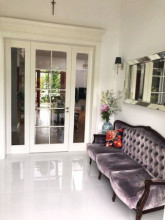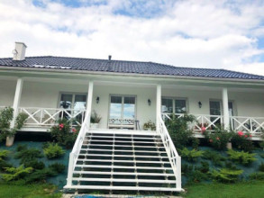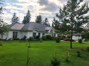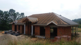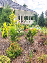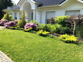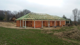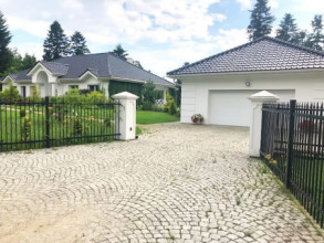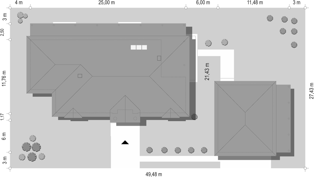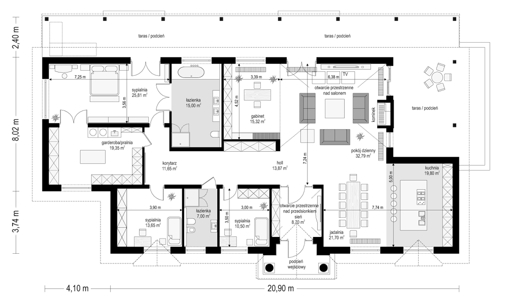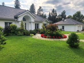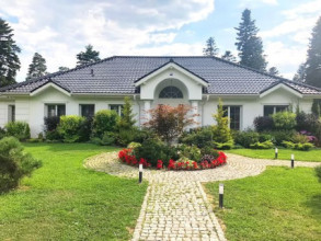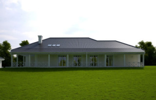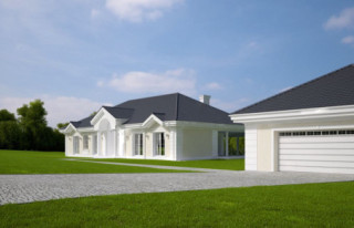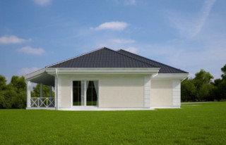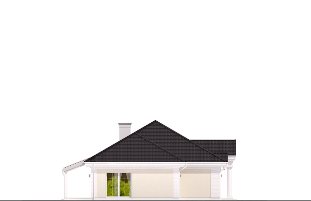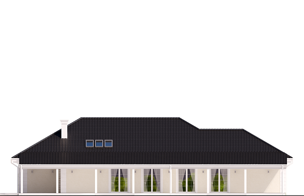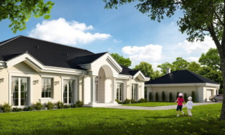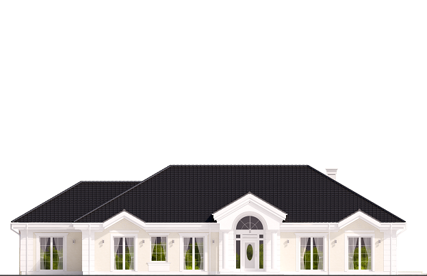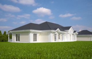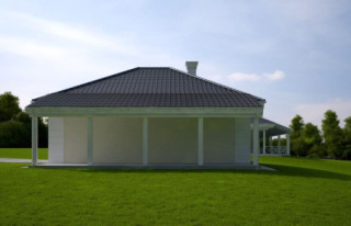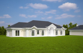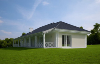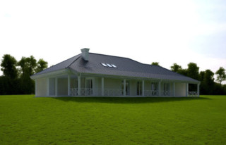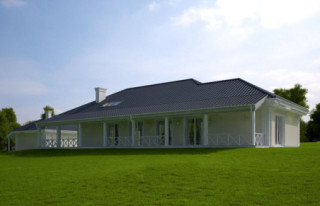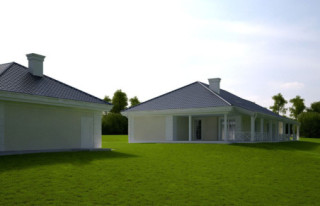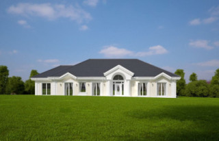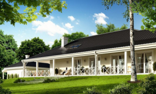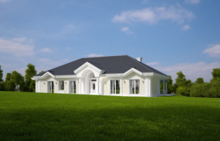 Projekt domu Rezydencja parkowa 4 jest kolejną wersją popularnego projektu Rezydencja Parkowa. Projekt to piękna parterowa willa wiejska, przywołująca szlachecki dworek, albo angielski czy amerykański manor house. Rozłożysta podłużna bryła, zbudowana na planie prostokąta, przykryta jest ładnym czterospadowym dachem. Rezydencja parkowa 4 od frontu zdobi reprezentacyjny wejściowy portyk. Elewacja ogrodowa to wielka podłużna weranda. Tak zadaszony taras jest marzeniem wielu inwestorów. Dom doskonale nadaje się na podmiejską rezydencję, albo na wielski drugi dom dla zamożnego mieszczucha. Albo mieszczucha z fantazją ! Wnętrze domu to bardzo prosty układ pomieszczeń. Przestrzeń bez żadnych kompromisów. Wszystkie ważne dla właścicieli pomieszczenia są duże i ustawne. Wnętrze dzienne to połączenie salonu, jadalni, pięknej kuchni z wyspą, oraz gabinetu- biblioteki. Pozostała przestrzeń to luksusowy buduar właścicieli, z wielką garderobą i łazienką, oraz dodatkowe dwa pokoje z łazienką - dla dzieci, lub dla gości. Projekt domu Rezydencja parkowa 4 docenią osoby, dla których to nie jest pierwsza inwestycja w życiu. Nie ma tutaj całej listy pomieszczeń-klitek. Jest za to nieprzyzwoicie wygodna przestrzeń. Architektura domu jest klasyczna, ponadczasowa. Dom czerpie z dobrych sprawdzonych wzorów i nigdy się nie zestarzeje. Budynek doskonale wkomponuje się w otaczającą przyrodę. Aby nie zachwiać estetyki budynku zdecydowaliśmy się oddzielić budynek gospodarczo –garażowy od głównej bryły rezydencji. Jeśli inwestor dysponuje ładną parcelą, można sobie pozwolić na budowę domu i budynku garażowego. Można też - na mniejszej działce – zbudować sam budynek mieszkalny. Zapraszamy do zapoznania się z pełną ofertą pracowni MG Projekt: Rezydencja Parkowa, Rezydencja Parkowa 2, Rezydencja Parkowa 3, Rezydencja Parkowa 3 B, Rezydencja Parkowa 3 C, Rezydencja Parkowa 3 D.