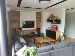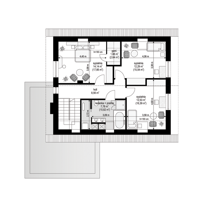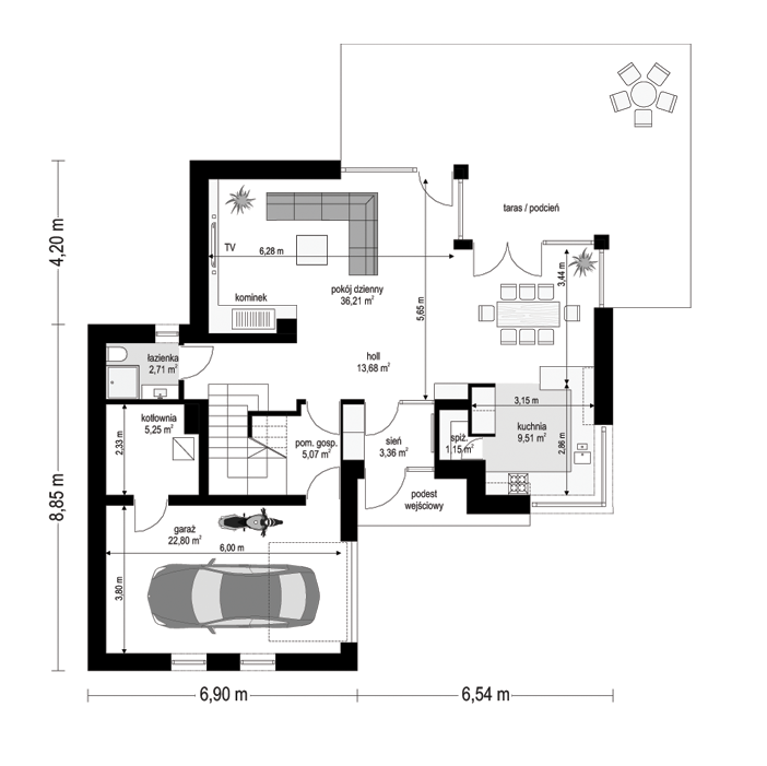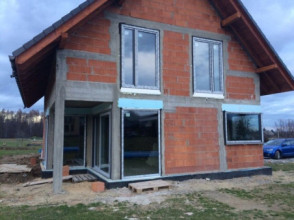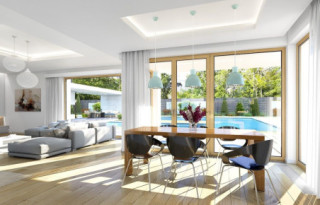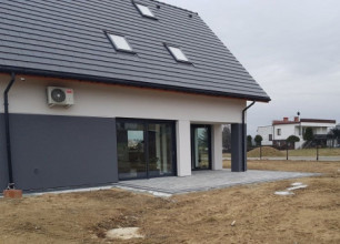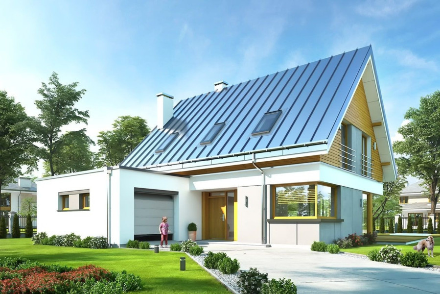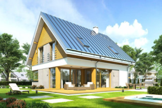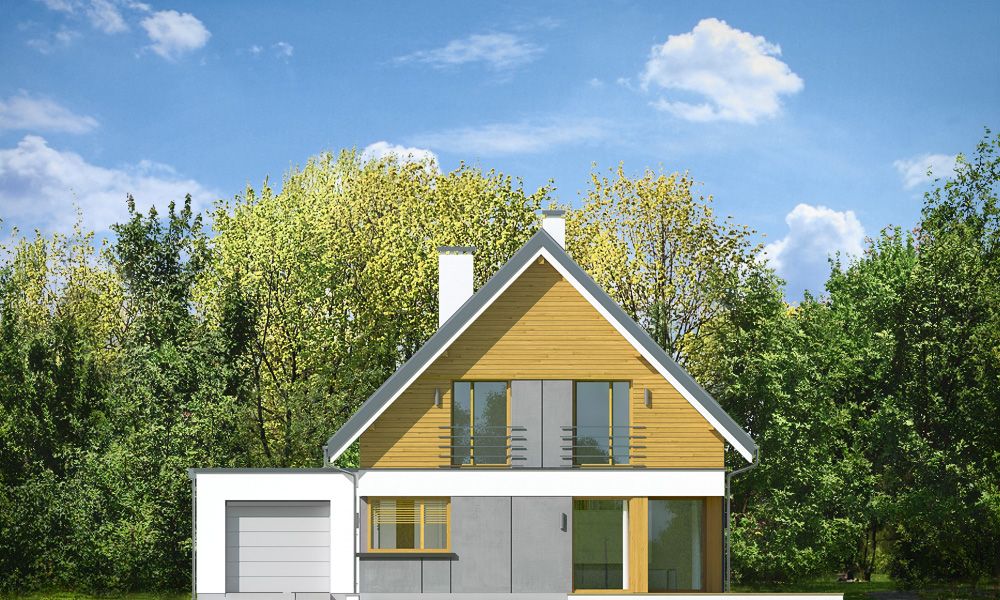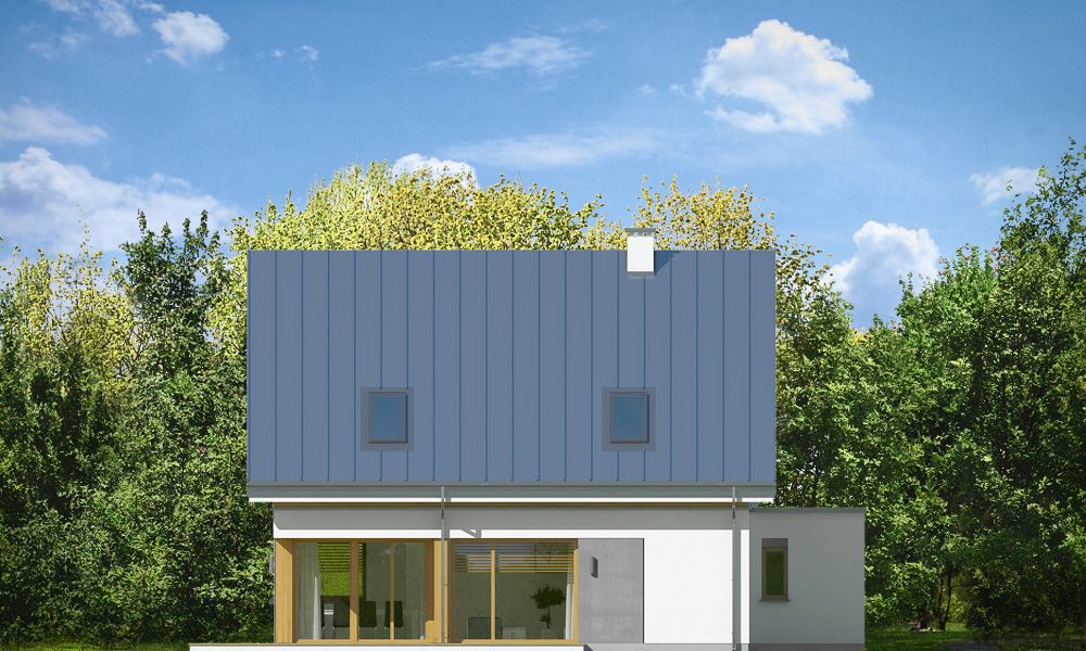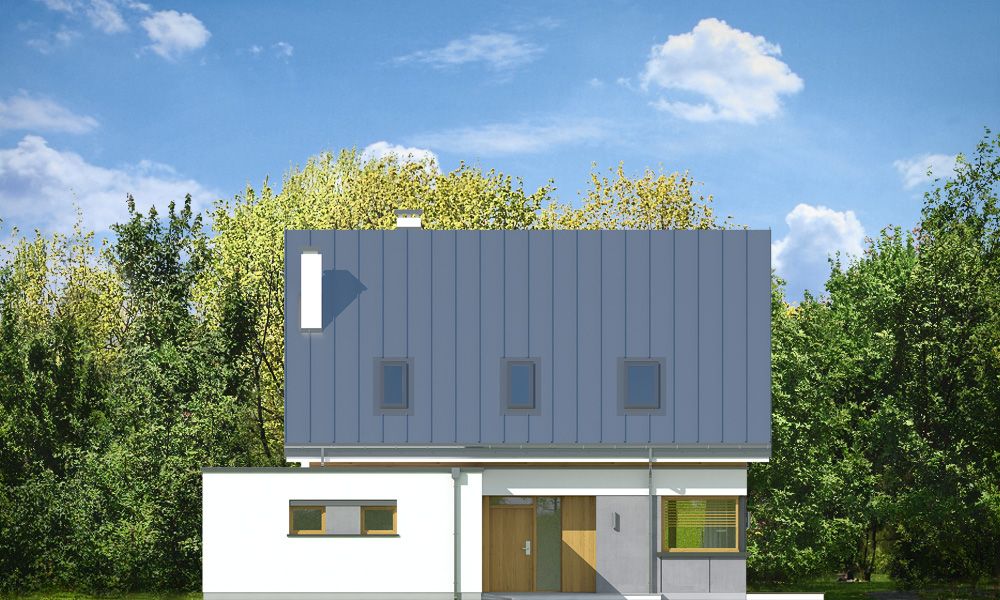 Projekt domu Viking 2 jest jednym z projektów z serii domów "Viking" - pomniejszoną wersją ze zwężoną bryłą główną i pojedynczym garażem. Budynek zaprojektowano na planie prostokąta, przykrytego dwuspadowym symetrycznym dachem, z dobudowanym parterowym garażem. Prosta nowoczesna architektura idzie w parze z funkcjonalnie zaprojektowanym wnętrzem. Front domu zaakcentowano szerokimi drzwiami wejściowym z bocznym naświetlem, umieszczonymi w podcieniu wejściowym, oraz narożnym dużym oknem kuchennym. Drzwi garażowe z boku pozwalają na stworzenie urokliwego placyku wjazdowego przed domem. Co więcej: dzięki temu projekt domu Viking 2 nadaje się zarówno na działkę z wjazdem od północy, jak i od strony południowej (bramą garażową do drogi). Podział elewacji na poziome pasy, okładziny z drewna i z płyt włókowo-cementowych urozmaicają sylwetkę domu. Od strony ogrodowej zaprojektowano duże przeszklenie z salonu i z jadalni, otwierające część dzienną na ogród, oraz ładny podcień zadaszający częściowo taras ogrodowy. Wnętrze: na parterze zaprojektowaliśmy jednoprzestrzenną powierzchnię z połączonych pomieszczeń salonu, jadalni, holu i kuchni ze spiżarnią. Przy schodach przechodzimy do części gospodarczej, z magazynem, kotłownią i garażem. Na poddaszu mamy trzy ładne sypialnie (w tym sypialnię rodziców z garderobą), oraz łazienkę z kącikiem na pralnię. Dom, choć niewielki jest bardzo funkcjonalny. Projekt domu Viking 2 będzie wygodnym miejscem do życia dla 3- 5-osobowej rodziny. Prosta konstrukcja budynku, łatwa zwarta bryła bez żadnych udziwnień, nowoczesne technologie i dobre ocieplenia dają energooszczędny, niedrogi w budowie i późniejszym utrzymaniu dom. Pracownia oferuje też wersję domu w odbiciu lustrzanym, wersję bazową (projekt domu Viking), wersję najmniejszą bez garażu (projekt domu Viking 3), wersję o pow. użytkowej: 156.1 m² (projekt domu Viking 4), oraz wersję największą (projekt domu Viking 5). Vikinga można bardzo łatwo dostosować do standardu NF40. Zapraszamy.