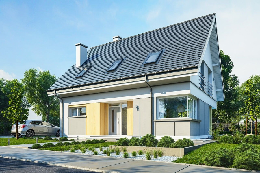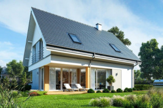 Projekt domu Viking 3 to kolejny dom z serii „Viking” - tym razem najmniejszy z kolekcji, parterowy, z poddaszem użytkowym, bez garażu, przeznaczony dla 3- 4-osobowej rodziny. Budynek ma zwartą prostokątną bryłę przykrytą dwuspadowym symetrycznym dachem. Nowoczesne materiały i detale dają Vikingowi 3 dynamiczny a zarazem pełen uroku wygląd zewnętrzny. Duże przeszklenia, drewniane i włóknowo -cementowe okładziny ścian, podział elewacji na poziome pasy urozmaicają elewacje budynku. Wejście podkreślono podcieniem z dużymi drzwiami z bocznym naświetlem. Elewację ogrodową ozdobiono szerokimi przeszkleniami salonu i jadalni, otwierającymi wnętrze na ogród, oraz narożnym podcieniem stanowiącym częściowe zadaszenie tarasu. Wnętrze domu: na parterze znajduje się salon z aneksem jadalnym, połączony z holem, kuchnia ze spiżarką, kotłownia i wc. Z holu dostępne są wygodne, dobrze oświetlone schody na poddasze. Na górze mamy trzy sypialnie z łazienką i aneksem pralni. Sypialnia rodziców ma swoją garderobę, a pozostałe sypialnie - szafy wnękowe. Projekt domu Viking 3 to prosty, nowoczesny, funkcjonalnie zaprojektowany dom. Będzie niedrogi w budowie i późniejszym utrzymaniu. Jest to propozycja dla Inwestorów, którzy mają nie za wielką działkę i nie mogą lub nie chcą wydać dużych pieniędzy na budowę swojego wymarzonego M. Projekt domu Viking 3 dostępny jest także w odbiciu lustrzanym w wersji bazowej (projekt domu Viking), wersję z pojedynczym garażem (projekt domu Viking 2), z zadaszeniem nad garażem (projekt domu Viking 4), oraz największą z serii (projekt domu Viking 5). Projekt bardzo łatwo można dostosować do standardu NF40. Zapraszamy.
