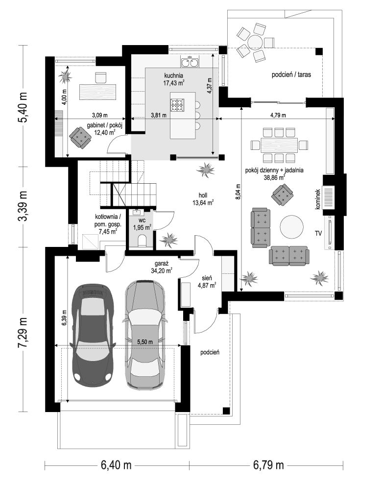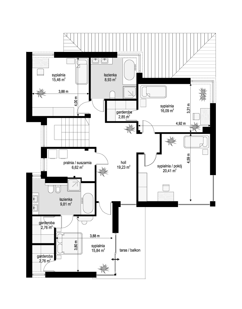 Wariant projektu bez antresoli. Zmiana układu pomieszczeń na piętrze.