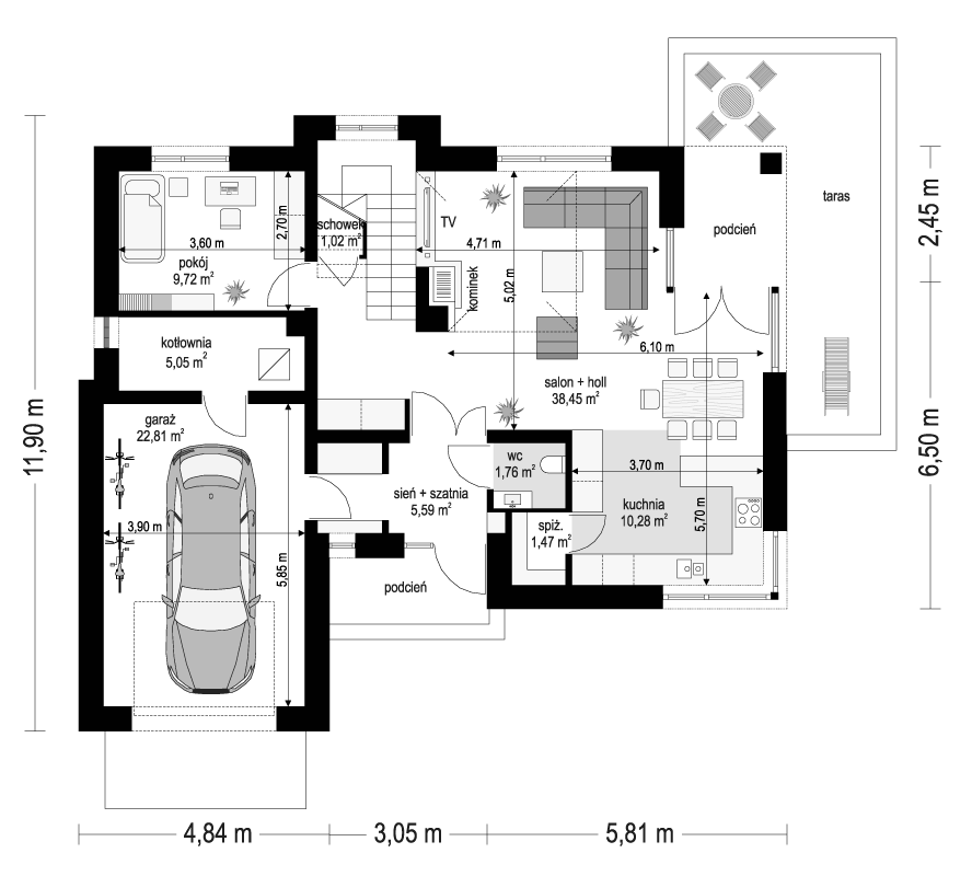 Wariant ze stropem żelbetowym.