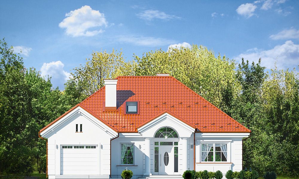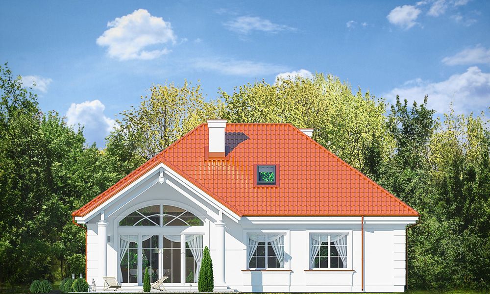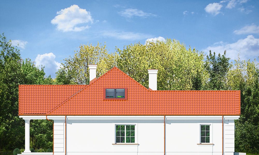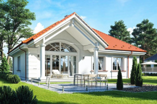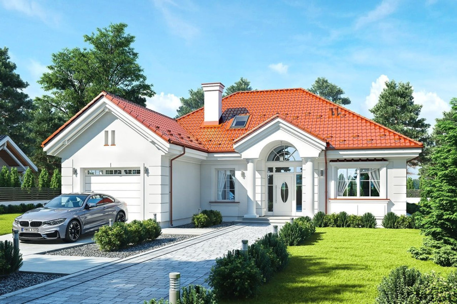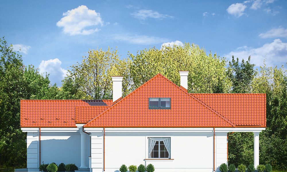 Projekt domu Dom na Parkowej 5 jest to kolejny projekt z popularnej serii „Domów na Parkowej”, czyli wersja z dachem o większym kącie nachylenia, oraz węższej bryle i pojedynczym garażu. Dom na Parkowej 5 jest mniejszy od wersji bazowej i nadaje się na węższą działkę. Dach o kącie 35 stopni z kolei pozwoli sprostać ostrzejszym warunkom zabudowy, a poza tym uzyskujemy nad parterem większe poddasze użytkowe (właściwie strych, który można zaadaptować na poddasze użytkowe jeśli jest taka potrzeba). Architektura domu to nawiązanie do amerykańskich willi z przedmieść, oraz do polskiego dworku, ale w nowocześniejszym ujęciu. Bryła budynku jest prostokątna, przekryta czterospadowym dachem, z dobudowanym wystającym nieco do przodu garażem. W ten sposób przed domem tworzy się większa i bardziej reprezentacyjna część frontowa. Wejście domu zostało podkreślone pięknym frontowym portalem z szerokimi drzwiami z naświetlami po bokach. Od strony ogrodowej mamy z kolei duży zadaszony taras, oraz szerokie przeszklenie łączące salon z tarasem i ogrodem. Wnętrze domu podzielono funkcjonalnie na trzy części: dzienną, nocną i gospodarczo-garażową. Z ładnego przedsionka przechodzimy szerokimi drzwiami na wprost do części dziennej, z salonem, kuchnią i holem. Z części dziennej przechodzimy do sypialni - mamy tutaj trzy sypialnie oraz łazienkę. Sypialnie dzieci mają wbudowane szafy, sypialnia rodziców – garderobę. Z przedsionka możemy też przedostać się do pomieszczenia gospodarczego i garażu. Na strychu mamy miejsce do zaadaptowania na poddasze składające się z dwóch pokoi i łazienki. Projekt domu Dom na Parkowej 5 to doskonała propozycja dla osób planujących niewielki dom, ale nie chcących rezygnować z urody, ani godzić się na maksymalne uproszczenie detalu architektonicznego. Projekt domu Dom na Parkowej 5 dzięki prostej bryle i konstrukcji będzie niedrogi w realizacji, a dom dzięki zastosowaniu nowoczesnych i energooszczędnych materiałów, oraz instalacji, będzie też tani w późniejszej eksploatacji. Zapraszamy do zapoznania się z pełną ofertą pracowni MG Projekt: projekt domu Dom na Parkowej, projekt domu Dom na Parkowej 2, projekt domu Dom na Parkowej 3, projekt domu Dom na Parkowej 4, projekt domu Dom na Parkowej 6, projekt domu Dom na Parkowej 7 A, projekt domu Dom na Parkowej 7 B.