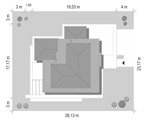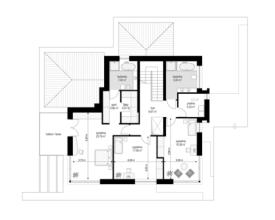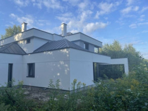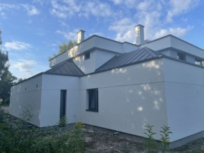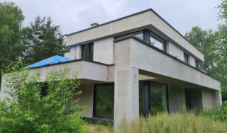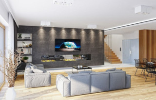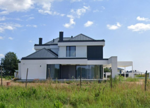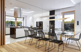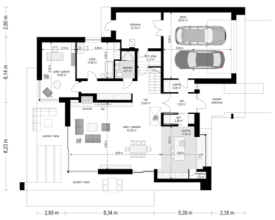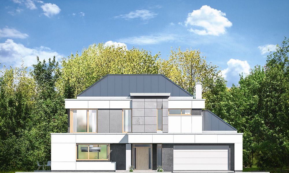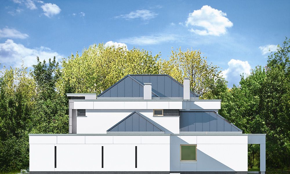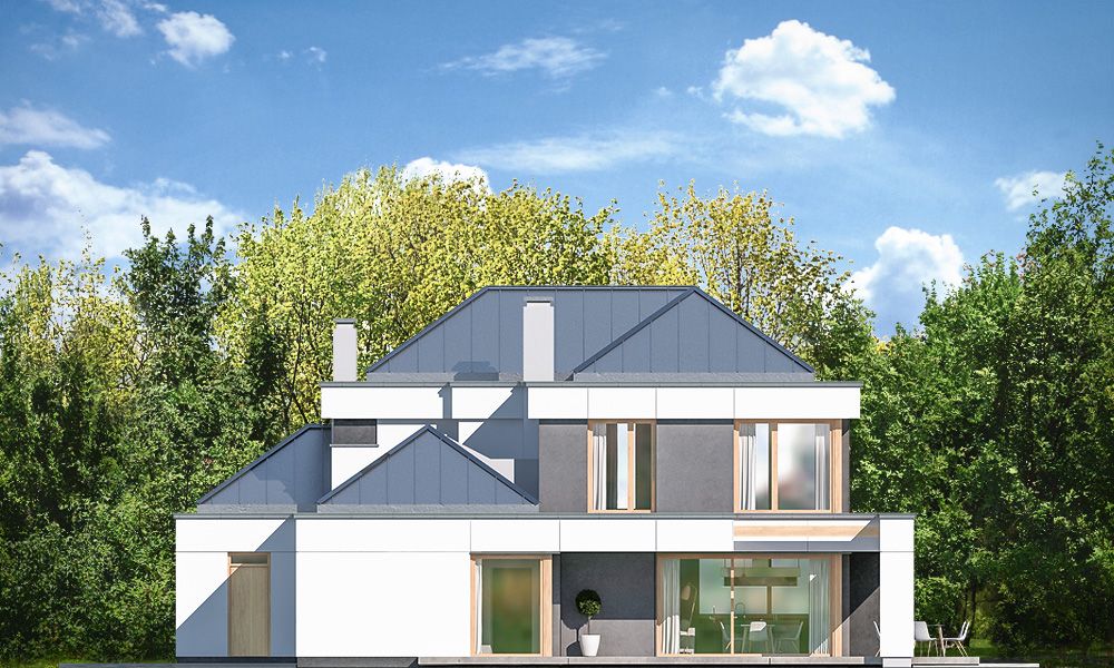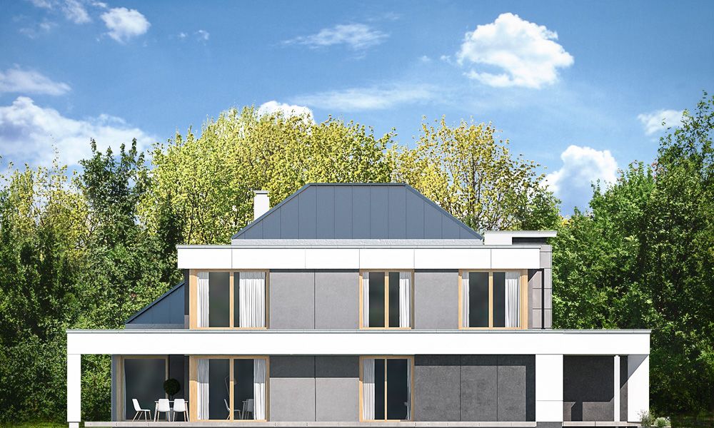 Projekt domu Willa Floryda 3 jest naszą kolejną propozycją projektu z serii nowoczesnych rezydencji Willa Floryda. Dom estetycznie i architektonicznie nawiązuje do serii "Floryd", natomiast układ funkcjonalny i wygląd są zupełnie inne. Budynek jest piętrowy, z dwukondygnacyjnym rdzeniem obudowanym parterowymi częściami od frontu i z tyłu. Dzięki temu bryła jest bardzo urozmaicona i wygląda lekko. Rezydencja Willa Floryda 3 łączy w sobie zalety budynku piętrowego i parterowego, będącego blisko ogrodu i w ludzkiej skali. Elewacje podzielono na poziome pasy: ciemne pasy w grubości kondygnacji i okien, oraz kontrastujące białe pasy w grubości stropów. Jasne części elewacji wystają do przodu, natomiast ciemniejsze fragmenty ścian chowają się, dzięki czemu bryła jest ciekawsza i bardziej rozrzeźbiona. Wejście do domu Willa Floryda 3 zaakcentowane jest pięknym podcieniem, oraz masywną ścianą wykończoną kamieniem, lub betonem architektonicznym. Narożne okno kuchni i przeszklenia piętra dodają frontowi domu lekkości i transparentności. W prawdziwy sposób dom otwiera swoje wnętrze od strony ogrodu. Narożne przeszklenia salonu i sypialni u góry łączą wnętrze z ogrodem. Jednocześnie podcień i pergola oparta na wystającym słupie i podciągu tworzą wewnętrzną przestrzeń tarasową - swoiste patio chroniące prywatność mieszkańców. Nowoczesna sylwetka domu z pewnością wyróżni tą piękną rezydencję z otaczającej nudnej zabudowy. Parter domu Willa Floryda 3 zaprojektowano na planie zbliżonym do kwadratu. Do budynku wchodzimy przez obszerny przedsionek z szatnią, połączony z garażem z jednej strony i spiżarnią i kuchnią z drugiej. W ten sposób zarówno wejście do domu piechotą, jak i przyjazd autem jest wygodny i prowadzi nas w to samo miejsce. Z przedsionka przedostajemy się do holu, z reprezentacyjnymi schodami po prawej i otwartą dużą przestrzenią dzienną po lewej stronie. Pokój dzienny, jadalnia i kuchnia z wyspą łączą się we wspólną niemal 90-metrową powierzchnię. Salon otwiera się na narożny taras w kształcie litery "L". Na parterze mamy jeszcze dodatkową przestrzeń - dwa pokoje o dowolnym przeznaczeniu - rzadkość w piętrowych domach. Mogą to być sypialnie, lub pokoje do pracy czy rekreacji. Albo może to być wydzielone dodatkowe mieszkanko dla seniorów, lub gosposi. Przestrzeń do dowolnej aranżacji. Z domu Willa Floryda 3 i z garażu dostajemy się też do dużego pomieszczenia gospodarczego - kotłowni. Piętro domu to trzy sypialnie: apartament rodziców z własnymi garderobami i łazienką, oraz sypialnie dzieci z szafami wbudowanymi i łazienką dostępną z holu. Na piętrze mamy też pralnię. Hol piętra połączony jest z parterem otworem schodów, oraz niewielką dziurą w stropie. Projekt domu Willa Floryda 3 jest nowoczesny, luksusowy i komfortowy. Oczywiście projekt Willa Floryda 3 jest budynkiem energooszczędnym - dzięki zastosowanym materiałom i instalacjom. Zapraszamy do zapoznania się z pełną ofertą pracowni MG Projekt: projekt domu Willa Floryda, projekt domu Willa Floryda 2, projekt domu Willa Floryda 4, projekt domu Willa Floryda 5, projekt Rezydencja Floryda, projekt Rezydencja Floryda 2, projekt domu Willa Floryda 6, projekt domu Willa Floryda 7, projekt domu Willa Floryda 8.