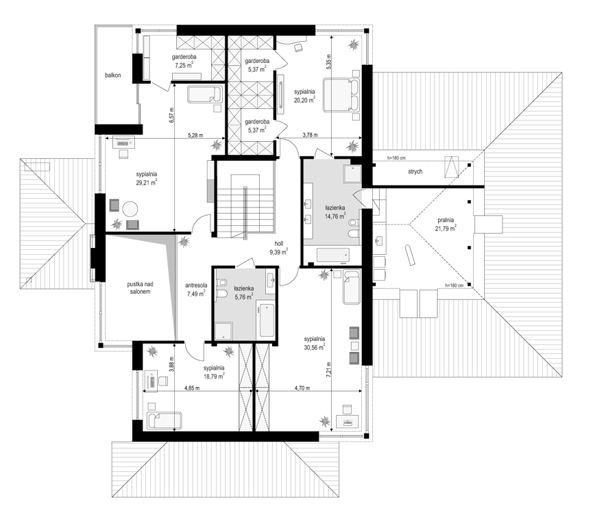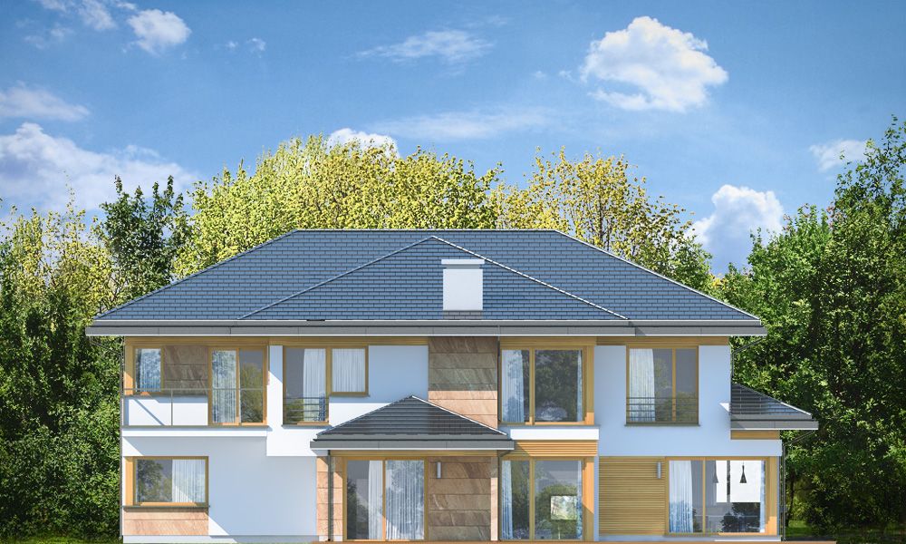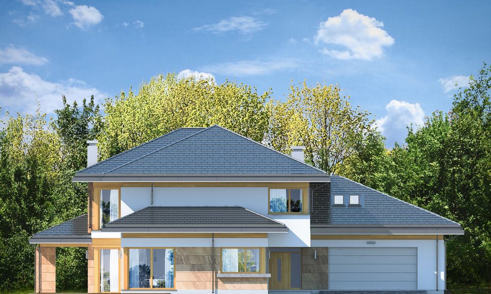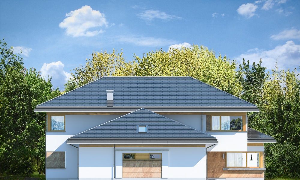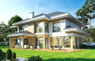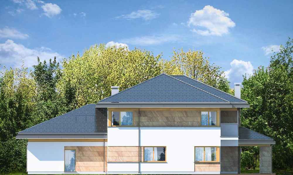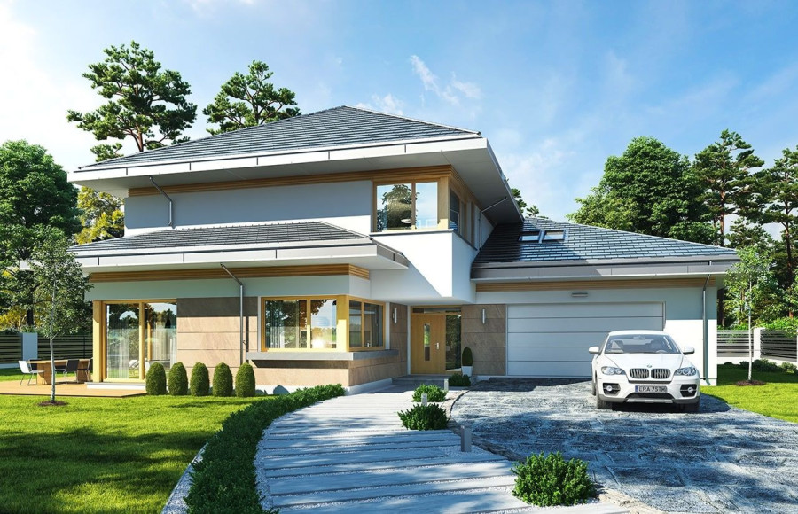 Projekt domu Dom z Widokiem E to wersja wariantowa popularnego projektu Dom z Widokiem. Projekt różni się od podstawowego wariantu zwiększoną bryłą i powierzchnią zabudowy (główna bryła budynku przedłużona jest o niemal 2 metry), oraz zmienionym – zmniejszonym nachyleniem połaci dachowych, przez co budynek jest trochę niższy. Dom jest też nieco węższy – ma węższy salon, przez co zmieści się na węższej działce i ma węższą elewację frontową niż w podstawowym projekcie. Projekt domu Dom z Widokiem E został zaprojektowany jako dwukondygnacyjna nowoczesna miejska willa, składająca się z głównej piętrowej bryły przykrytej czterospadowym dachem, oraz dobudowanej części garażowej -parterowej, przykrytej trzyspadowym niższym dachem. Wygląd domu podkreślają charakterystyczne narożne duże przeszklenia , oraz ściany podzielone poziomymi pasami o zróżnicowanym wykończeniu - z kamienia, drewna lub tynku. Elewacja ogrodowa (boczna) przez cofnięcie salonu jest niemal jedną długą ścianą otwierającą dom na otaczający ogród. Wejście domu podkreślone jest wciętym podcieniem z podestem i szerokimi drzwiami wejściowymi z naświetlami. Od strony ogrodu z kolei elewację ozdabia częściowe zadaszenie tarasu i szerokie okna balkonowe. Wnętrze domu podzielono na część dzienną i gospodarczą na parterze, oraz sypialnie na piętrze. Do domu wchodzimy obszernym przedsionkiem z szatnią wprost do reprezentacyjnego holu i dalej do salonu, jadalni i kuchni. Nad salonem nie przewidziano pustki - jedynym połączeniem przestrzeni parteru z piętrem jest szeroki otwór schodów dwubiegowych. Na parterze przewidziano też dodatkowy pokój - gabinet lub sypialnię gościnną, łazienkę, kotłownię, oraz ładny garaż z zapleczem gospodarczym. Na piętrze mamy trzy bazowe sypialnie z dwiema łazienkami (w tym apartament rodziców z łazienką i garderobą), oraz miejsce na dodatkowe dwa pokoje – przestrzeń do dowolnego wykorzystania i aranżacji. Projekt domu Dom z Widokiem E jest luksusową willą o dużej przestrzeni, do wygodnego komfortowego mieszkania. Dla dowolnie dużej rodziny. Budynek dzięki zastosowaniu energooszczędnych rozwiązań instalacyjnych i nowoczesnych ciepłych materiałów, będzie niedrogi w późniejszej eksploatacji. Zapraszamy do zapoznania się z pełną ofertą pracowni MG Projekt tej serii: Dom z Widokiem, Dom z Widokiem 2, Dom z Widokiem 2C, Dom z Widokiem 3, Dom z Widokiem 3F, Dom z Widokiem 4, Dom z Widokiem 5, Dom z Widokiem 6, Dom z Widokiem 6B, Dom z Widokiem B.