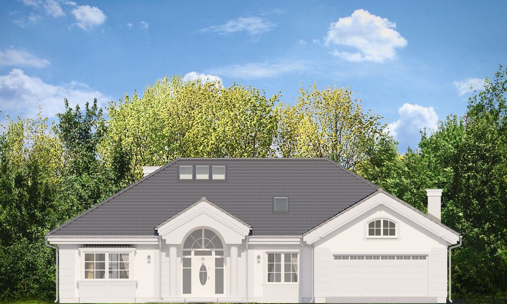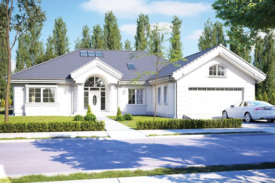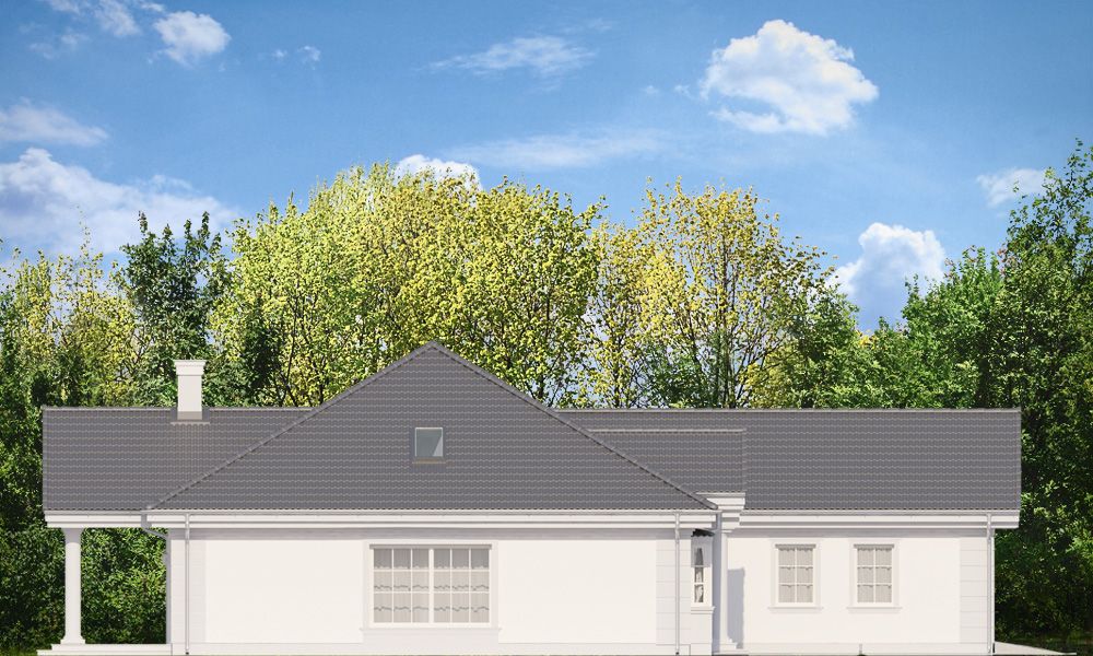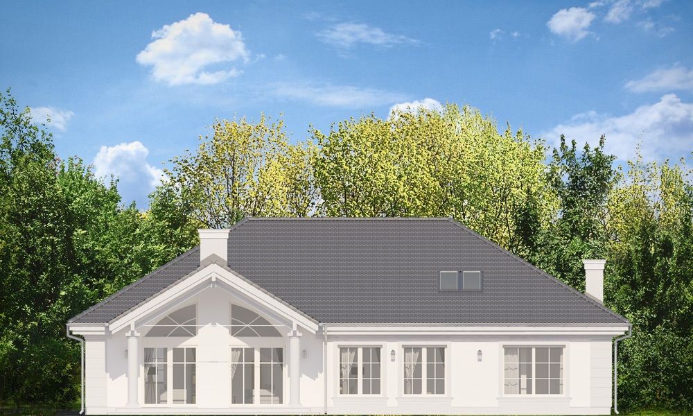 Projekt domu Rezydencja Parkowa 3 C jest to kolejny wariant cieszącego się popularnością projektu z serii Rezydencja parkowa. Budynek został zaprojektowany jako bardziej zwarty, ze ściślejszą - przede wszystkim węższą o niemal 3 metry od bazowego projektu bryłą. Powierzchnia użytkowa oraz powierzchnia zabudowy domu jest mniejsza, stąd też niższy o blisko 15 % koszt budowy domu. Budynek jest podmiejską elegancką rezydencją wzorowaną na willowej przedwojennej zabudowie. Projekt domu Rezydencja Parkowa 3 C łączy w sobie klasyczną, ponadczasową formę, z nowoczesną funkcją oraz zastosowanymi materiałami i technologiami. Front domu zdobi reprezentacyjny portal wejściowy z pięknymi drzwiami wejściowymi, z naświetlami bocznymi i górnym. Od strony elewacji ogrodowej mamy natomiast piękne zadaszenie tarasu w wielkim oknem salonu, otwierającym wnętrze na ogród. Wnętrze domu zaplanowano jako jednokondygnacyjne mieszkanie tylko na parterze. Na górnej kondygnacji mieści się strych, który może być pozostawiony jako wolna przestrzeń, albo zagospodarowany w dowolny sposób jako poddasze użytkowe. Na parterze mamy podział wnętrza na trzy części: część dzienną, nocną i gospodarczo-garażową. W części dziennej mieści się piękny salon z otwarciem przestrzennym (z dziurą w suficie), jadalnia, hol, kuchnia z wyspą i spiżarnią, oraz duża wygodna sień z szatnią i przejściem do garażu. W części nocnej mamy dwie sypialnie, z łazienką, garderobą i pralnią, oraz schody na strych (który może być dodatkowym poddaszem). W części gospodarczej mamy ładną szatnię łączącą garaż z sienią, bardzo duże pomieszczenie gospodarcze / kotłownię, oraz garaż na dwa auta. Dom został zaprojektowany z myślą o trzyosobowej rodzinie, która lubi mieć dużą przestrzeń i z racji tego, że nie jest wielką familią nie ma ochoty gnieździć się w stumetrowym domu. Projekt domu Rezydencja Parkowa 3 C nie ma wielu pokoi - bo nie ma tutaj takiej potrzeby, ale jest bardzo wygodny i komfortowy. Pomieszczenia są duże i ustawne. Do tego towarzyszy im cała masa pomieszczeń i przestrzeni pomocniczej. Nadto na górze mamy jeszcze dużą przestrzeń strychu do adaptacji na poddasze. Dom jest komfortowy, spory, w na tyle rozsądnej skali, żeby budowa nie doprowadziła przyszłych mieszkańców do bankructwa. Dzięki energooszczędnym rozwiązaniom i nowoczesnym instalacjom dom będzie również niedrogi – jak na swoją wielkość - w utrzymaniu. Zapraszamy do zapoznania się z pełną ofertą pracowni MG Projekt: Rezydencja Parkowa, Rezydencja Parkowa 2, Rezydencja Parkowa 3, Rezydencja Parkowa 3 B, Rezydencja Parkowa 3 D, Rezydencja Parkowa 4.