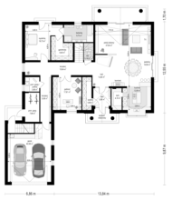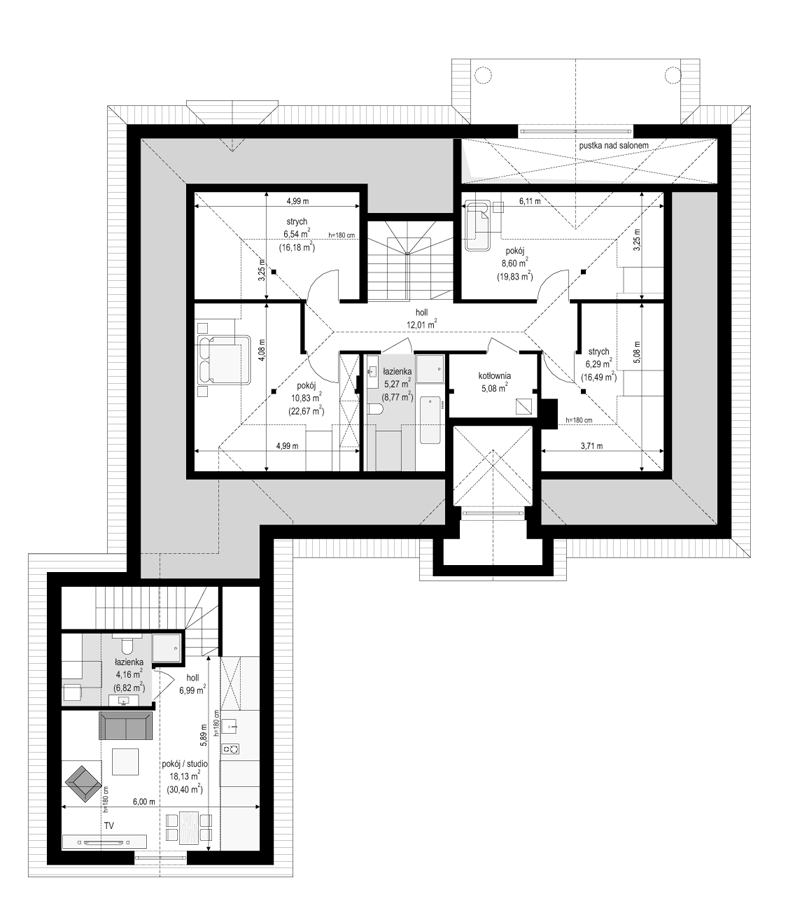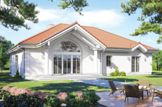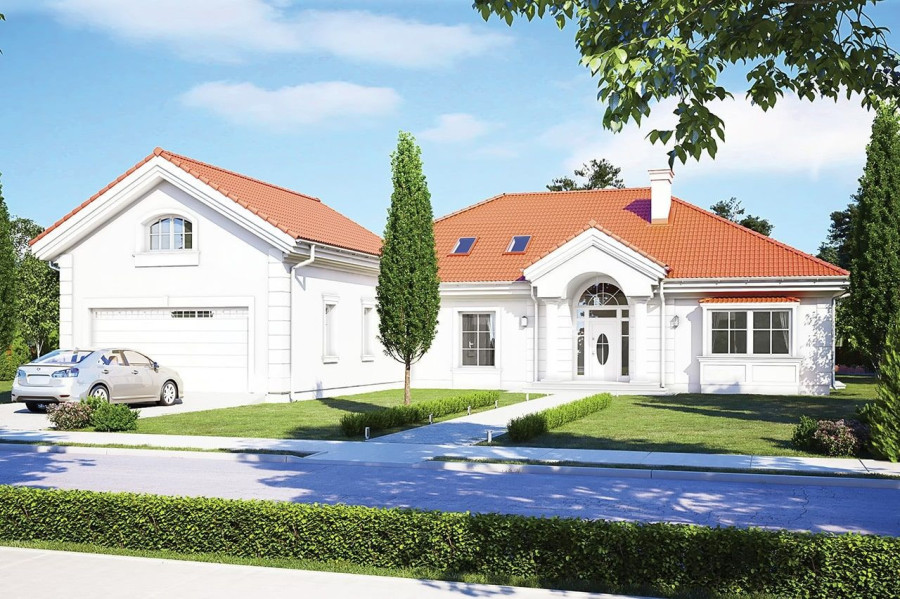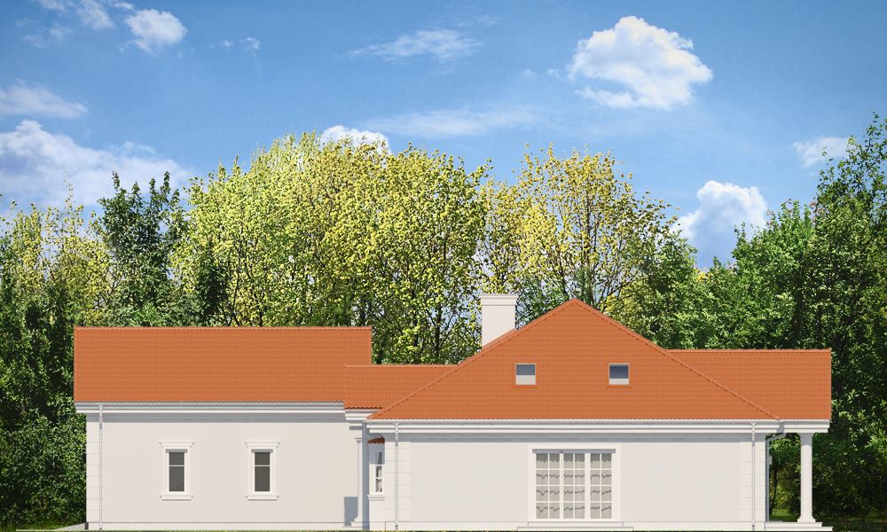 Projekt domu Rezydencja Parkowa 3 D jest to kolejny projekt domu z docenionej przez Klientów kolekcji „Rezydencja parkowa”. Tym razem jest to projekt Rezydencja parkowa 3 wariant D. Projekt choć zachowuje ogólnie podobną stylistykę i detale, to jednak różni się zasadniczo od bazowej wersji. Przede wszystkim budynek jest zwężony, zmniejszony, ma zagospodarowane poddasze, a prócz tego ma przewidziane nad garażem na poddaszu dodatkowe mieszkanko – służbówkę dla gosposi. Architektura domu Rezydencja Parkowa 3 D nawiązuje do polskiego dworku, oraz do detali amerykańskich rezydencji. Elewacja frontowa urozmaicona jest pięknym wejściowym podcieniem z kolumnami i łukowym oknem. Dobudowana część garażowa tworzy boczą oficynę, a cały front układa się w literę L. Od strony ogrodu dom ozdabia szeroki podcień nad tarasem i piękne wysokie łukowe okno salonu, otwierające wnętrze na ogród. Kilka słów o wnętrzu: Na parterze przewidziano otwartą część dzienną salonu połączonego z jadalnią i holem. Przestrzeń dzienna otwiera się szerokim podwyższonym przeszkleniem na obszerny podcień, taras i ogród. Wysokie okno w salonie zastosowano dzięki pustce nad częścią salonu, które otwiera wnętrze aż do sufitu. Z boku przy obszernej sieni mamy zaprojektowaną piękną kuchnię ze spiżarnią. W części prywatnej parteru przewidziano część państwa domu: sypialnię z łazienką i garderobą, oraz duży gabinet – bibliotekę. W skrzydle gospodarczym budynku mamy dwustanowiskowy wygodny garaż, dwa pomieszczenia gospodarcze (w tym pralnię) , oraz osobne wejście i schody na poddasze nad garażem z osobnym mieszkaniem dla gosposi. Na poddaszu domu zaprojektowano dwie wygodne sypialnie, łazienkę i dodatkowe dwa pomieszczenia strychowe, bądź magazynowe. Dom Rezydencja Parkowa 3 D jest komfortową, reprezentacyjną willą dla 3- 4-osobowej rodziny. Zwarta bryła i przemyślana konstrukcja zapewni szybką i efektywną budowę, a zastosowane w projekcie energooszczędne materiały i technologie zapewnią niedrogie koszty późniejszego utrzymania domu. Zapraszamy do zapoznania się z pełną ofertą pracowni MG Projekt: Rezydencja Parkowa, Rezydencja Parkowa 2, Rezydencja Parkowa 3, Rezydencja Parkowa 3 B, Rezydencja Parkowa 3 C, Rezydencja Parkowa 4.