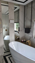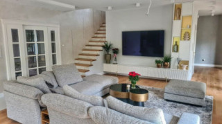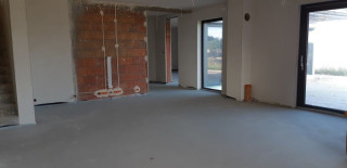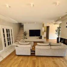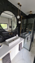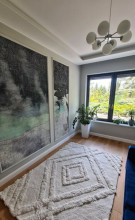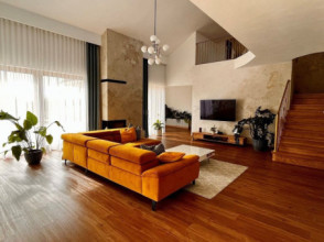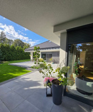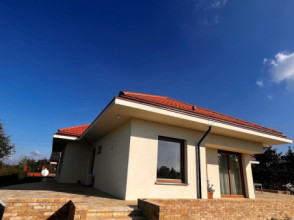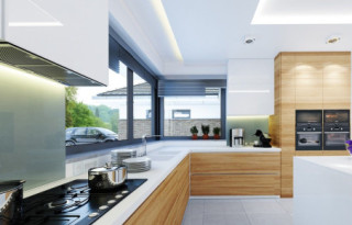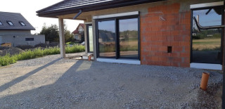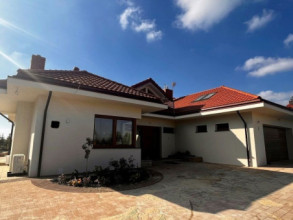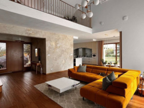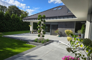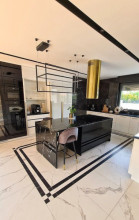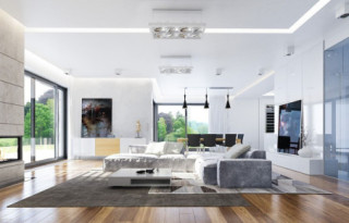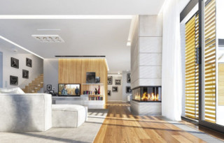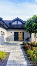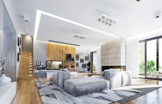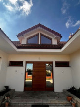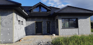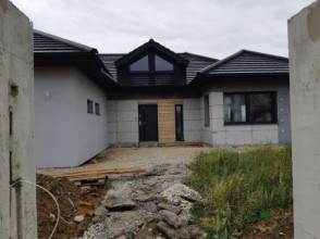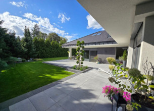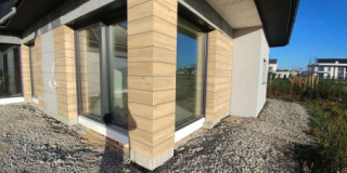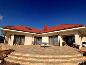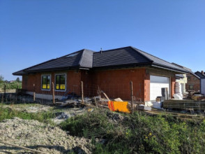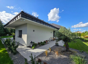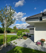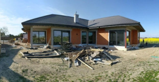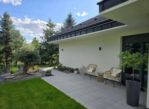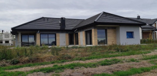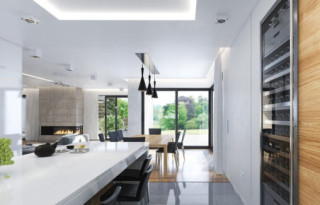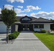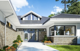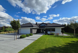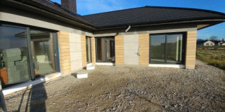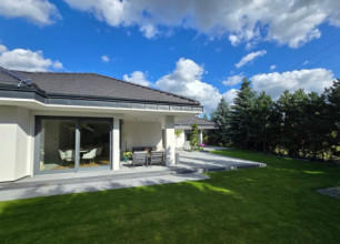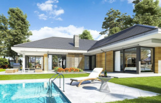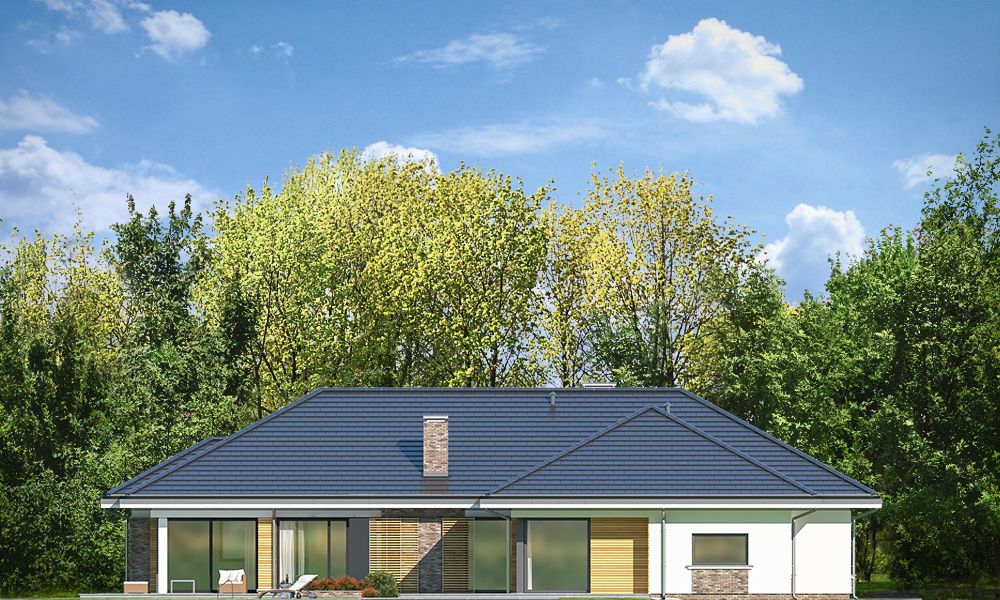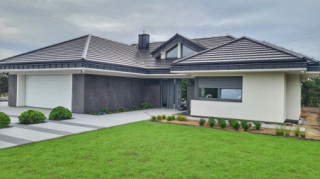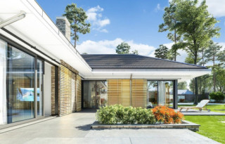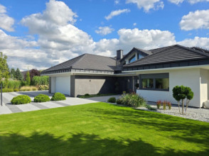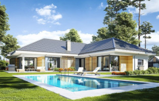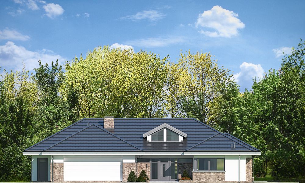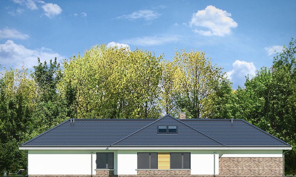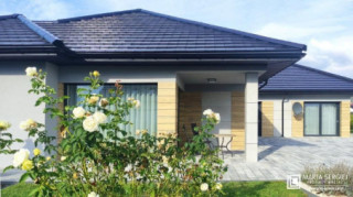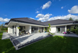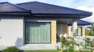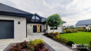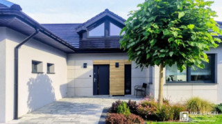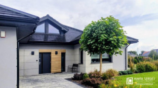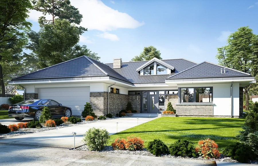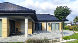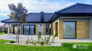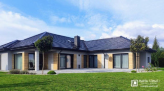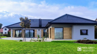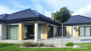 Projekt domu Wyjątkowy to komfortowy parterowy dom jednorodzinny z serii projektów domów „Wyjątkowy”. Dom to luksusowa podmiejska willa, zaprojektowana całkowicie na jednej kondygnacji, co daje mieszkańcom wygodę mieszkania na parterze bez biegania po schodach i nieocenioną bliskość z otaczającym ogrodem. Dom zaprojektowano na planie litery „T”, z wystającym przed front budynku garażem, oraz wchodzącą do ogrodu częścią z sypialniami. Budynek przykryty jest wielospadowym łagodnym dachem kryjącym strych, który można zagospodarować jako dodatkowe poddasze użytkowe. Nowoczesna architektura budynku, z dużymi przeszkleniami, narożnymi oknami, suwanymi żaluzjami, łączy tradycyjną formę domu z nowoczesnym detalem architektonicznym. W efekcie mamy rozłożysty luksusowy bungalow. Do domu wchodzimy szerokim, reprezentacyjnym wejściem z bocznymi naświetlami, przez frontowe patio, z pięknymi klombami z zielenią po bokach podestu wejściowego. Z obszernego przedsionka przechodzimy na wprost do przestrzeni dziennej, do wielkiego salonu, z którego, przez duże przeszklenia, rozpościera się widok na taras i ogród. Z przedsionka możemy również przejść na boki do: szatni i dalej pomieszczeń gospodarczych i garażu, oraz przez spiżarnię do kuchni. Przestrzeń dzienna to salon, jadalnia, oraz piękna kuchnia z wyspą. Z salonu i jadalni wychodzimy na otaczające dom tarasy. W części nocnej mamy: apartament rodziców, z łazienką, garderobą i pięknymi oknami na taras, dodatkowy pokój - gabinet, dwie sypialnie dziecięce z łazienką, dodatkowe wc dla gości, oraz mini-salonik - bawialnia, lub kącik telewizyjny. Z części nocnej mamy też dostępną pralnię, w pobliżu sypialni. Projekt domu Wyjątkowy ma bardzo funkcjonalnie zaprojektowane wnętrze, ułatwiające codzienne życie. Otwarte przestrzenie, oraz przeszklenia łączące wnętrze z ogrodem dadzą nieocenione poczucie luksusu i wysokiej jakości życia. A to wszystko osiągnięto na w sumie niewielkiej powierzchni i w dość prostym w budowie budynku. Projekt domu Wyjątkowy jest doskonałym przykładem tego, że bardzo dobry efekt można czasem osiągnąć z rozsądny i nie koszmarnie drogi sposób. Dom jest oczywiście energooszczędny, zaprojektowany z nowoczesnych materiałów. Zapraszamy do zapoznania się z innymi projektami pracowni MG Projekt tej serii: Wyjątkowy 2, Wyjątkowy 3.