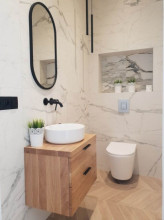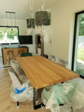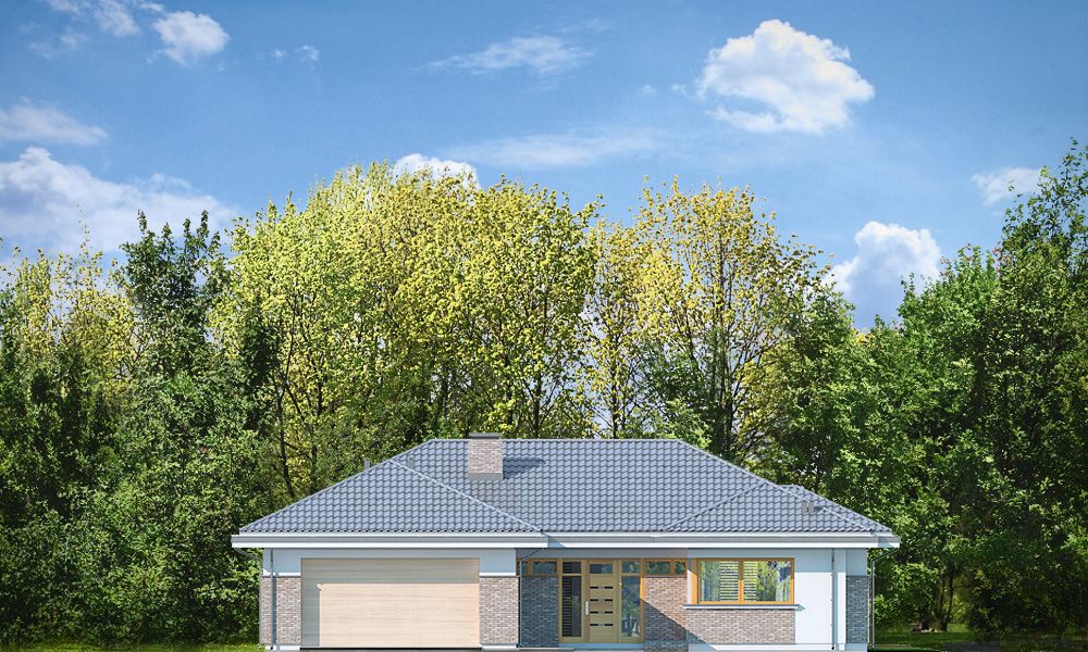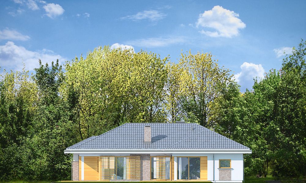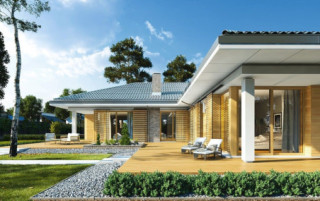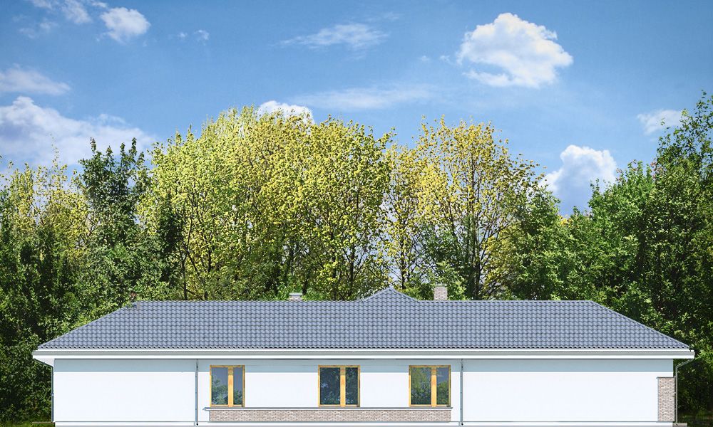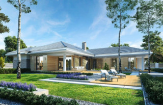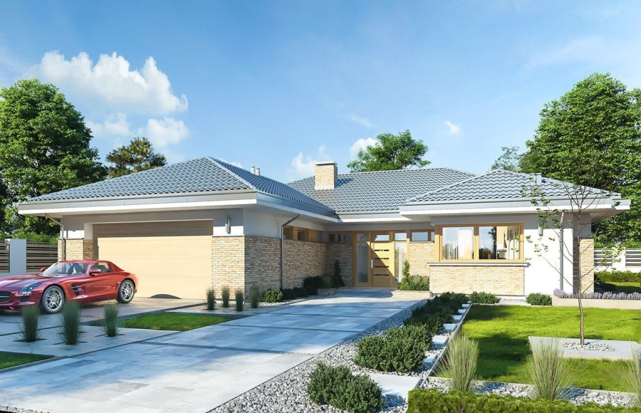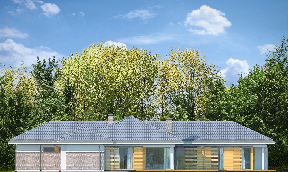 Projekt domu Wyjątkowy 3 jest kolejną propozycją domu jednorodzinnego z serii domów „Wyjątkowych”. Dom jest superkomfortową parterową podmiejską willą, przeznaczoną dla rodziny 4- 6-osobowej, która ceni sobie luksus mieszania na jednej konsygnacji, bez biegania po schodach i bliski kontakt z otaczającym dom ogrodem. Dom Wyjątkowy 3 zaprojektowano w podobnym układzie co pozostałe projekty "Wyjątkowe", z tą różnicą, że nadaje się on na węższą działkę. Bryła budynku, zbudowana na planie litery „T” jest nieco węższa, za to głębiej wchodzi w ogród działki. Bryła domu przykryta jest łagodnym wielospadowym dachem. Architektura nawiązuje do stylu amerykańskich bungalowów. Dom Wyjątkowy 3 ma nowoczesny wygląd, ładne detale Architektoniczne. Duże przeszklenia otwierają wnętrze na tarasy i ogród. Reprezentacyjne wejście z szerokimi drzwiami z naświetlami zaprasza nas do wnętrza domu. Wnętrze podzielono na część dzienną, na którą składają się: piękny salon, jadalnie, wielka kuchnia z wyspą i spiżarnią, oraz część prywatną z czterema sypialniami i dwiema łazienkami, a wreszcie część gospodarczo – garażową domu, z garażem, kotłownią i pralnią. Sypialnia rodziców to osobny apartament z własną łazienką i garderobą. Projekt domu Wyjątkowy 3 to bardzo przestronny i wygodny dom. Zarówno funkcjonalne wnętrze, jak i bezpretensjonalna pełna uroku architektura zewnętrzna domu sprawi, że mieszkańcom będzie się w nim mieszkać naprawdę „wyjątkowo” dobrze. W projekcie zastosowano nowoczesne materiały i energooszczędne technologie. Budynek - wbrew pozorom, nie jest skomplikowany w budowie, a koszt jego późniejszej eksploatacji nie będzie bardzo wysoki. Zapraszamy do zapoznania się z innymi projektami pracowni MG Projekt tej serii: Wyjątkowy, Wyjątkowy 2.