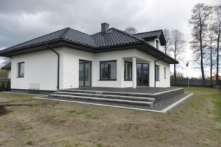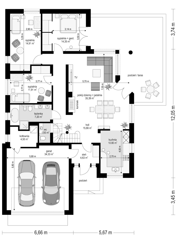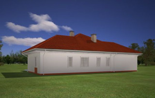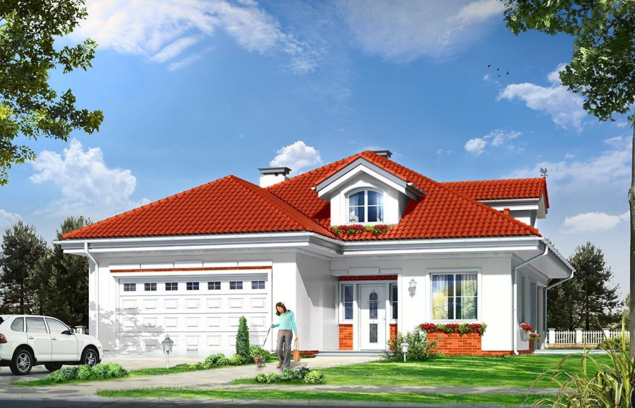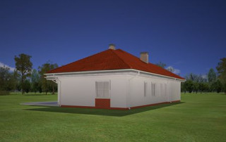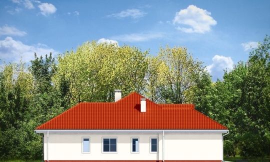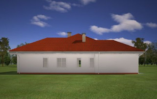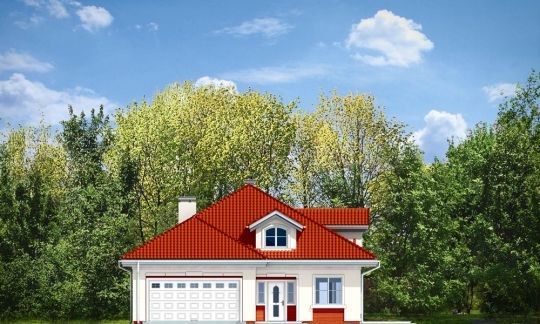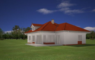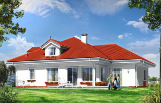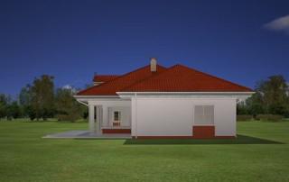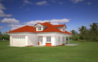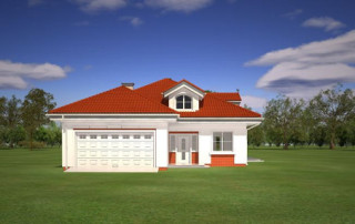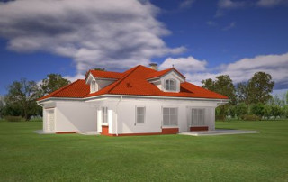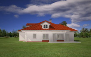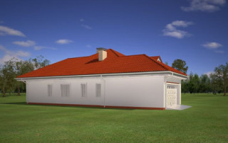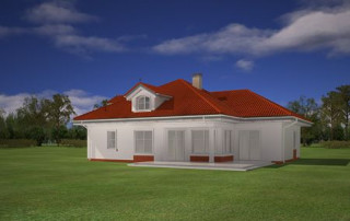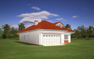 Projekt domu Afrodyta to parterowy domek jednorodzinny, przeznaczony dla czterech osób. Projekt domu Afrodyta to budynek o prostokątnej bryle, z wciętym tarasem i wystającym częściowo garażem. Dom przekryty jest kopertowym dachem kryjącym obszerny strych z lukarnami, mogący służyć po zaadaptowaniu jako poddasze w budynku. Projekt Afrodyta architektura i wnętrze Architektura gotowego projektu Afrodyta cieszy oko właściwymi proporcjami, ludzką skalą budynku i starannym detalem wykończenia. Projekt domu Afrodyta dedykowany jest na dość wąskie działki, lub parcele mające ogród z boku budynku. Wnętrze projektu Afrodyta to jednopoziomowa parterowa przestrzeń podzielona na funkcję dzienną, nocną i gospodarczo-techniczną. W projekcie zaplanowano przestronny salon z dużymi przeszkleniami na taras i ogród, który łączy się z holem i kuchnią. Przez odgrodzony ścianą telewizyjno-kominkową korytarz przechodzi się do trzech sypialni z garderobami i łazienką. Z kolei z przedsionka projektu Afrodyta dostać się można do dużego garażu i kotłowni. Jeśli domownikom zamarzy się dodatkowy pokój lub pokoje - wystarczy zaadaptować na cele użytkowe strych, na który wchodzi się zabiegowymi schodami. Zaletą domu jest możliwość etapowego wykańczania wnętrza, co pozwoli na zmniejszenie kosztu budowy w początkowej fazie realizacji budynku. Dom można zrealizować na działce o szerokości min 20,03 m i długości 27,23 m. Projekt domu Afrodyta z MGProjekt dostępny jest także w wersji odbicia lustrzanego budynku.