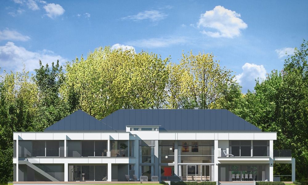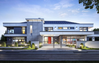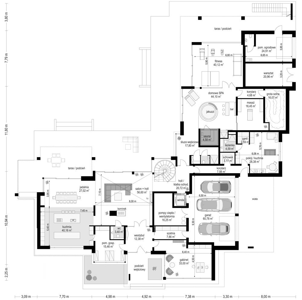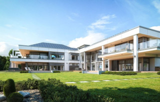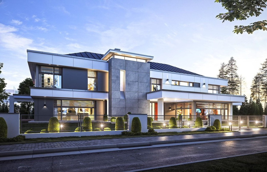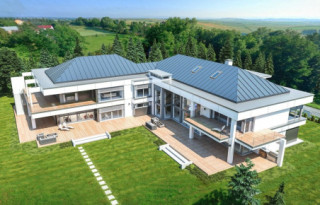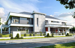Projekt domu Rezydencja Floryda jest to projekt luksusowej rezydencji, naszej największej propozycji z serii domów Willa Floryda. Tym razem, ze względu na wielkość i wyjątkowy styl domu otrzymał on zasłużoną nazwę Rezydencja Floryda. Dom jest rzeczywiście prawdziwie luksusową, niezwykle komfortową rezydencją - mieszkaniem dla dowolnie dużej rodziny. Rozbudowany program funkcjonalny sprawia, że ma dużą powierzchnię, ale zagłębiając się w projekt wyraźnie widać, że żadna powierzchnia nie jest tutaj bezsensownie zmarnotrawiona. To po prostu spełnienie marzenia o super luksusowym domu, w którym mieszkańcy będą zawsze czuli wygodę, przestrzeń, nie będą się przeciskali wąskimi korytarzykami, ani gnieździli w małych pokoikach. Rezydencja Floryda to dom, który jest w stanie ugasić głód przestrzeni dla Inwestora takiej przestrzeni spragnionego. Architektura zewnętrzna domu nie pozostawia żadnej wątpliwości - Rezydencja Floryda jest nowoczesną willą, która ma robić wrażenie na jego mieszkańcach, odwiedzających gościach i osobach przechodzących ulicą. Elewacje domu są otwarte wielkimi przeszkleniami na ogród, potęgując wrażenie przestrzeni wnętrza. To nie jest dom dla skromnisiów. Projekt domu Rezydencja Floryda składa się z dwóch prostopadłościennych brył, połączonych i tworzących literę "L" zamykającą w ten sposób rozbudowane tarasy i ogród w zacisznej kameralnej enklawie. Reprezentacyjne wejście kieruje nas wprost do wnętrza domu. Już od samego wejścia powala nas piękny widok na dwukondygnacyjny salon z wielkimi przeszkleniami otwierającymi wnętrze na ogród. Na lewo mamy kuchnię, jadalnię i zespół pomieszczeń pomocniczych. Przy wejściu z prawej strony piękny gabinet - biuro. Dalej przechodzimy do bardzo dużego garażu z wiatą, pomieszczeń gospodarczych, oraz - w drugiej bryle, do rozbudowanej części rekreacyjno - sportowej domu, z siłownią i mini Spa. Na piętrze mamy kilka osobnych apartamentów dziecięcych i dla gości, oraz superluksusową część państwa domu, z garderobą wielkości niejednej kawalerki (czyż nie o takim luksusie marzy niejedna Pani…). Projekt domu Rezydencja Floryda z pewnością jest domem dla osób z naprawdę grubym portfelem. Decydując się na budowę domu według tego projektu macie Państwo gwarancję, że głód przestrzeni i szaleństwo posiadania wielkiego domu są tutaj okiełznane i bardzo zracjonalizowane - bez przesadnej ostentacji i epatowania. Efekt jest piorunujący. Zapraszamy do zapoznania się z pełną ofertą pracowni MG Projekt: Rezydencja Floryda 2, Willa Floryda, Willa Floryda 2, Willa Floryda 3, Willa Floryda 4, Willa Floryda 6, Willa Floryda 7, Willa Floryda 8.
