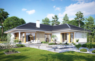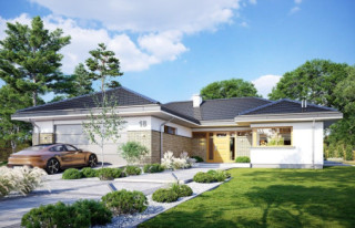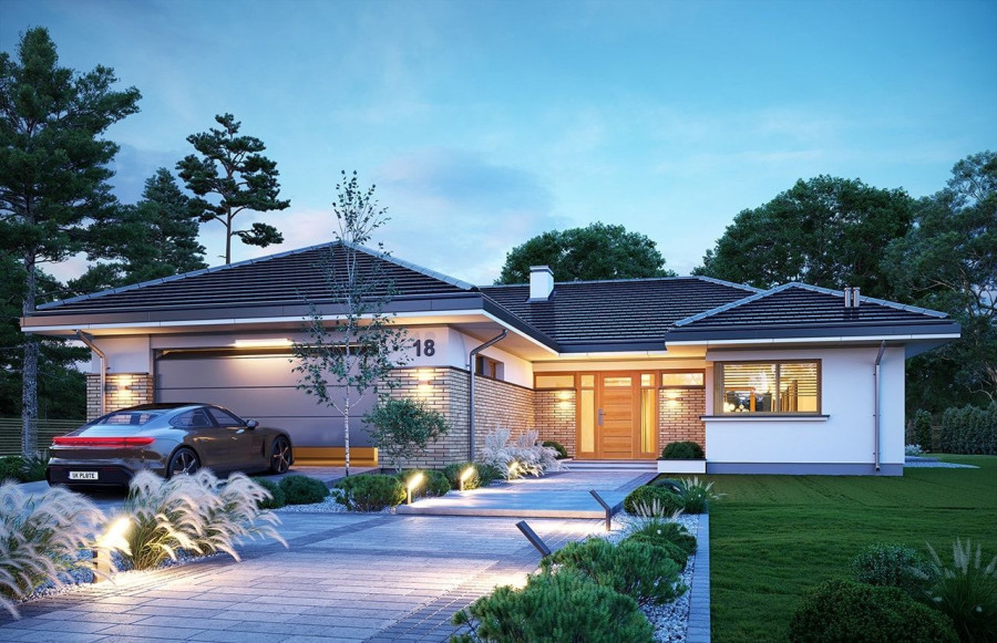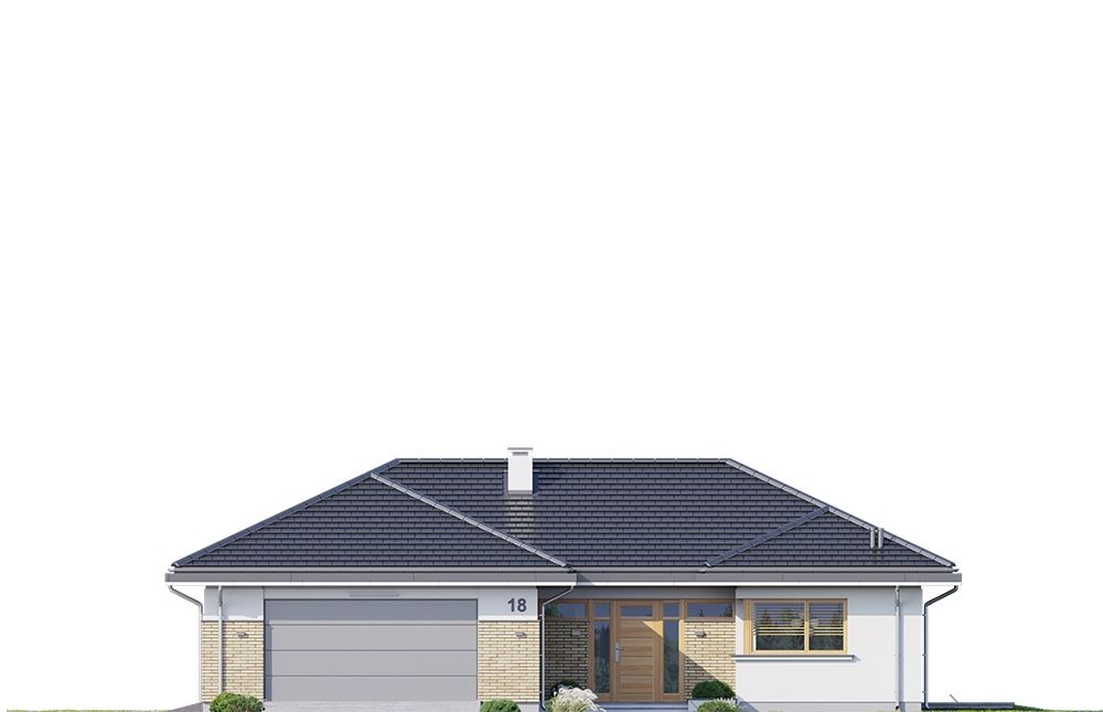 Projekt Jedyny B to budynek jednorodzinny, parterowy. Zbudowany na planie litery T, przykryty jest czterospadowym dachem. Powierzchnia użytkowa domu wynosi 145,63 m2 (kubatura 856 m3). Jedyny B może być wybudowany na działce o minimalnych wymiarach: 23,74 x 30,41. Zaprojektowany jest z myślą dla rodziny 4- 5-osobowej, która pragnie solidnego, murowanego domu. Projekt domu Jedyny B wyglądem nawiązuje do architektury domów z południowych stanów, ale w europejskim wydaniu. Dom Jedyny B zaprojektowano na planie litery T. Całość zwieńczona jest wielospadowym dachem o kącie nachylenia 25 stopni. Front budynku zdobi reprezentacyjne wejście. Do wnętrza dostajemy się przez schodki patio do podestu z szerokimi drzwiami i naświetlami. Tuż przy wejściu jest piękne okno kuchenne, a z drugiej strony elewacji wystający, szeroki garaż. Elewację od strony ogrody zdobią piękne, narożne przeszklenia, które łączą wnętrze z tarasem i ogrodem. Solidna ceglana ściana komina dodaje uroku elewacji i podkreśla jej charakter. Dom całkowicie otwiera się na zieleń łapiąc słońce i wprowadzając ogród do wnętrza. Głównym celem naszych projektantów podczas planowania tego wnętrza była zasada prostoty i bezkompromisowość. Nie ma tu miejsca na nieustawne pomieszczenia czy miniaturowych pokoików. Do domu wchodzimy przez duży, przeszklony przedsionek. Na lewo przechodzimy przez szatnię do kotłowni i dwustanowiskowego garażu. Do pięknej kuchni zaś możemy dostać się przez spiżarnię lub od strony jadalni. Przestrzeń dzienna w tym projekcie jest imponująca. Codzienne życie domowników będzie toczyło się w salonie połączonym z jadalnią i kuchnią. Duże przeszklenia dają możliwość obserwacji przyrody w ogrodzie w trakcie wspólnych śniadań czy wieczornych biesiad. Na środku salonu zaplanowano komplet wypoczynkowy składający się z kanap. Po bokach salonu jest ściana z przeznaczeniem na TV i jadalnia. Duża przestrzeń salonu potęguje otwarcie przestrzenne sufitu aż do wysokości dachu. Z części dziennej przechodzimy do prywatnej części domowników. Znaleźć w niej możemy: pokój ogólny, apartament rodziców, dwie sypialnie dla dzieci, dodatkowa łazienka oraz WC. W pokoju ogólnym można zaplanować kanapę lub szezlong, na którym przyjemnie będzie się relaksować. Sypialnia główna jest otwarta na ogród, posiada prywatną garderobę i łazienkę. Nad dużą częścią parteru mamy do dyspozycji strych, który można wykorzystać jako domowy magazyn. Dom mimo niewielkiej powierzchni jest niezwykle komfortowy i funkcjonalny. Gotowy projekt domu jednorodzinnego Jedyny B jest energooszczędny, a zastosowanie nowoczesnych materiałów budowlanych o wysokich parametrach pozwala na późniejsze, ekonomiczne użytkowanie. Optymalizacja bryły pozwoli na budowę domu zarówno w systemie gospodarczym jak i zleconym. Istnieje możliwość dostosowania projektu do standardu NF40. Projekt dostępny jest również w odbiciu lustrzanym.