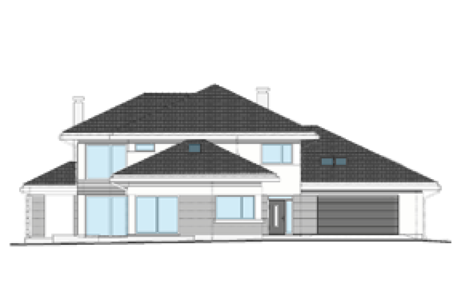 Wariant projektu z większym garażem, doprojektowaną piwnicą pod garażem, zmieniony układ pomieszczeń oraz słupki w oknach.
