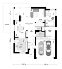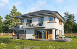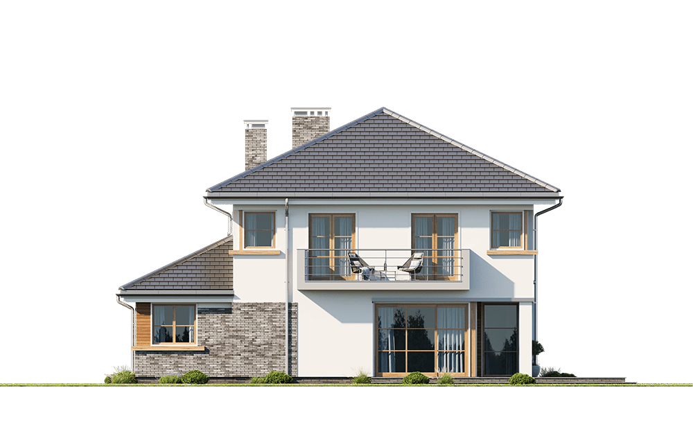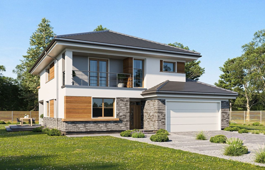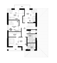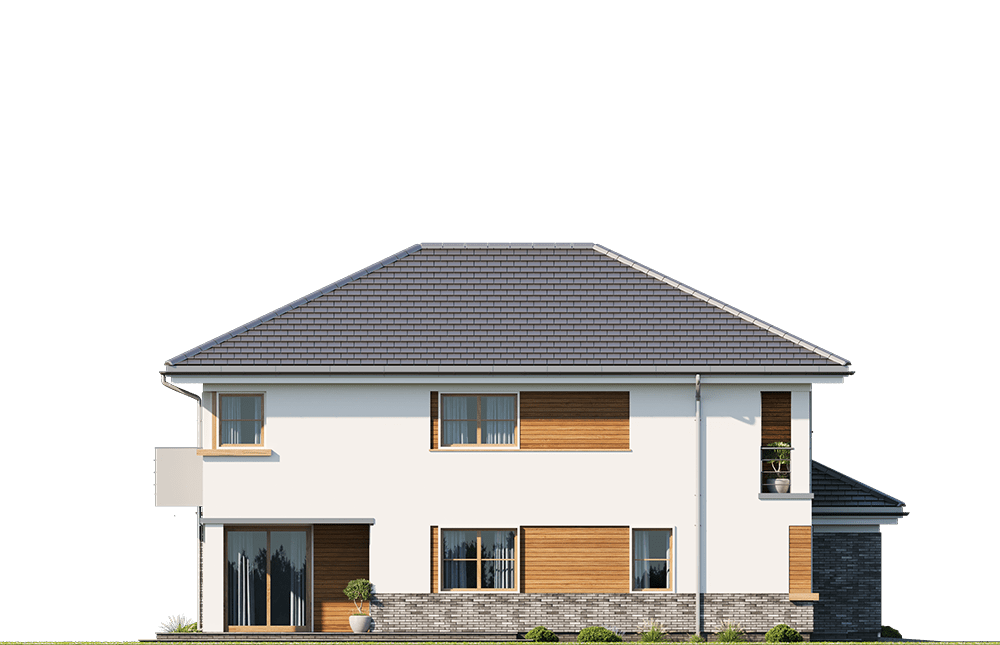 Wariant projektu z poszerzonym piętrem o 1 m zrównując je ze ścianą parteru, zlikwidowanym daszkiem nad wykuszem, wyprostowanym narożnikiem przy kuchni. Przesuniętym podcieniem przy salonie (powiększenie salonu). Skrócenie tarasu od strony ogrodowej i poszerzenie od strony bocznej. Zaprojektowanie okna narożnego w sypialni na piętrze, likwidacja okna bocznego. Poszerzenie balkonu o 1 m oraz przesunięcie drzwi balkonowych tak, aby zachować symetrię na elewacji tylnej. Wyrównanie powierzchni sypialni od strony tylnej Powiększenie pralni oraz zaprojektowanie drzwi z korytarza. Wymiary i układ łazienek i pralni tak jak w Kasjopea 7.